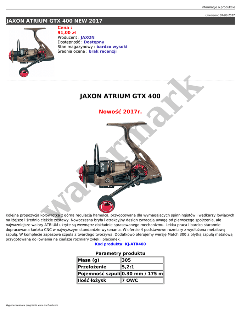 Informacje o produkcie Utworzono 07-03-2017 JAXON ATRIUM GTX 400 NEW 2017 Cena : 91,00 zł er m ar k Producent : JAXON Dostępność : Dostępny Stan magazynowy : bardzo wysoki Średnia ocena : brak recenzji JAXON ATRIUM GTX 400 w at Nowość 2017r. Kolejna propozycja kołowrotka z górną regulacją hamulca, przygotowana dla wymagających spinningistów i wędkarzy łowiących na lżejsze i średnio ciężkie zestawy. Nowoczesna bryła i atrakcyjny design zwracają uwagę od pierwszego spojrzenia, ale najważniejsze walory ATRIUM ukryte są wewnątrz dokładnie sprasowanego mechanizmu. Lekka praca i bardzo starannie dopracowana korbka CNC w najwyższym standardzie wykonania. W ofercie 4 podstawowe rozmiary z wydłużona metalową szpulą. W komplecie zapasowa szpula z twardego tworzywa. Dodatkowo oferujemy wersję Match 300 z płytką szpulą metalową przygotowaną do łowienia na cieńsze rozmiary żyłek i plecionek. Kod produktu: KJ-ATR400 Parametry produktu Masa (g) 305 Przełożenie 5,2:1 Pojemność szpuli 0.30 mm / 175 m Ilość łożysk Wygenerowano w programie www.oscGold.com 7 OWC er m ar k at w
