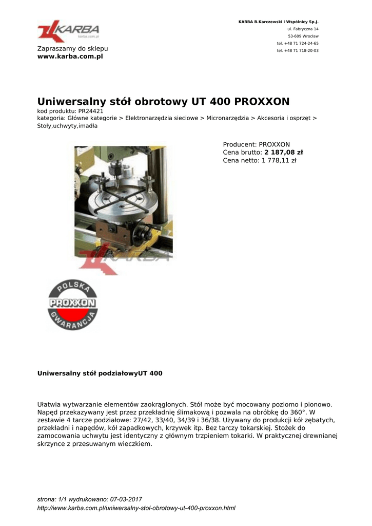 KARBA B.Karczewski i Wspólnicy Sp.J. ul. Fabryczna 14 53-609 Wrocław tel. +48 71 724-24-65 Zapraszamy do sklepu www.karba.com.pl tel. +48 71 718-20-03 Uniwersalny stół obrotowy UT 400 PROXXON kod produktu: PR24421 kategoria: Główne kategorie > Elektronarzędzia sieciowe > Micronarzędzia > Akcesoria i osprzęt > Stoły,uchwyty,imadła Producent: PROXXON Cena brutto: 2 187,08 zł Cena netto: 1 778,11 zł Uniwersalny stół podziałowyUT 400 Ułatwia wytwarzanie elementów zaokrąglonych. Stół może być mocowany poziomo i pionowo. Napęd przekazywany jest przez przekładnię ślimakową i pozwala na obróbkę do 360°. W zestawie 4 tarcze podziałowe: 27/42, 33/40, 34/39 i 36/38. Używany do produkcji kół zębatych, przekładni i napędów, kół zapadkowych, krzywek itp. Bez tarczy tokarskiej. Stożek do zamocowania uchwytu jest identyczny z głównym trzpieniem tokarki. W praktycznej drewnianej skrzynce z przesuwanym wieczkiem. strona: 1/1 wydrukowano: 07-03-2017 http://www.karba.com.pl/uniwersalny-stol-obrotowy-ut-400-proxxon.html