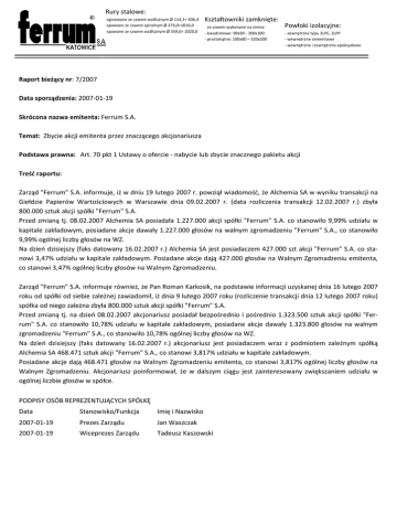 Rury stalowe: ‐zgrzewane ze szwem wzdłużnym Ø 114,3÷ 406,4 ‐spawane ze szwem spiralnym Ø 273,0÷1016,0 ‐spawane ze szwem wzdłużnym Ø 559,0÷ 2020,0 Kształtowniki zamknięte: ‐ ze szwem wykonane na zimno ‐ kwadratowe: 90x90 ‐ 300x300 ‐ prostokątne: 100x80 – 320x200 Powłoki izolacyjne: ‐ zewnętrzne typu 3LPE, 3LPP ‐ wewnętrzne cementowe ‐ wewnętrzne i zewnętrzne epoksydowe Raport bieżący nr: 7/2007 Data sporządzenia: 2007‐01‐19 Skrócona nazwa emitenta: Ferrum S.A. Temat: Zbycie akcji emitenta przez znaczącego akcjonariusza Podstawa prawna: Art. 70 pkt 1 Ustawy o ofercie ‐ nabycie lub zbycie znacznego pakietu akcji Treść raportu: Zarząd "Ferrum" S.A. informuje, iż w dniu 19 lutego 2007 r. powziął wiadomość, że Alchemia SA w wyniku transakcji na Giełdzie Papierów Wartościowych w Warszawie dnia 09.02.2007 r. (data rozliczenia transakcji 12.02.2007 r.) zbyła 800.000 sztuk akcji spółki "Ferrum" S.A. Przed zmianą tj. 08.02.2007 Alchemia SA posiadała 1.227.000 akcji spółki "Ferrum" S.A. co stanowiło 9,99% udziału w kapitale zakładowym, posiadane akcje dawały 1.227.000 głosów na walnym zgromadzeniu "Ferrum" S.A., co stanowiło 9,99% ogólnej liczby głosów na WZ. Na dzień dzisiejszy (faks datowany 16.02.2007 r.) Alchemia SA jest posiadaczem 427.000 szt akcji "Ferrum" S.A. co sta‐ nowi 3,47% udziału w kapitale zakładowym. Posiadane akcje dają 427.000 głosów na Walnym Zgromadzeniu emitenta, co stanowi 3,47% ogólnej liczby głosów na Walnym Zgromadzeniu. Zarząd "Ferrum" S.A. informuje również, że Pan Roman Karkosik, na podstawie informacji uzyskanej dnia 16 lutego 2007 roku od spółki od siebie zależnej zawiadomił, iż dnia 9 lutego 2007 roku (rozliczenie transakcji dnia 12 lutego 2007 roku) spółka od niego zależna zbyła 800.000 sztuk akcji spółki "Ferrum" S.A. Przed zmianą tj. na dzień 08.02.2007 akcjonariusz posiadał bezpośrednio i pośrednio 1.323.500 sztuk akcji spółki "Fer‐ rum" S.A. co stanowiło 10,78% udziału w kapitale zakładowym, posiadane akcje dawały 1.323.800 głosów na walnym zgromadzeniu "Ferrum" S.A., co stanowiło 10,78% ogólnej liczby głosów na WZ. Na dzień dzisiejszy (faks datowany 16.02.2007 r.) akcjonariusz jest posiadaczem wraz z podmiotem zależnym spółką Alchemia SA 468.471 sztuk akcji "Ferrum" S.A., co stanowi 3,817% udziału w kapitale zakładowym. Posiadane akcje dają 468.471 głosów na Walnym Zgromadzeniu emitenta, co stanowi 3,817% ogólnej liczby głosów na Walnym Zgromadzeniu. Akcjonariusz poinformował, że w dalszym ciągu jest zainteresowany zwiększaniem udziału w ogólnej liczbie głosów w spółce. PODPISY OSÓB REPREZENTUJĄCYCH SPÓŁKĘ Data Stanowisko/Funkcja Imię i Nazwisko 2007‐01‐19 Prezes Zarządu Jan Waszczak 2007‐01‐19 Wiceprezes Zarządu Tadeusz Kaszowski
