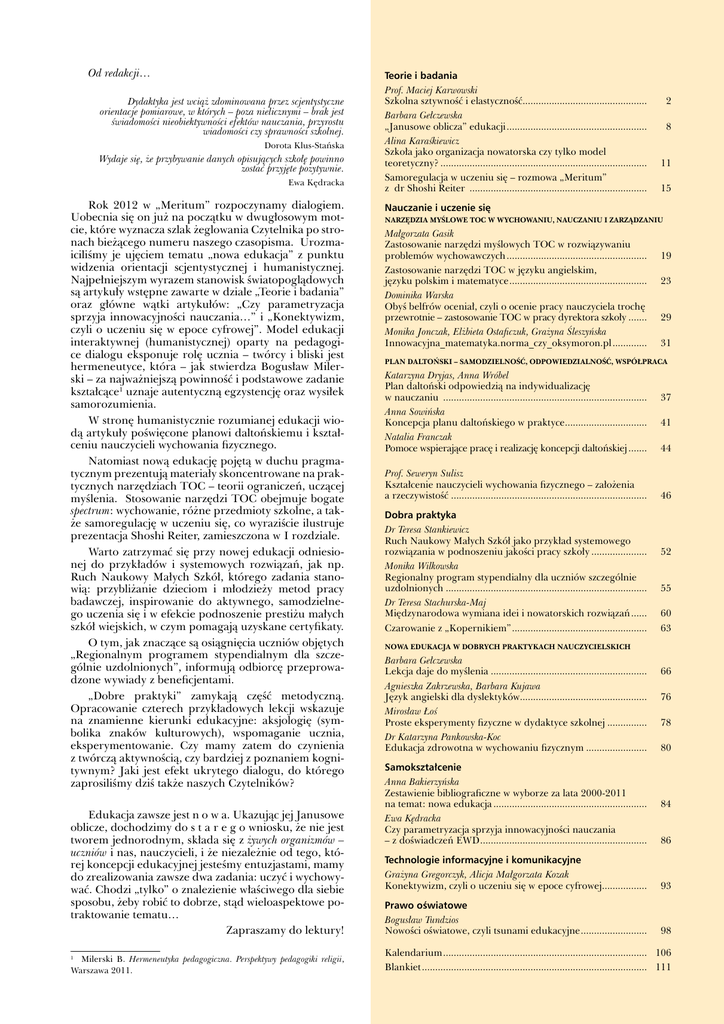 Od redakcji… Dydaktyka jest wciąż zdominowana przez scjentystyczne orientacje pomiarowe, w których – poza nielicznymi – brak jest świadomości nieobiektywności efektów nauczania, przyrostu wiadomości czy sprawności szkolnej. Dorota Klus-Stańska Wydaje się, że przybywanie danych opisujących szkołę powinno zostać przyjęte pozytywnie. Ewa Kędracka Rok 2012 w „Meritum” rozpoczynamy dialogiem. Uobecnia się on już na początku w dwugłosowym motcie, które wyznacza szlak żeglowania Czytelnika po stronach bieżącego numeru naszego czasopisma. Urozmaiciliśmy je ujęciem tematu „nowa edukacja” z punktu widzenia orientacji scjentystycznej i humanistycznej. Najpełniejszym wyrazem stanowisk światopoglądowych są artykuły wstępne zawarte w dziale „Teorie i badania” oraz główne wątki artykułów: „Czy parametryzacja sprzyja innowacyjności nauczania…” i „Konektywizm, czyli o uczeniu się w epoce cyfrowej”. Model edukacji interaktywnej (humanistycznej) oparty na pedagogice dialogu eksponuje rolę ucznia – twórcy i bliski jest hermeneutyce, która – jak stwierdza Bogusław Milerski – za najważniejszą powinność i podstawowe zadanie kształcące1 uznaje autentyczną egzystencję oraz wysiłek samorozumienia. W stronę humanistycznie rozumianej edukacji wiodą artykuły poświęcone planowi daltońskiemu i kształceniu nauczycieli wychowania fizycznego. Natomiast nową edukację pojętą w duchu pragmatycznym prezentują materiały skoncentrowane na praktycznych narzędziach TOC – teorii ograniczeń, uczącej myślenia. Stosowanie narzędzi TOC obejmuje bogate spectrum: wychowanie, różne przedmioty szkolne, a także samoregulację w uczeniu się, co wyraziście ilustruje prezentacja Shoshi Reiter, zamieszczona w I rozdziale. Warto zatrzymać się przy nowej edukacji odniesionej do przykładów i systemowych rozwiązań, jak np. Ruch Naukowy Małych Szkół, którego zadania stanowią: przybliżanie dzieciom i młodzieży metod pracy badawczej, inspirowanie do aktywnego, samodzielnego uczenia się i w efekcie podnoszenie prestiżu małych szkół wiejskich, w czym pomagają uzyskane certyfikaty. O tym, jak znaczące są osiągnięcia uczniów objętych „Regionalnym programem stypendialnym dla szczególnie uzdolnionych”, informują odbiorcę przeprowadzone wywiady z beneficjentami. „Dobre praktyki” zamykają część metodyczną. Opracowanie czterech przykładowych lekcji wskazuje na znamienne kierunki edukacyjne: aksjologię (symbolika znaków kulturowych), wspomaganie ucznia, eksperymentowanie. Czy mamy zatem do czynienia z twórczą aktywnością, czy bardziej z poznaniem kognitywnym? Jaki jest efekt ukrytego dialogu, do którego zaprosiliśmy dziś także naszych Czytelników? Edukacja zawsze jest n o w a. Ukazując jej Janusowe oblicze, dochodzimy do s t a r e g o wniosku, że nie jest tworem jednorodnym, składa się z żywych organizmów – uczniów i nas, nauczycieli, i że niezależnie od tego, której koncepcji edukacyjnej jesteśmy entuzjastami, mamy do zrealizowania zawsze dwa zadania: uczyć i wychowywać. Chodzi „tylko” o znalezienie właściwego dla siebie sposobu, żeby robić to dobrze, stąd wieloaspektowe potraktowanie tematu… Zapraszamy do lektury! Milerski B. Hermeneutyka pedagogiczna. Perspektywy pedagogiki religii, Warszawa 2011. 1 Teorie i badania Prof. Maciej Karwowski Szkolna sztywność i elastyczność................................................ 2 Barbara Gełczewska „Janusowe oblicza” edukacji...................................................... 8 Alina Karaśkiewicz Szkoła jako organizacja nowatorska czy tylko model teoretyczny?............................................................................... 11 Samoregulacja w uczeniu się – rozmowa „Meritum” z dr Shoshi Reiter .................................................................... 15 Nauczanie i uczenie się Narzędzia myślowe TOC w wychowaniu, nauczaniu i zarządzaniu Małgorzata Gasik Zastosowanie narzędzi myślowych TOC w rozwiązywaniu problemów wychowawczych...................................................... 19 Zastosowanie narzędzi TOC w języku angielskim, języku polskim i matematyce..................................................... 23 Dominika Warska Obyś belfrów oceniał, czyli o ocenie pracy nauczyciela trochę przewrotnie – zastosowanie TOC w pracy dyrektora szkoły........ 29 Monika Jonczak, Elżbieta Ostaficzuk, Grażyna Śleszyńska Innowacyjna_matematyka.norma_czy_oksymoron.pl.............. 31 Plan daltoński – SAMODZIELNOŚĆ, ODPOWIEDZIALNOŚĆ, WSPÓŁPRACA Katarzyna Dryjas, Anna Wróbel Plan daltoński odpowiedzią na indywidualizację w nauczaniu .............................................................................. 37 Anna Sowińska Koncepcja planu daltońskiego w praktyce................................ 41 Natalia Franczak Pomoce wspierające pracę i realizację koncepcji daltońskiej........ 44 Prof. Seweryn Sulisz Kształcenie nauczycieli wychowania fizycznego – założenia a rzeczywistość........................................................................... 46 Dobra praktyka Dr Teresa Stankiewicz Ruch Naukowy Małych Szkół jako przykład systemowego rozwiązania w podnoszeniu jakości pracy szkoły...................... 52 Monika Wilkowska Regionalny program stypendialny dla uczniów szczególnie uzdolnionych............................................................................. 55 Dr Teresa Stachurska-Maj Międzynarodowa wymiana idei i nowatorskich rozwiązań....... 60 Czarowanie z „Kopernikiem”.................................................... 63 Nowa edukacja w dobrych praktykach nauczycielskich Barbara Gełczewska Lekcja daje do myślenia............................................................ 66 Agnieszka Zakrzewska, Barbara Kujawa Język angielski dla dyslektyków................................................ 76 Mirosław Łoś 
