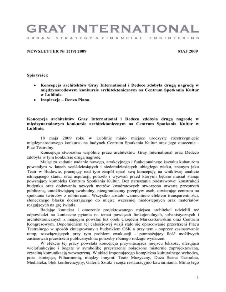 NEWSLETTER Nr 2(19) 2009 MAJ 2009 Spis treści: • • Koncepcja architektów Gray International i Dedeco zdobyła drugą nagrodę w międzynarodowym konkursie architektonicznym na Centrum Spotkania Kultur w Lublinie. Inspiracje – Renzo Piano. Koncepcja architektów Gray International i Dedeco zdobyła drugą nagrodę w międzynarodowym konkursie architektonicznym na Centrum Spotkania Kultur w Lublinie. 18 maja 2009 roku w Lublinie miało miejsce uroczyste rozstrzygnięcie międzynarodowego konkursu na budynek Centrum Spotkania Kultur oraz jego otoczenie Plac Teatralny. Koncepcja stworzona wspólnie przez architektów Gray International oraz Dedeco zdobyła w tym konkursie drugą nagrodę. Mając za zadanie nadanie nowego, atrakcyjnego i funkcjonalnego kształtu kubaturom powstałym w latach sześćdziesiątych i siedemdziesiątych ubiegłego wieku, znanym jako Teatr w Budowie, pracujący nad tym zespół oparł swą koncepcję na wnikliwej analizie istniejącego stanu, oraz aspiracji, potrzeb i wyzwań przed którymi będzie musiał stanąć powstający kompleks Centrum Spotkania Kultur. Bez naruszania podstawowej konstrukcji budynku oraz dodawania nowych metrów kwadratowych stworzono otwartą przestrzeń publiczną, umożliwiającą swobodny, nieograniczony przepływ osób, otwierając centrum na spotkania twórców z odbiorcami. Wszystko zostało wzmocnione efektem transparentności, słonecznego blasku docierającego do miejsc wcześniej niedostępnych oraz materiałów reagujących na grę światła. Badając kontekst i otoczenie projektowanego miejsca architekci udzielili też odpowiedzi na konieczne pytania na temat powiązań funkcjonalnych, urbanistycznych i architektonicznych z mającym powstać tuż obok Urzędem Marszałkowskim oraz Centrum Kongresowym. Dopełnieniem tej całościowej wizji stało się opracowanie przestrzeni Placu Teatralnego w sposób zintegrowany z budynkiem CSK a przy tym - poprzez zastosowanie ramp, rozwiązujących przy tym problem ewakuacji - pomnażający ilość możliwych zastosowań przestrzeni publicznych na potrzeby różnego rodzaju wydarzeń. W efekcie tej pracy powstała koncepcja przywracająca miejscu lekkość, oferująca wielofunkcyjne i bogate w symbolikę przestrzenie połączone misternie zaprojektowaną, czytelną komunikacją wewnętrzną. W skład imponującego kompleksu kulturalnego wchodzą, poza istniejącą Filharmonią, między innymi: Teatr Muzyczny, Duża Scena Teatralna, Mediateka, blok konferencyjny, Galeria Sztuki i część restauracyjno-kawiarniania. Mimo tego 1 bogatego programu funkcjonalnego obiekt jest lekki, świetlisty, otwarty do środka i na zewnątrz, zintegrowany z placami publicznymi i bezpośrednim otoczeniem. Według opinii Sądu konkursowego „Nagrodę przyznano za stworzoną formę i atmosferę przestrzeni publicznej. Otwarta, zmienna forma budynku, jej wieloprzestrzenność, ściana jako projektor multimedialny i współdziałanie z atrakcyjnie ukształtowaną funkcją placu, jest dobrym przykładem współczesnego tworzenia "popkulturowego" miejsca spotkań w przestrzeni miasta.” Inspiracje – Renzo Piano. Renzo Piano to jeden z wybitnych architektów, którego ogromny talent łączy się z zaangażowaniem, poczuciem odpowiedzialności i skromnością. Poniższe fragmenty wywiadów dają tego piękny przykład. „Przede wszystkim architektura jest służbą w najdosłowniejszym tego słowa znaczeniu. Jest też sztuką potencjalnie niebezpieczną, ponieważ narzuconą społeczeństwu. Można odłożyć książkę, można nie słuchać złej muzyki, ale nie można nie widzieć brzydkiego bloku przed swoim oknem. Architektura może wprowadzić brzydotę do całego otoczenia, nie dając żadnej szansy ucieczki przed nią.” Jedno z pytań nawiązujące do tego, co Renzo Piano powiedział odbierając w 1998 roku nagrodę Pritzkera o architektach jako odkrywcach brzmiało: ”Czy podejmujesz jakąś myśl lub linę i przepracowujesz ją, czy też poszukujesz zawsze czegoś nowego?” Odpowiedź architekta brzmiała: „Myślę, że ważne jest by zauważać różnicę między stylem a spójnością. Uwielbiam rozmawiać o spójności. Rozmawiając jednak o stylu, zaczynam być podejrzliwy. W spójności chodzi o doświadczenie, wykorzystywanie tego, czego się nauczyłeś i stosowania tego. Nie chodzi w tym o bycie rozpoznawalnym. Niemniej architektura musi być odkrywaniem. Każde miejsce jest inne, każdy klient jest inny, każde społeczeństwo jest inne. Kulturowo, historycznie, psychologicznie, antropologicznie i 2 topograficznie każda praca jest inna. Ryzyko architekta polega więc na tym, że odciska na projekcie swoją pieczęć zanim jeszcze zdoła zrozumieć rzeczywistość przynależną danemu miejscu. Nigdy nie podejmuję nowej pracy bez wcześniejszego udania się na miejsce, bez próby zrozumienia, doświadczenia podstawowych emocji. Bo o to w tym wszystkim chodzi – o budowanie emocji. Staram się pojąć czym jest prawdziwa natura miejsca, jaki jest jego kontekst. Moim celem niekoniecznie jest integracja z kontekstem. Czasem architektura nie powinna być z nim zintegrowana, ale powinna stanowić weń wkład. 3