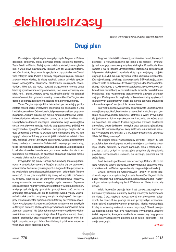 Łatwiej jest kogoś ocenić, trudniej czasem docenić. Drugi plan Do miejsca największych energetycznych Targów w Polsce docieram taksówką, którą prowadzi młody elektronik teatralny. Teatr Polski w Bielsku Białej słynie z wielu spektakli, które oglądałem, a więc łatwo nawiązujemy kontakt. Zna tak wielu dyrektorów, aktorów i sztuk, że ponownie spoglądam czy potrafię rozróżniać wiek młodych ludzi. Pytam o powody rezygnacji z zajęcia, przecież znawcy teatru wiedzą, że dobry spektakl zależy od wielu specjalistów: scenografów, akustyków, elektroników sterujących oświetleniem. Niby tak, ale coraz bardziej urządzeniami sterują coraz bardziej wyrafinowane oprogramowania, traci urok techniczny wysiłek, no i… płaca. Aktorzy, gdyby na „drugim planie” nie dorabiali reklamówkami, też być może woleliby dowozić klientów Targów. Ale dodaje, że oprócz taksówki ma jeszcze kilka dorywczych prac. Teren Targów zajmuje kilka hektarów i po raz kolejny pobity zostaje rekord liczby wystawców (pojawiają się specjaliści z Chin i Indii) i uczestników. Odnowiony hotel prezentuje całkiem przyzwoity poziom. Alejkami przemykają piękne, smukłe hostessy we wszelkich odcieniach sukienek, włosów i butów, z szarfami firm i bez nich. Energetyka to domena mężczyzn i chłopaków, więc wielu ogląda się za tym pięknem trenując kark do zaglądania nieco później we wnętrze turbin, agregatów, rozdzielni i trenując zmysł dotyku – bo tu dają potrzymać pierwszy na świecie kabel na napięcie 500 kV, tam wygiąć uchwyt oplotowy, pomacać jakiś materiał na odzież roboczą, nacisnąć „knefel”, by czymś zasterować. Częstują hektolitrami kawy i herbaty, a ponieważ w Bielsku dość często pogoda w kratkę, to idą też inne napoje rozgrzewające lub chłodzące. Jest gdzie zjeść i pod wieczór nie bardzo wiadomo, co komu zaszkodziło, ale to już tak bardzo nie zaskakuje, na szczęście skala tego zjawiska maleje – zresztą blisko szpital wojewódzki. Przyglądam się pracy Komisji Konkursowej, która regulaminowo w przeddzień otwarcia Tragów przebija się do stanowisk uczestników Konkursu rywalizujących o bogate trofea przyznawane w tak wielu specjalistycznych kategoriach i odcieniach. Trudno uwierzyć, że na tym wszystkim się znają: od wtyczki, żaróweczki, drucika, kabelka aż po ogromne wielozadaniowe maszyny, oprogramowania procesów energetycznych przemian. Zapewne specjalistyczne nagrody omówione zostaną w wielu publikacjach, a więc przysłuchuję się dyskretnie dyskusji, komu dać puchar za aranżację stanowiska. Jak oni to dostrzegli wśród tysięcy wigwamów i budek pawilon urządzony w stylu lat chyba pięćdziesiątych: przy wejściu saturator z parasolem i bufetową; bar mleczny oświetlony wycofywanymi z obrotu żarówkami wiszącymi na zwykłych sufitowych drutach; słyszę gdzieś przytłumione zamówienie typu „lorneta i galareta”. Na ścianach samokrytyczny wydźwięk wiekowości firmy, o czym przypominają stare fotografie z narad, obrad, parad i pochodów oraz rodzajowe obrazki spódniczek mini, kolejek, przywiązywanych łańcuchami talerzy i łyżek oraz współzawodnictwa pracy. Nagroda pewna. strona 776 Targowe dziesiątki konferencji, seminariów, narad, firmowych promocji – z frekwencją różnie. Na jednej z sal komplet – dyskutują nad kondycją zawodową inżyniera elektryka. Przed budynkiem kamera i na tle banera „Przejrzystość kształcenia zawodowego inżynierów elektryków”, wywiady dotyczące inicjatywy projektu unijnego ELEVET. Na sali ożywiona krótka dyskusja reprezentantów największego polskiego stowarzyszenia SEP wskazuje, że jest jeszcze wiele do zrobienia – trzeba uwzględnić idee Procesu bolońskiego mówiącego o rozdzieleniu kształcenia zawodowego od potwierdzania kwalifikacji w pozaszkolnych formach dokształcania. Przyświeca idea wzajemnego poszanowania zawodu w krajach unijnych. Padają wesołe przykłady problemów choćby językowych i kulturowych zatrudnianych osób. Do końca czerwca przyszłego roku można wpisać swoje opinie i komentarze. Tak wielka liczba wystawców spowodowała ukształtowanie nowej formy spotkań, bankietów, a nawet bali w okolicznych górskich miejscowościach: Szczyrku, Ustroniu i Wisły. Przyglądam się jednemu z nich w wysokogórskiej karczmie, do której trudno dojechać, ale jeszcze trudniej wyjechać. Powód: serdeczna atmosfera, dobre jedzenie i muzyka oraz szczypta góralskiego humoru: Co podarował góral swej małżonce na Jubileusz 45-lecia? Wycieczkę do Australii. Co jej, zatem podaruje na Jubileusz 50-lecia? Bilet powrotny! Na drugim planie wszechobecny dyrektor Targów: tu coś przecieka, tam nie dopływa, w jednym miejscu coś trzeba otworzyć, podać mikrofon, w innym zamknąć, albo i zatrzasnąć – patrząc z boku „młyn” – na szczęście przydaje się długoletnia praktyka, serdeczność i uśmiech, do każdego, przecież za rok znów Targi. Fakt, że za drugoplanowe role też rozdają Oskary, ale to odległa Ameryka. Wiemy przecież, że dobry spektakl zależy od wielu czynników – tu w Bielsku sprawdza się magia miejsca i tradycji. Chwila powrotu do wrześniowych Targów w porze październikowych uroczystości ogłoszenia laureatów Nagród Nobla budzi refleksje nad innowacyjnością, konkurencyjnością i naszymi gospodarczymi osiągnięciami. Widzimy to różnie, trudno się dziwić. Wielu laureatów pracuje latami, aż uzyska zaszczytne noblowskie wyróżnienie, niektórzy zostają wiecznymi kandydatami do niego. Coraz szybciej trzeba uporać się z wyborem najlepszych, bo coraz dłużej pracuje się nad przejrzystym uzasadnieniem odkryć skomplikowanych procesów. Media wprowadzają trochę sztucznej rywalizacji, – komu przyznają? Nawet pokojowa nagroda Nobla musi być naświetlona i wyjaśniona. Złożony świat, asymetrie, kategorie myślenia – miesza się drugoplanowość z pierws