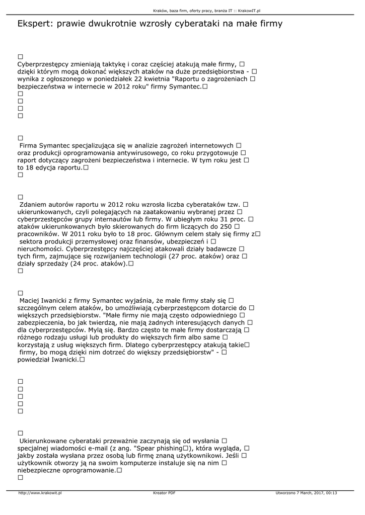 Kraków, baza firm, oferty pracy, branża IT :: KrakowIT.pl Ekspert: prawie dwukrotnie wzrosły cyberataki na małe firmy Cyberprzestępcy zmieniają taktykę i coraz częściej atakują małe firmy, dzięki którym mogą dokonać większych ataków na duże przedsiębiorstwa - wynika z ogłoszonego w poniedziałek 22 kwietnia "Raportu o zagrożeniach bezpieczeństwa w internecie w 2012 roku" firmy Symantec. Firma Symantec specjalizująca się w analizie zagrożeń internetowych oraz produkcji oprogramowania antywirusowego, co roku przygotowuje raport dotyczący zagrożeni bezpieczeństwa i internecie. W tym roku jest to 18 edycja raportu. Zdaniem autorów raportu w 2012 roku wzrosła liczba cyberataków tzw. ukierunkowanych, czyli polegających na zaatakowaniu wybranej przez cyberprzestępców grupy internautów lub firmy. W ubiegłym roku 31 proc. ataków ukierunkowanych było skierowanych do firm liczących do 250 pracowników. W 2011 roku było to 18 proc. Głównym celem stały się firmy z sektora produkcji przemysłowej oraz finansów, ubezpieczeń i nieruchomości. Cyberprzestępcy najczęściej atakowali działy badawcze tych firm, zajmujące się rozwijaniem technologii (27 proc. ataków) oraz działy sprzedaży (24 proc. ataków). Maciej Iwanicki z firmy Symantec wyjaśnia, że małe firmy stały się szczególnym celem ataków, bo umożliwiają cyberprzestępcom dotarcie do większych przedsiębiorstw. "Małe firmy nie mają często odpowiedniego zabezpieczenia, bo jak twierdzą, nie mają żadnych interesujących danych dla cyberprzestępców. Mylą się. Bardzo często te małe firmy dostarczają różnego rodzaju usługi lub produkty do większych firm albo same korzystają z usług większych firm. Dlatego cyberprzestępcy atakują takie firmy, bo mogą dzięki nim dotrzeć do większy przedsiębiorstw" - powiedział Iwanicki. Ukierunkowane cyberataki przeważnie zaczynają się od wysłania specjalnej wiadomości e-mail (z ang. "Spear phishing), która wygląda, jakby została wysłana przez osobą lub firmę znaną użytkownikowi. Jeśli użytkownik otworzy ją na swoim komputerze instaluje się na nim niebezpieczne oprogramowanie. http://www.krakowit.pl Kreator PDF Utworzono 7 March, 2017, 00:13 Kraków, baza firm, oferty pracy, branża IT :: KrakowIT.pl Jak wynika z raportu, w 2012 roku pojawił się nowy typ ataków ukierunkowanych, określany w języku angielskim, jako "watering hole". Polega ona na tym, że przestępcy "przyczajają się" na stronie internetowej często odwiedzanej przez użytkowników, którzy interesują cyberprzestępców. W momencie, kiedy użytkownik odwiedzi taką stronę internetową na jego komputerze instalowane są specjalny programy, które umożliwią przeprowadzenie ataku na inne komputery. W 2012 roku atak ukierunkowany po raz pierwszy przeprowadziła grupa cyberprzestępców o nazwie "Elderwood Gang", który w ciągu jednego dnia z powodzeniem zainfekował komputery 500 firm. Metoda okazała się skuteczna i inne grupy przestępcze zaczęły naśladować tego typu technikę. M.in. w ten sposób atakowano producentów programów dla system operacyjnego iOS przeznaczonego na komputery firmy Apple. Cyberprzestępcy wykorzystują także legalne strony internetowe do przeprowadzania ataków. Według raportu 61 proc. stron internetowych działających legalnie miała zainstalowane złośliwe oprogramowanie, które infekowało komputery użytkowników odwiedzających daną stronę. Często cyberprzestępcy wykupują reklamy różnych firm czy usług, które umieszczają na legalnej stronie internetowej. Wystarczy, że odwiedzimy taką stronę a ukryte w reklamach oprogramowanie zaatakuje nasz komputer. Użytkownicy nie są jednak bezradni. "Możemy się przed tego typu atakami zabezpieczyć na trzy sposoby, po pierwsze aktualizować nasz system operacyjny, po drugie aktualizować nasze przeglądarki internetowe i po trzecie należy korzystać z oprogramowania antywirusowego o rozszerzonej ochronie. Podstawowe oprogramowanie nie poradzi sobie z tym zagrożeniem." - zaznaczył Maciej Iwanicki. Z raportu wynika, także, że Polska jest na 7 miejscu na świecie pod względem liczby botów, czyli sieci komputerów zwykłych użytkowników internetu będących pod zdalną kontrolą cyberprzestępców i wykorzystywanych do różnego rodzaju ataków. Dzięki sieciom botnet cyberprzestępcy mogą przeprowadzać ataki ukierunkowane, rozsyłać spam czy blokować strony różnych firm czy instytucji. W 2012 roku wzrosła o 58 proc. ilość złośliwego oprogramowania, które ma atakować urządzenia mobilne(smartfony, tablety). 32 proc. wszystkich ataków na urządzenia mobilne dotyczyła prób kradzieży informacji, takich http://www.krakowit.pl Kreator PDF Utworzono 7 March, 2017, 00:13 Kraków, baza firm, oferty pracy, branża IT :: KrakowIT.pl jak adresy poczty elektronicznej oraz numery telefonów. Eksperci podkreślają, że przed zagrożeniami związanymi z cyberatakami i cyberszpiegostwem uchronią nas nie tylko programy antywirusowe, ale także edukacja. Czyli poszerzanie swojej wiedzy dotyczącej nowych form cyberataków np. przez regularne czytanie blogów prowadzonych przez ekspertów od bezpieczeństwa w internecie, czy stron internetowych zajmujących się ochroną przed zagrożeniami w sieci. PAP - Nauka w Polsce http://www.krakowit.pl Kreator PDF Utworzono 7 March, 2017, 00:13
