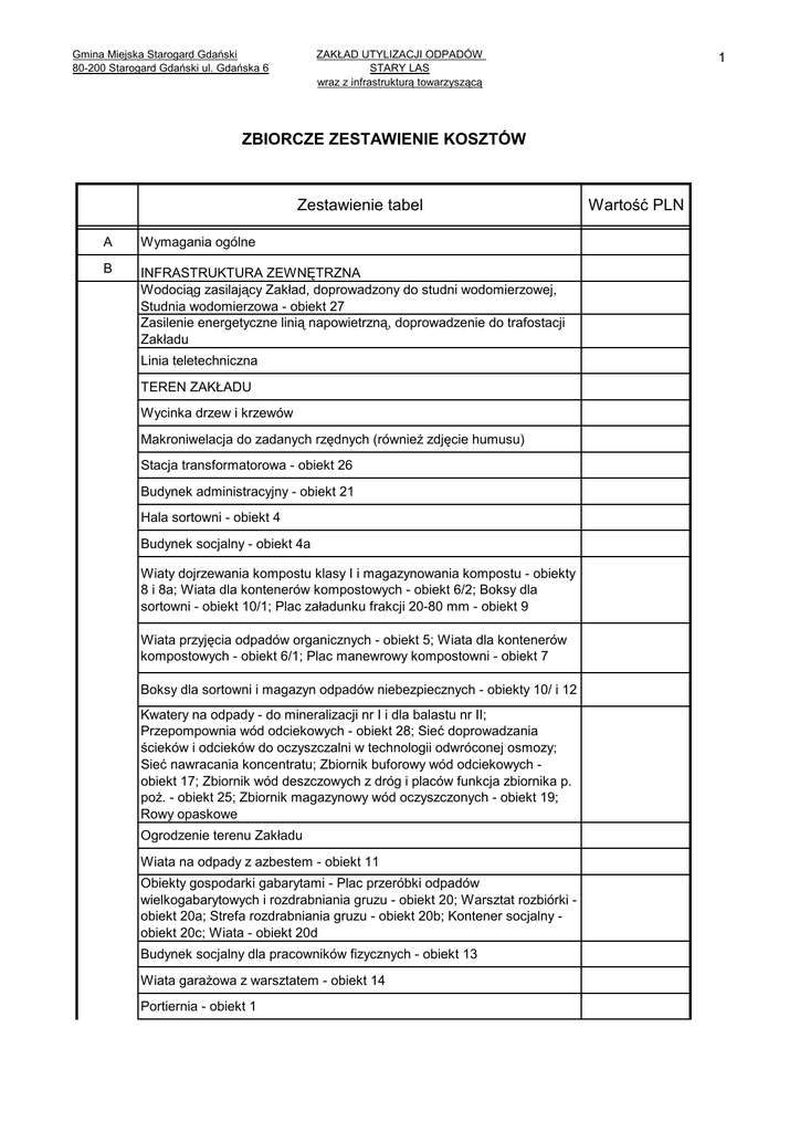 Gmina Miejska Starogard Gdański 80-200 Starogard Gdański ul. Gdańska 6 ZAKŁAD UTYLIZACJI ODPADÓW STARY LAS wraz z infrastrukturą towarzyszącą 1 ZBIORCZE ZESTAWIENIE KOSZTÓW Zestawienie tabel A Wymagania ogólne B INFRASTRUKTURA ZEWNĘTRZNA Wodociąg zasilający Zakład, doprowadzony do studni wodomierzowej, Studnia wodomierzowa - obiekt 27 Zasilenie energetyczne linią napowietrzną, doprowadzenie do trafostacji Zakładu Linia teletechniczna TEREN ZAKŁADU Wycinka drzew i krzewów Makroniwelacja do zadanych rzędnych (równieŜ zdjęcie humusu) Stacja transformatorowa - obiekt 26 Budynek administracyjny - obiekt 21 Hala sortowni - obiekt 4 Budynek socjalny - obiekt 4a Wiaty dojrzewania kompostu klasy I i magazynowania kompostu - obiekty 8 i 8a; Wiata dla kontenerów kompostowych - obiekt 6/2; Boksy dla sortowni - obiekt 10/1; Plac załadunku frakcji 20-80 mm - obiekt 9 Wiata przyjęcia odpadów organicznych - obiekt 5; Wiata dla kontenerów kompostowych - obiekt 6/1; Plac manewrowy kompostowni - obiekt 7 Boksy dla sortowni i magazyn odpadów niebezpiecznych - obiekty 10/ i 12 Kwatery na odpady - do mineralizacji nr I i dla balastu nr II; Przepompownia wód odciekowych - obiekt 28; Sieć doprowadzania ścieków i odcieków do oczyszczalni w technologii odwróconej osmozy; Sieć nawracania koncentratu; Zbiornik buforowy wód odciekowych obiekt 17; Zbiornik wód deszczowych z dróg i placów funkcja zbiornika p. poŜ. - obiekt 25; Zbiornik magazynowy wód oczyszczonych - obiekt 19; Rowy opaskowe Ogrodzenie terenu Zakładu Wiata na odpady z azbestem - obiekt 11 Obiekty gospodarki gabarytami - Plac przeróbki odpadów wielkogabarytowych i rozdrabniania gruzu - obiekt 20; Warsztat rozbiórki obiekt 20a; Strefa rozdrabniania gruzu - obiekt 20b; Kontener socjalny obiekt 20c; Wiata - obiekt 20d Budynek socjalny dla pracowników fizycznych - obiekt 13 Wiata garaŜowa z warsztatem - obiekt 14 Portiernia - obiekt 1 Wartość PLN Gmina Miejska Starogard Gdański 80-200 Starogard Gdański ul. Gdańska 6 ZAKŁAD UTYLIZACJI ODPADÓW STARY LAS wraz z infrastrukturą towarzyszącą Sieć wodociągowa Kanalizacja deszczowa Kanalizacja sanitarna wraz z szambem - obiekt 24 Kanalizacja technologiczna ze zbiornikiem wód procesowych z kontenerów kompostowych - obiekt 6a Sieć c.o. Sieć p.poŜ. z węzłem pompowym i studnią odwadniającą Sieć energetyczna Sieć teletechniczna Drogi i place oraz parkingi Myjnia płytowa - obiekt 15 Waga samochodowa - obiekt 2a i 2b Myjnia kół samochodowych - obiekt 3 Oczyszczalnia Zakładowa w technologii odwróconej osmozy - obiekt 18 Pompownia koncentratu - obiekt 18a Pompownia poboru ścieków - obiekt 23 MontaŜ wag 2a i 2b MontaŜ przejazdowej myjni kół 3 Nasadzenie zieleni izolacyjnej MontaŜ stacji paliw - obiekt 16 MontaŜ urządzeń w obiektach Linia sortownicza, prasy, linia przygotowania materiału na paliwo alternatywne Kompostownia WyposaŜenie wszystkich obiektów Razem A +B Kwota Tymczasowa zgodnie z Klauzulą CENA OFERTOWA (bez VAT) VAT Cena ofertowa z VAT 2
