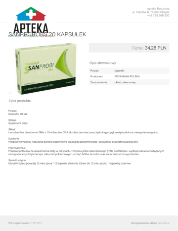 Apteka Rodzinna ul. Piastów 8, 74-500 Chojna +48 725 298 530 SANPROBI IBS 20 KAPSUŁEK Cena: 34,28 PLN Opis słownikowy Postać kapsułki Producent IPC/SANUM POLSKA Zastosowanie układ pokarmowy Opis produktu Postać Kapsułki, 20 szt. Status Suplement diety. Skład Lactobacillus plantonum 299v z 10 miliardów CFU, skrobia ziemniaczana, hydroksypropylometyloceluloza, stearynian magnezu. Działanie Produkt wzmacniaj naturalną barierę śluzówkową przewodu pokarmowego i przywraca prawidłową pracę jelit. Przeznaczenie Preparat polecany do uzupełnienia diety w przypadku: zespołu jelita nadwrażliwego (IBS), profilaktyki i występowania niepożądanych następstw antybiotykoterapii, zaburzeń pokarmowych, wzdęć, bólów brzucha oraz zaburzeń rytmu wypróżnień. Sposób użycia Dorośli i dzieci powyżej 12 roku życia: 1-2 kapsułki dziennie. Dzieci do 12 roku życia: 1 kapsułkę dziennie. Plik wygenerowano: 07-03-2017 Powered by TCPDF (www.tcpdf.org) Oprogramowanie sklepu: AptusShop