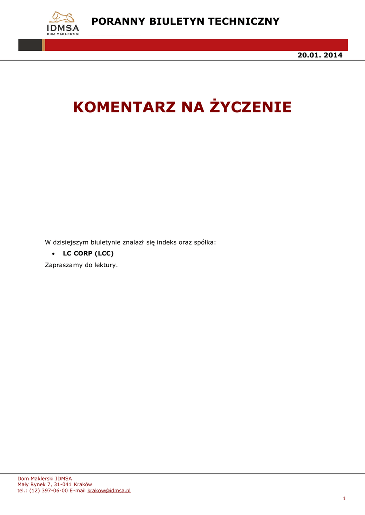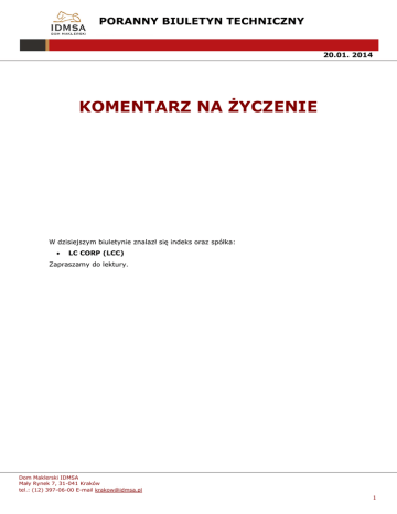 PORANNY BIULETYN TECHNICZNY 20.01. 2014 KOMENTARZ NA ŻYCZENIE W dzisiejszym biuletynie znalazł się indeks oraz spółka: LC CORP (LCC) Zapraszamy do lektury. Dom Maklerski IDMSA Mały Rynek 7, 31-041 Kraków tel.: (12) 397-06-00 E-mail [email protected] 1 PORANNY BIULETYN TECHNICZNY 20.01. 2014 LC CORP (LCC) Wykres 1. Perspektywa krótkoterminowa. Trend krótko i średnioterminowy jest tutaj wzrostowy, a jego szerokość określają póki co poziomy – 1,50 od dołu i 1,94-2,03 od góry. Wydaje się, że te ramy będą obowiązujące przez najbliższy okres, liczony nawet w kilku miesiącach, gdyż jest to wystarczająco szeroka rozpiętość, by opłacało się prowadzić aktywną grę kupna w okolicy wsparcia i sprzedaży w okolicy oporu. Wskaźniki dostarczają pewnych obiekcji, czy obecnie uda się ponownie dotrzeć pod samą strefę oporu, gdyż RSI14 podchodzi pod opór, a Ultimate jest wykupiony, niemniej realizując politykę drobnych i małych kroczków w górę – może się udać. Biorąc pod uwagę rosnące znaczenie przyspieszonej linii trendu nie wydaje się, by poziom 1,50 miał zostać złamany, co powoduje, iż w jego okolicy byki powinny się aktywizować i szukać okazji do zakupów. Dom Maklerski IDMSA Mały Rynek 7, 31-041 Kraków tel.: (12) 397-06-00 E-mail [email protected] 2 PORANNY BIULETYN TECHNICZNY 20.01. 2014 Wykres 2. Perspektywa długoterminowa. W ujęciu (bardzo) długoterminowym mamy do czynienia z konsolidacją o zwyżkującym charakterze tworzącą długoterminowy trójkąt zwyżkujący. Taki kształt będzie predestynował ten papier do wybicia w górę i pokonania oporu na poziomie 2,03, co powinno zapoczątkować długoterminowy trend wzrostowy z potencjałem wzrostów do 3,42. Ponieważ konsolidacja ta jest wciąż dość szeroka, zanim wyjdzie do prognozowanego wybicia, trzeba się liczyć z dalszą konsolidacją we wskazanym w analizie krótkoterminowej horyzoncie przedziale - 1,50-1,94/2,03. I na takiej grze warto się obecnie skupić. Dopiero wybicie powyżej 2,03 będzie sprzyjało strategii kup i trzymaj. Dom Maklerski IDMSA Mały Rynek 7, 31-041 Kraków tel.: (12) 397-06-00 E-mail [email protected] 3 PORANNY BIULETYN TECHNICZNY 20.01. 2014 Dom Maklerski IDMSA 31-041 Kraków, Mały Rynek 7 tel.: (12) 397-06-00; fax: (12) 397-06-01 [email protected]; [email protected] Niniejsza publikacja została przygotowana przez Dom Maklerski IDMSA. wyłącznie w celach informacyjnych i nie stanowi rekomendacji w rozumieniu przepisów Rozporządzenia Ministra Finansów z dnia 19 października 2005 r. w sprawie informacji stanowiących rekomendacje dotyczące instrumentów finansowych, ich emitentów lub wystawców. Wyłączną odpowiedzialność za decyzje inwestycyjne, podjęte lub zaniechane na podstawie raportu lub z wykorzystaniem wniosków w nim zawartych, ponosi inwestor. Właścicielem majątkowych praw autorskich do raportu jest Dom Maklerski IDMSA. Powielanie bądź publikowanie niniejszej publikacji lub jej części bez pisemnej zgody Domu Maklerskiego IDMSA jest zabronione. Dom Maklerski IDMSA Mały Rynek 7, 31-041 Kraków tel.: (12) 397-06-00 E-mail [email protected] 4