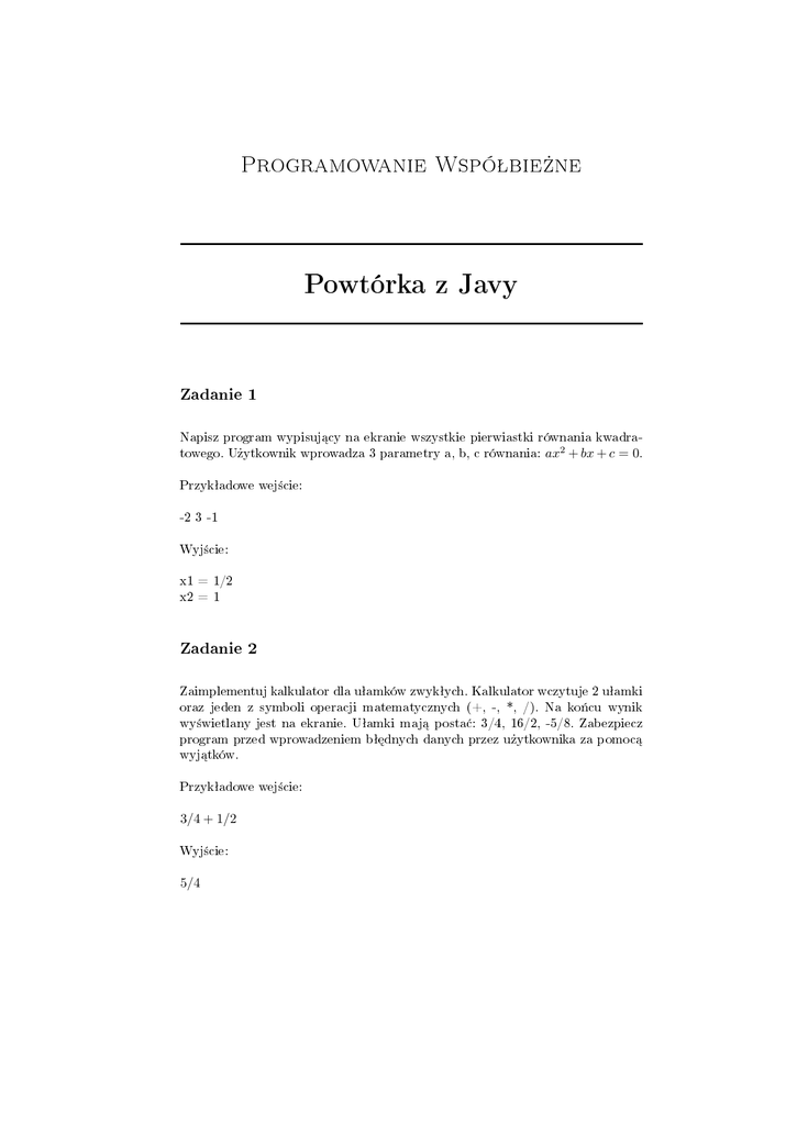 Programowanie Wspóªbie»ne Powtórka z Javy Zadanie 1 Napisz program wypisuj¡cy na ekranie wszystkie pierwiastki równania kwadratowego. U»ytkownik wprowadza 3 parametry a, b, c równania: ax2 + bx + c = 0. Przykªadowe wej±cie: -2 3 -1 Wyj±cie: x1 = 1/2 x2 = 1 Zadanie 2 Zaimplementuj kalkulator dla uªamków zwykªych. Kalkulator wczytuje 2 uªamki oraz jeden z symboli operacji matematycznych (+, -, *, /). Na ko«cu wynik wy±wietlany jest na ekranie. Uªamki maj¡ posta¢: 3/4, 16/2, -5/8. Zabezpiecz program przed wprowadzeniem bª¦dnych danych przez u»ytkownika za pomoc¡ wyj¡tków. Przykªadowe wej±cie: 3/4 + 1/2 Wyj±cie: 5/4 Zadanie 3 Napisz prosty program do rejestracji i obsªugi studentów. Program powinien pozwala¢ na dodawanie nowych studentów, usuwanie i modykowanie istniej¡cych. Student charaktryzuje si¦ takimi danymi jak: imi¦, nazwisko, numer albumu, rok i kierunek studiów oraz adres zamieszkania. Program powinien wy±wietla¢ list¦ aktualnych studentów ze wzgl¦du na ró»ne kryteria wyszukiwania, jak np. rok lub kierunek studiów. Zadanie 4 Rozbuduj program z zadania 3 o mo»liwo±¢ zarz¡dzania pracownikami (wykªadowcami) wydziaªu. Stwórz klas¦ abstrakcyjn¡ Osoba, po której b¦d¡ dziedziczy¢ klasy Student oraz Pracownik. Pracownik charakteryzuje si¦ dodatkowymi polami, takimi jak NIP, numer komputera oraz stopie« naukowy. Wykorzystuj¡c mechanizm dziedziczenia postaraj si¦ jak najbardziej zoptymalizowa¢ obj¦to±¢ kodu programowego. Zadanie 5 Przy pomocy biblioteki Swing napisz aplikacj¦ MiniPaint. Program powinien umo»liwia¢: mo»liwo±¢ wyboru 2 ró»nych kolorów, rysowanie oªówkiem, rysowanie prostej linii, umieszczanie prostych gur geometrycznych (prostok¡t, kwadrat, okr¡g, elipsa), dobór grubo±ci lini, mo»liwo±¢ cofni¦cia zmian (undo), zapis obrazu do pliku *.bmp.