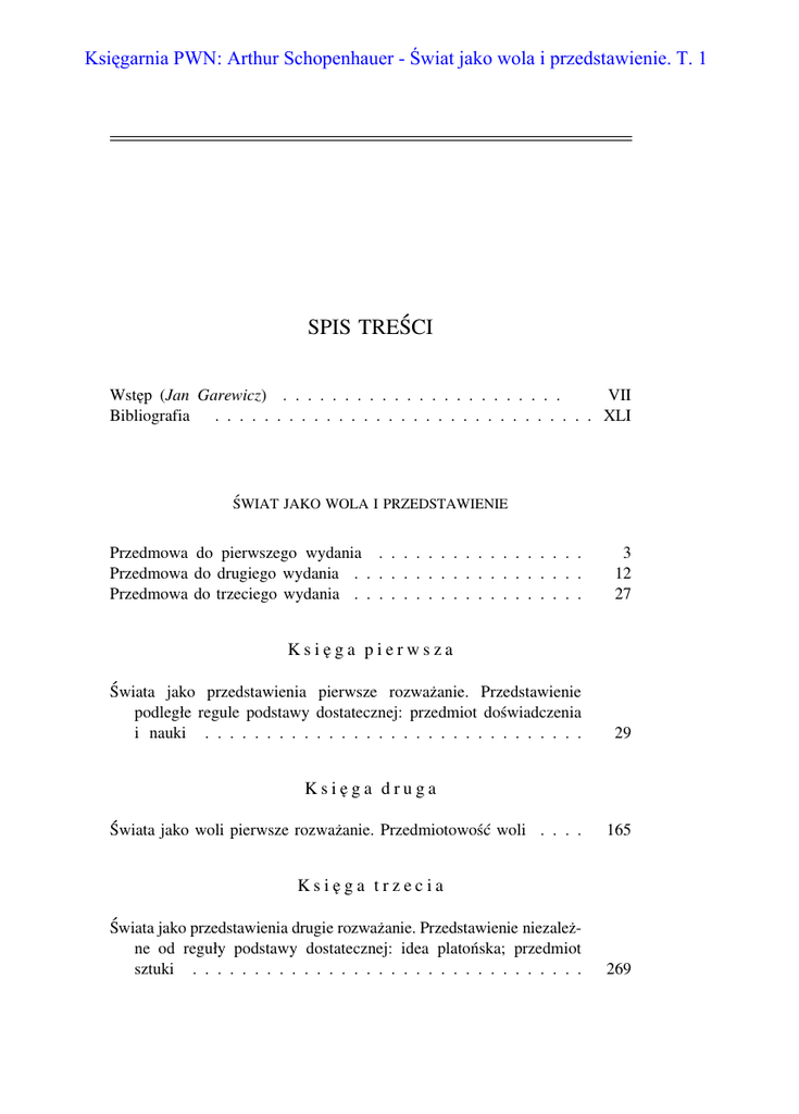 Księgarnia PWN: Arthur Schopenhauer - Świat jako wola i przedstawienie. T. 1 SPIS TREŚCI Wste˛p (Jan Garewicz) . . . . . . . . . . . . . . . . . . . . . . . VII Bibliografia . . . . . . . . . . . . . . . . . . . . . . . . . . . . . . . XLI ŚWIAT JAKO WOLA I PRZEDSTAWIENIE Przedmowa do pierwszego wydania . . . . . . . . . . . . . . . . . Przedmowa do drugiego wydania . . . . . . . . . . . . . . . . . . . Przedmowa do trzeciego wydania . . . . . . . . . . . . . . . . . . . 3 12 27 K s i e˛ g a p i e r w s z a Świata jako przedstawienia pierwsze rozważanie. Przedstawienie podległe regule podstawy dostatecznej: przedmiot doświadczenia i nauki . . . . . . . . . . . . . . . . . . . . . . . . . . . . . . . 29 K s i e˛ g a d r u g a Świata jako woli pierwsze rozważanie. Przedmiotowość woli . . . . 165 K s i e˛ g a t r z e c i a Świata jako przedstawienia drugie rozważanie. Przedstawienie niezależne od reguły podstawy dostatecznej: idea platońska; przedmiot sztuki . . . . . . . . . . . . . . . . . . . . . . . . . . . . . . . . 269 VI Spis treści K s i e˛ g a c z w a r t a Świata jako woli drugie rozważanie. Przy uzyskanym samopoznaniu potwierdzenie i zaprzeczenie woli życia . . . . . . . . . . . . . 415 Dodatek Krytyka filozofii Kanta Skorowidz osób Skorowidz poje˛ć . . . . . . . . . . . . . . . . . . . . . . . . 623 . . . . . . . . . . . . . . . . . . . . . . . . . . . . . . . . . . . . . . . . . . . . . . . . . . . . . . . . 804 811
