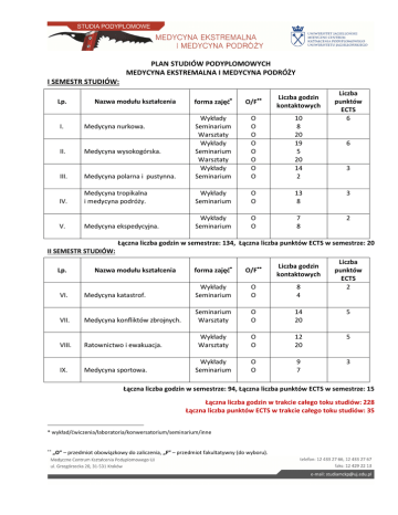 PLAN STUDIÓW PODYPLOMOWYCH MEDYCYNA EKSTREMALNA I MEDYCYNA PODRÓŻY I SEMESTR STUDIÓW: Lp. Nazwa modułu kształcenia forma zajęć∗ O/F∗∗ Liczba godzin kontaktowych O O O O O O O O 10 8 20 19 5 20 14 2 Liczba punktów ECTS 6 III. Medycyna polarna i pustynna. Wykłady Seminarium Warsztaty Wykłady Seminarium Warsztaty Wykłady Seminarium Wykłady Seminarium O O 13 8 3 IV. Medycyna tropikalna i medycyna podróży. Medycyna ekspedycyjna. Wykłady Seminarium O O 7 8 2 V. I. Medycyna nurkowa. II. Medycyna wysokogórska. 6 3 Łączna liczba godzin w semestrze: 134, Łączna liczba punktów ECTS w semestrze: 20 II SEMESTR STUDIÓW: Lp. Nazwa modułu kształcenia forma zajęć∗ O/F∗∗ Liczba godzin kontaktowych Liczba punktów ECTS 2 VI. Medycyna katastrof. Wykłady Seminarium O O 8 4 Medycyna konfliktów zbrojnych. Seminarium Warsztaty O O 14 20 5 VII. Ratownictwo i ewakuacja. Wykłady Warsztaty O O 12 20 5 VIII. Wykłady Seminarium O O 9 7 3 IX. Medycyna sportowa. Łączna liczba godzin w semestrze: 94, Łączna liczba punktów ECTS w semestrze: 15 Łączna liczba godzin w trakcie całego toku studiów: 228 Łączna liczba punktów ECTS w trakcie całego toku studiów: 35 * wykład/ćwiczenia/laboratoria/konwersatorium/seminarium/inne ∗∗ „O” – przedmiot obowiązkowy do zaliczenia, „F” – przedmiot fakultatywny (do wyboru).