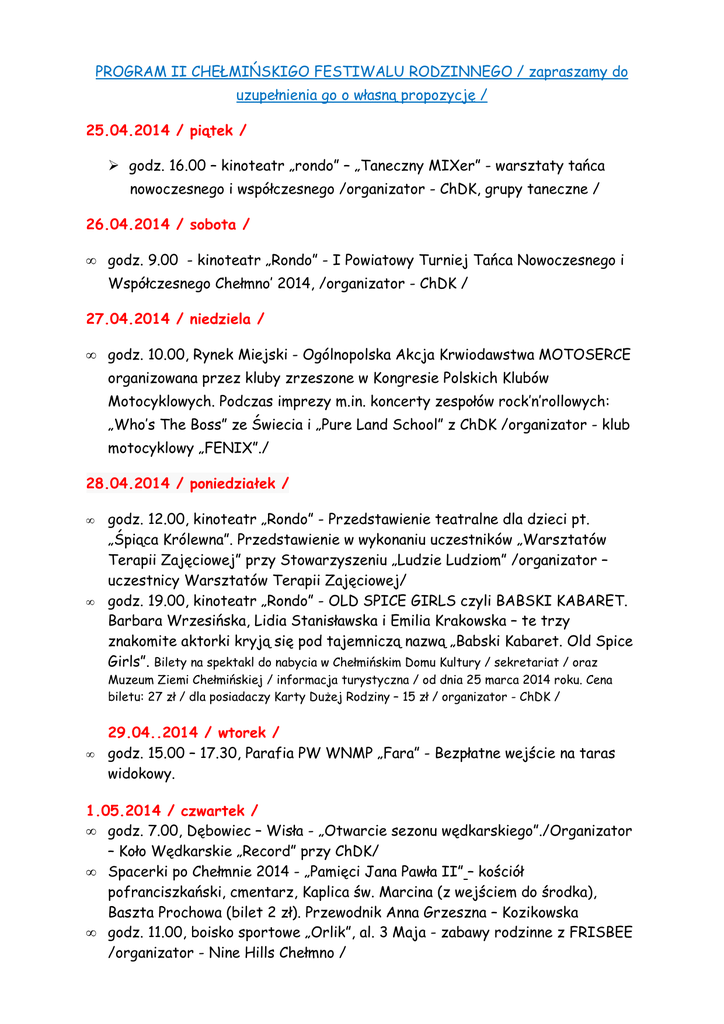 PROGRAM II CHEŁMIŃSKIGO FESTIWALU RODZINNEGO / zapraszamy do uzupełnienia go o własną propozycję / 25.04.2014 / piątek / godz. 16.00 – kinoteatr „rondo” – „Taneczny MIXer” - warsztaty tańca nowoczesnego i współczesnego /organizator - ChDK, grupy taneczne / 26.04.2014 / sobota / • godz. 9.00 - kinoteatr „Rondo” - I Powiatowy Turniej Tańca Nowoczesnego i Współczesnego Chełmno’ 2014, /organizator - ChDK / 27.04.2014 / niedziela / • godz. 10.00, Rynek Miejski - Ogólnopolska Akcja Krwiodawstwa MOTOSERCE organizowana przez kluby zrzeszone w Kongresie Polskich Klubów Motocyklowych. Podczas imprezy m.in. koncerty zespołów rock’n’rollowych: „Who’s The Boss” ze Świecia i „Pure Land School” z ChDK /organizator - klub motocyklowy „FENIX”./ 28.04.2014 / poniedziałek / • • godz. 12.00, kinoteatr „Rondo” - Przedstawienie teatralne dla dzieci pt. „Śpiąca Królewna”. Przedstawienie w wykonaniu uczestników „Warsztatów Terapii Zajęciowej” przy Stowarzyszeniu „Ludzie Ludziom” /organizator – uczestnicy Warsztatów Terapii Zajęciowej/ godz. 19.00, kinoteatr „Rondo” - OLD SPICE GIRLS czyli BABSKI KABARET. Barbara Wrzesińska, Lidia Stanisławska i Emilia Krakowska – te trzy znakomite aktorki kryją się pod tajemniczą nazwą „Babski Kabaret. Old Spice Girls”. Bilety na spektakl do nabycia w Chełmińskim Domu Kultury / sekretariat / oraz Muzeum Ziemi Chełmińskiej / informacja turystyczna / od dnia 25 marca 2014 roku. Cena biletu: 27 zł / dla posiadaczy Karty Dużej Rodziny – 15 zł / organizator - ChDK / • 29.04..2014 / wtorek / godz. 15.00 – 17.30, Parafia PW WNMP „Fara” - Bezpłatne wejście na taras widokowy. 1.05.2014 / czwartek / • godz. 7.00, Dębowiec – Wisła - „Otwarcie sezonu wędkarskiego”./Organizator – Koło Wędkarskie „Record” przy ChDK/ • Spacerki po Chełmnie 2014 - „Pamięci Jana Pawła II” – kościół pofranciszkański, cmentarz, Kaplica św. Marcina (z wejściem do środka), Baszta Prochowa (bilet 2 zł). Przewodnik Anna Grzeszna – Kozikowska • godz. 11.00, boisko sportowe „Orlik”, al. 3 Maja - zabawy rodzinne z FRISBEE /organizator - Nine Hills Chełmno / 2.05.2014 / piątek / • godz. 11.00 , Park Nowe Planty - ZABAWY W DNIU FLAGI. Zapraszamy do udziału w zabawach znanych z podwórka i szkolnego boiska m.in. grę w kapsle, zabawy z chustą, bierki, rysowanie kredą, grę w chłopka, bańki mydlane, szachy czy malowanie twarzy. /Organizator - Czas Chełmna/ 3.05.2014 / sobota / "W duchu wychowania patriotycznego" • godz. 12.00 - uroczystość złożenia kwiatów przy Grobie Nieznanego Żołnierza z udziałem kompanii honorowej, • ok. godz. 12.40 Bramka Grudziądzka – koncert Orkiestry Dętej Chełmińskiego Domu Kultury, • godz. 12.40, Bramka Grudziądzka / przy murach obronnych / - Plener milusińskich "Chełmno - moja mała Ojczyzna" - wykonywanie prac plastycznych przez dzieci /organizator-Chełmiński Dom Kultury / 4.05.2014 / niedziela / • godz. 7.00 – 12.00, Dębowiec – Wisła – „Spiningowe Zawody Wędkarskie o Mistrzostwo Koła” /organizator – Koło Wędkarskie „Record” przy ChDK/ • Spacerki po Chełmnie 2014 - „Śladami prof. dr Ludwika Rydygiera w Chełmnie” –gimnazjum chełmińskie, klasztor (dawny szpital zakaźny), ul. Biskupia, szpital, Nowe Planty, dawna klinika Rydygiera - Przewodnik Jadwiga Alaba – Wesołowska • OTWARTE MISTRZOSTWA MAŻORETEK POLSKI PÓŁNOCNEJ W CHEŁMNIE - informacje szczegółowe na stronie www.chdk.pl /organizator - ChDK / Współorganizatorzy - na dzień 28.03.2014: Chełmiński Dom Kultury Czas Chełmna Klub Motocyklowy FENIX z Chełmna Koło Wędkarskie „Record” przy ChDK Muzeum Ziemi Chełmińskiej „Nine Hills” Chełmno Parafia PW WNMP „FARA” Urząd Miasta Chełmna Warsztaty Terapii Zajęciowej 3 Batalion Drogowo - Mostowy w Chełmnie Czekamy na Wasze propozycje.
