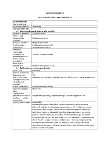 KARTA PRZEDMIOTU Język niemiecki BIZNESOWY - poziom C1 Opis Przedmiotu Kod przedmiotu Nazwa przedmiotu Język obcy Wersja przedmiotu 1 A. Usytuowanie przedmiotu w toku studiów Poziom kształcenia Studia I stopnia Forma i tryb prowadzenia Studia stacjonarne studiów Kierunek studiów Wszystkie kierunki Profil studiów Profil ogólno akademicki Specjalność Wszystkie specjalności Jednostka realizująca przedmiot na Studium Języków Obcych zlecenie jednostki prowadzącej przedmiot Koordynator przedmiotu Lektorzy zatrudnieni w SJO B. Ogólna charakterystyka przedmiotu Język obcy niemiecki Poziom przedmiotu C1 Czy przedmiot Tak zalicza taką samą wyłącznie na Wydziałach Zarządzania oraz Administracji i Nauk Społecznych. liczbę godzin języka na studiach II stopnia? Status przedmiotu Przedmiot obowiązkowy Język prowadzenia Niemiecki zajęć Usytuowanie przedmiotu w planie Przedmiot wybierany przez studenta po zaliczeniu egzaminu B2. studiów – semestr nominalny Wymagania wstępne Poziom B2: Osoba posługująca się językiem na tym poziomie rozumie znaczenie głównych wątków przekazu, zawartego w złożonych tekstach na tematy konkretne i abstrakcyjne, łącznie ze zrozumieniem dyskusji, na tematy techniczne z zakresu jej specjalności. Potrafi porozumiewać się na tyle płynnie i spontanicznie, by prowadzić normalną rozmowę z rodzimym użytkownikiem języka, nie powodując przy tym napięcia u którejkolwiek ze stron. Potrafi – w szerokim zakresie tematów – formułować przejrzyste i szczegółowe wypowiedzi ustne lub pisemne, a także wyjaśniać swoje stanowisko w sprawach, będących przedmiotem dyskusji, rozważając wady i zalety rożnych rozwiązań. Limit liczby 12-24 studentów C. Efekty kształcenia i sposób prowadzenia zajęć Cel przedmiotu Rozwój znajomości języka na poziomie C1 (pierwszy, drugi lub trzeci moduł z 3) zgodnie z Europejskim Opisem Kształcenia Językowego w zakresie języka biznesowego. Zapoznanie studentów z realiami pracy w niemieckiej firmie i przygotowanie ich do pracy w firmach niemieckich. Student zna słownictwo i struktury gramatyczne, pozwalające mu na tworzenie klarownych, dobrze skonstruowanych wypowiedzi. Zna właściwe funkcjonalnie wyrażenia aby zabrać głos w dyskusji i wypowiadać się na temat studiowanej dziedziny i swojej pracy. Pisanie: Student potrafi się wypowiadać w zrozumiałych i dobrze zbudowanych tekstach, dosyć szeroko przedstawiając swój punkt widzenia. Potrafi pisać o złożonych zagadnieniach w opracowaniu, podkreślając kwestie, które uważa za najistotniejsze. Potrafi dostosować styl tekstu do potencjalnego czytelnika. Potrafi napisać życiorys i list motywacyjny. Czytanie: Student rozumie teksty ekonomiczne, notatki służbowe, potrafi odczytać dane liczbowe. Mówienie: Student potrafi formułować przejrzyste i szczegółowe wypowiedzi, dotyczące skomplikowanych zagadnień ekonomicznych, rozwijać w nich wybrane podtematy lub poszczególne kwestie i kończyć j odpowiednią konkluzją. Potrafi się wypowiadać płynnie i spontanicznie. Potrafi się skutecznie porozumiewać w kontaktach towarzyskich i sprawach zawodowych. Potrafi precyzyjnie formułować swoje myśli i poglądy. Potrafi wziąć udział w dyskusji, rozmowie kwalifikacyjnej, potrafi załatwić sprawy służbowe w instytucjach. Słuchanie: Student potrafi prowadzić rozmowę przez telefon, rozumie informacje ekonomiczne, prezentowane w radiu i w telewizji. Bez trudu bierze udział w dyskusjach, prowadzonych w szybkim tempie. Potrafi dostrzegać zmianę rejestru wypowiedzi. Potrafi uczestniczyć w rozmowach dyskusjach, potrafi pracować w grupie, przyjmując w niej różne role. Kompeten cje społeczne Umiejętności Wiedza Efekty kształcenia (z podziałem na W, U, KS) Formy zajęć dydaktycznych Ćwiczenia 30 godzin Treści kształcenia Metody sprawdzania efektów Egzamin Tematyka: Ekonomia w krajach Niemieckiego obszaru językowego, Język ekonomiczny, sytuacje codzienne w pracy, w banku, podczas służbowych obiadów, formuły grzecznościowe, zarządzanie projektami, organizacja spotkania służbowego/konferencji, ogłoszenia dotyczące zatrudnienia, złożenie wniosku o zatrudnienie (życiorys, list motywacyjny, list referencyjny), rozmowa kwalifikacyjna Język specjalistyczny: fachowe pojęcia ekonomiczne Praca na lekcji Prace domowe Krótkie prace kontrolne Test modułowy Nie Uwaga: student zdaje ogólnouczelniany obowiązkowy egzamin B2 z wybranego języka. Zapisy na egzamin przez stronę www.sjo.pw.edu.pl Egzamin nie jest przypisany do żadnego z modułów nauczania. Literatura (podręcznik + materiały własne) Witryna www przedmiotu Różne, dobierane według tematyki zajęć podręczniki standardowe i artykuły z aktualnej prasy ekonomicznej (dzienniki, tygodniki, miesięczniki) oraz samodzielnie przygotowane przez lektora, dopasowane do poziomu grupy materiały dydaktyczne. www.sjo.pw.edu.pl D. Nakład pracy studenta Liczba punktów ECTS 2 Liczba godzin pracy 30 godzin zajęcia + 30 godzin praca własna studenta ( w tym przygotowanie studenta związanych do zajęć, przygotowanie do testu modułowego, przygotowanie prezentacji) z osiągnięciem efektów kształcenia E. Informacje dodatkowe Uwagi Wymagania do zaliczenia Data aktualizacji Obecność na zajęciach (dopuszczalne 2 nieusprawiedliwione nieobecności) Zaliczenie wszystkich prac kontrolnych Wykonanie wszystkich prac domowych Aktywne uczestnictwo w zajęciach Prezentacja (jeśli przewidziana w programie) Zaliczenie testu modułowego (waga oceny z testu modułowego w ocenie końcowej: 50%) 30.06.2012