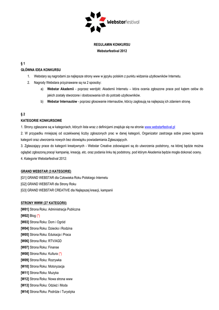 REGULAMIN KONKURSU Webstarfestival 2012 § 1 GŁÓWNA IDEA