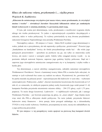 Klucz do sukcesu: wiara, przekonanie i… cięŜka praca Wojciech K. Szalkiewicz „Kluczem do ostatecznego zwycięstwa jest nasza wiara, nasze przekonanie, Ŝe zwycięŜyć moŜna i trzeba” – oświadczył Jarosław Kaczyński kilkanaście minut po zamknięciu lokali wyborczych w ostatnią niedzielę. I z pewnością miał rację. O tym, jak waŜna jest determinacja, wola, przekonanie o moŜliwości wygrania chyba nikogo nie trzeba przekonywać. To jeden z najwaŜniejszych czynników decydujących o sukcesie, takŜe w walce politycznej. Te wybory potwierdziły tę tezę dwoma przykładami: sukcesem Grzegorza Napieralskiego oraz poraŜką Waldemara Pawlaka. Niewątpliwy sukces – III miejsce w I turze – lidera SLD wynikał z jego determinacji w walce, jednak nie o prezydenturę, ale tak naprawdę o polityczne „przetrwanie”. PrzecieŜ jego „kandydatura na kandydata” lewicy do fotela prezydenckiego miała być – dla wielu jego partyjnych przeciwników – sposobem na pozbycie się go, nie tylko ze stanowiska szefa lewicy, ale moŜe i nawet z szeregów partii. Gdyby tylko osiągnął mierny wynik – tj. na poziomie słabych notowań Sojuszu, zapewne jego godziny byłyby policzone. Stąd teŜ i zapewne jego niewątpliwie autentyczne zaangaŜowanie się w tę kampanię i cięŜka walka o kaŜdy głos. Tej determinacji, a nawet odrobiny zaangaŜowania, zabrakło natomiast niewątpliwie Waldemarowi Pawlakowi. Nawet z kamiennej twarzy lidera PSL-u moŜna było odczytać, Ŝe startuje w tych wyborach bez szans czy nadziei na sukces. Wystartował, bo „powinien był”, bo partia musiała się pokazać przed – najwaŜniejszymi dla ludowców w tym roku – wyborami samorządowymi. Praktycznie „Ŝadna”, chociaŜ niezmiernie kosztowana (bo kosztowała aŜ 3,5 mln zł, co oznaczało, Ŝe zdobycie poparcia jednej osoby kosztowało jego sztab ponad 11 zł) kampania Pawlaka przyniosła niezmiernie mizerne efekty – 294 273 głosy, czyli 1,75 proc. poparcia. To moŜe drogo kosztować. Ludowców – w najbliŜszych wyborach, jak i samego Waldemara Pawlaka – juŜ bowiem pojawiają się głosy, Ŝe „musi odejść”. Jego klęska moŜe więc mieć dla PSL-u olbrzymie skutki polityczne. Na razie jednak, przyniosła liderowi ludowców straty finansowe – dwie pensje, które przegrał zakładając się z dziennikarką TVN24 o swój wynik wyborczy. Osobiście, przynajmniej na razie, raczej nie zakładałbym się o jego polityczną przyszłość. W tym miejscu i z tej perspektywy warto spojrzeć na pierwszą fazę kampanii dwóch liderów. W przypadku Bronisława Komorowskiego, tak jak i u Waldemara Pawlaka, widoczny był brak silnej motywacji. W tej fazie kampanii, moŜna było odnieść wraŜenie, Ŝe kandydat PO walczy nie o urząd Prezydenta RP, ale tylko o „Ŝyrandol” i do takiego celu dostosowuje swoje działania. Sztab Komorowskiego pozostawał bierny, defensywny, bez pomysłu, a moŜna było powalczyć o sukces w I turze. Był to cel realny, co pokazywały sondaŜe z początku kampanii. Dałoby to nie tylko Komorowskiemu, ale przede wszystkim Platformie, zdecydowanie silniejszą pozycję na scenie politycznej. Widać jednak było, Ŝe w walkę o pałac prezydencki PO nie zaangaŜowała wszystkich swoich sił – z premierem Tuskiem włącznie (i nie „zwalałbym” tego na powódź). W 2005 r. strategia polegająca jedynie na „dowiezieniu” przewagi sondaŜowej do wyborów okazała się dla Platformy zabójcza. CzyŜby w jej sztabie nikt nie wyciągnął z tego wniosków? W mojej opinii duŜo silniejszą motywację, a tym samym zdecydowanie lepszą kampanię miał niewątpliwie Jarosław Kaczyński. Pamiętać jednak przy tym naleŜy, Ŝe jego celem była na tym etapie nie prezydentura, ale – „nie dać się wyeliminować w pierwszej turze”. Osiągnięcie przez kandydata PO ponad 50 proc. wyniku, czy teŜ zajęcie przez kandydata PiS III. miejsca, oznaczałoby dla Kaczyńskiego kolejną wyborczą poraŜkę i realną wizję politycznej emerytury na stanowisku honorowego prezesa. Obecnie, nawet prognozowana przez sondaŜe, poraŜka w drugiej turze nie jest juŜ dla J. Kaczyńskiego „groźna”. JeŜeli nie wygra to i tak zachowa, a nawet umocni, swoją pozycję w partii. Trzeba jednak przyznać, Ŝe Kaczyński ma nadal silną motywację. Podczas wspomnianego na początku wieczoru wyborczego, mówił do swoich zwolenników: „Musimy zwycięŜyć dla Polski”. Nadal zarówno prezes, jak i partia mają bardzo silną chęć i wolę, aby przede wszystkim „odkuć” się na Platformie za przegrane wybory 2007 i 2009 roku. Poza tym prezydentura jest w zasięgu ręki i podobnie jak w 2005 r. moŜe się udać… Nic dziwnego, Ŝe w tej walce Jarosław Kaczyński jest gotów na gesty i słowa, które nie tylko zaskakują, ale wręcz szokują. Stwierdzenie, Ŝe w Polsce nie ma juŜ „postkomunizmu”, tylko najwięksi fani prezesa i najzagorzalsi pisowcy mogą jeszcze uznać, za skutek „przemiany” J. Kaczyńskiego pod wpływem śmierci brata. Niestety nie ma we tym juŜ Ŝadnej „traumy” – jest normalna walka o głosy. Prezes Kaczyński był i jest politykiem z krwi i kości. W 2005 r. nie zawahał się sięgnąć po głosy Samoobrony i poparcie Andrzeja Leppera. I nie waŜne, Ŝe rok wcześniej m.in. na czacie portalu Gazeta.pl (22.03.04 r.) deklarował: „Mamy dwa wyraźne zakazy, które dziś obowiązują w samorządach, a będą teŜ obowiązywać w nowym parlamencie – SLD i Samoobrona. A dziś powinno się powiedzieć odwrotnie – Samoobrona i SLD”. Warto teŜ dodać, Ŝe jak informował „Super Express” (19.04.06 r.), aby podpisać umowę koalicyjną z Samoobroną, Rada Polityczna PiS musiała uchylić swoją własną uchwałę z kwietnia 2002 r. o zakazie współpracy z tą partią. „Ale tylko w części dotyczącej Samoobrony. Zapis o zakazie koalicji z SLD obowiązuje nadal” – zarzekał się na łamach „SE” poseł Marek Suski. Cieka