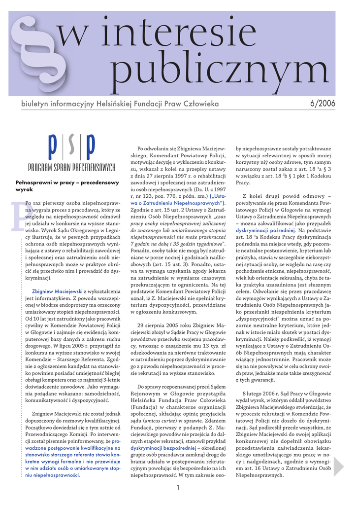 w interesie publicznym biuletyn informacyjny Helsińskiej Fundacji Praw Człowieka Pełnosprawni w pracy – precedensowy wyrok P Po raz pierwszy osoba niepełnosprawna wygrała proces z pracodawcą, który ze względu na niepełnosprawność odmówił jej udziału w konkursie na wyższe stanowisko. Wyrok Sądu Okręgowego w Legnicy ilustruje, że w pewnych przypadkach ochrona osób niepełnosprawnych wynikająca z ustawy o rehabilitacji zawodowej i społecznej oraz zatrudnieniu osób niepełnosprawnych może w praktyce obrócić się przeciwko nim i prowadzić do dyskryminacji. Zbigniew Maciejewski z wykształcenia jest informatykiem. Z powodu wszczepionej w biodrze endoprotezy ma orzeczony umiarkowany stopień niepełnosprawności. Od 10 lat jest zatrudniony jako pracownik cywilny w Komendzie Powiatowej Policji w Głogowie i zajmuje się ewidencją komputerowej bazy danych z zakresu ruchu drogowego. W lipcu 2005 r. przystąpił do konkursu na wyższe stanowisko w swojej Komendzie – Starszego Referenta. Zgodnie z ogłoszeniem kandydat na stanowisko powinien posiadać umiejętność biegłej obsługi komputera oraz co najmniej 3-letnie doświadczenie zawodowe. Jako wymagania pożądane wskazano: samodzielność, komunikatywność i dyspozycyjność. Znigniew Maciejewski nie został jednak dopuszczony do rozmowy kwalifikacyjnej. Początkowo dowiedział się o tym ustnie od Przewodniczącego Komisji. Po interwencji został pisemnie poinformowany, że prowadzone postępowanie kwalifikacyjne na stanowisko starszego referenta stawia konkretne wymogi formalne i nie przewiduje w nim udziału osób o umiarkowanym stopniu niepełnosprawności. Po odwołaniu się Zbigniewa Maciejewskiego, Komendant Powiatowy Policji, motywując decyzję o wykluczeniu z konkursu, wskazał z kolei na przepisy ustawy z dnia 27 sierpnia 1997 r. o rehabilitacji zawodowej i społecznej oraz zatrudnieniu osób niepełnosprawnych (Dz. U. z 1997 r, nr 123, poz. 776, z późn. zm.) („Ustawa o Zatrudnieniu Niepełnosprawnych”). Zgodnie z art. 15 ust. 2 Ustawy o Zatrudnieniu Osób Niepełnosprawnych „czas pracy osoby niepełnosprawnej zaliczonej do znacznego lub umiarkowanego stopnia niepełnosprawności nie może przekraczać 7 godzin na dobę i 35 godzin tygodniowo”. Ponadto, osoby takie nie mogą być zatrudniane w porze nocnej i godzinach nadliczbowych (art. 15 ust. 3). Ponadto, ustawa ta wymaga uzyskania zgody lekarza na zatrudnienie w wymiarze czasowym przekraczającym te ograniczenia. Na tej podstawie Komendant Powiatowy Policji uznał, iż Z. Maciejewski nie spełniał kryterium dyspozycyjności, przewidziane w ogłoszeniu konkursowym. 29 sierpnia 2005 roku Zbigniew Maciejewski złożył w Sądzie Pracy w Głogowie powództwo przeciwko swojemu pracodawcy, wnosząc o zasądzenie mu 13 tys. zł odszkodowania za nierówne traktowanie w zatrudnieniu poprzez dyskryminowanie go z powodu niepełnosprawności w procesie rekrutacji na wyższe stanowisko. Do sprawy rozpoznawanej przed Sądem Rejonowym w Głogowie przystąpiła Helsińska Fundacja Praw Człowieka (Fundacja) w charakterze organizacji społecznej, składając opinię przyjaciela sądu (amicus curiae) w sprawie. Zdaniem Fundacji, pierwszy z podanych Z. Maciejewskiego powodów nie przejścia do dalszych etapów rekrutacji, stanowił przykład dyskryminacji bezpośredniej – określonej grupie osób pracodawca zamknął drogę do brania udziału w postępowaniu rekrutacyjnym powołując się bezpośrednio na ich niepełnosprawność. W tym zakresie oso- 1 6/2006 by niepełnosprawne zostały potraktowane w sytuacji relewantnej w sposób mniej korzystny niý osoby zdrowe, tym samym naruszony został zakaz z art. 18 3a § 3 w związku z art. 18 3b § 1 pkt 1 Kodeksu Pracy. Z kolei drugi powód odmowy – powoływanie się przez Komendanta Powiatowego Policji w Głogowie na wymogi Ustawy o Zatrudnieniu Niepełnosprawnych – można zakwalifikować jako przypadek dyskryminacji pośredniej. Na podstawie art. 18 3a Kodeksu Pracy dyskryminacja poúrednia ma miejsce wtedy, gdy pozornie neutralne postanowienie, kryterium lub praktyka, stawia w szczególnie niekorzystnej sytuacji osoby, ze względu na rasę czy pochodzenie etniczne, niepełnosprawność, wiek lub orientacje seksualną, chyba że taka praktyka uzasadniona jest słusznym celem. Odwołanie się przez pracodawcę do wymogów wynikających z Ustawy o Zatrudnieniu Osób Niepełnosprawnych jako przesłanki niespełnienia kryterium „dyspozycyjności” można uznać za pozornie neutralne kryterium, które jednak w istocie miało skutek w postaci dyskryminacji. Należy podkreślić, iż wymogi wynikające z Ustawy o Zatrudnieniu Osób Niepełnosprawnych mają charakter wiążący jednostronnie. Pracownik może się na nie powoływać w celu ochrony swoich praw, jednakże może także zrezygnować z tych gwarancji. 8 lutego 2006 r. Sąd Pracy w Głogowie wydał wyrok, w którym oddalił powództwo Zbigniewa Maciejewskiego stwierdzając, że w procesie rekrutacji w Komendzie Powiatowej Policji nie doszło do dyskryminacji. Sąd podkreślił przede wszystkim, że Zbigniew Maciejewski do swojej aplikacji konkursowej nie dopełnił obowiązku przedstawienia zaświadczenia lekarskiego umożliwiającego mu pracę w nocy i nadgodzinach, zgodnie z wymogiem art. 16 Ustawy o Zatrudnieniu Osób Niepełnosprawnych. Zbigniew Maciejewski wniósł apelację. Na rozprawie przed Sądem Okręgowym w Legnicy Fundacja złożyła wniosek o skierowanie do Europejskiego Trybunału Sprawiedliwości pytania prejudycjalnego dotyczącego zgodności art. 15 i 16 Ustawy o Zatrudnieniu Osób Niepełnosprawnych z Dyrektywą nr 2000/78/WE. Wniosek ten miał na celu zwrócenie uwagi Sądu na ewentualną niezgodność wymogów wynikających z art. 15 i 16 Ustawy o Zatrudnieniu Osób Niepełnosprawnych z przepisami prawa wspólnotowego odnoszącymi się do zakazu dyskryminacji ze względu na niepełnosprawność. Przepisy te, choć w zamiarze