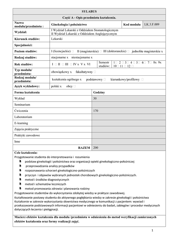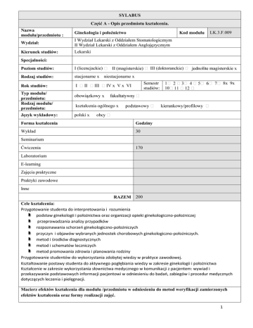 SYLABUS Część A - Opis przedmiotu kształcenia. Nazwa modułu/przedmiotu : Ginekologia i położnictwo Wydział: I Wydział Lekarski z Oddziałem Stomatologicznym II Wydział Lekarski z Oddziałem Anglojęzycznym Kierunek studiów: Lekarski Kod modułu LK.3.F.009 Specjalności: Poziom studiów: I (licencjackie) Rodzaj studiów: stacjonarne x Rok studiów: I Typ modułu/ przedmiotu: Rodzaj modułu/ przedmiotu: II III III (doktoranckie) niestacjonarne x Semestr studiów: IV x V x VI 8x 9x 10 kształcenia ogólnego x Język wykładowy: Forma kształcenia Godziny Wykład 30 Seminarium Ćwiczenia 170 Laboratorium E-learning Zajęcia praktyczne Praktyki zawodowe Inne RAZEM 200 Cele kształcenia: Przygotowanie studenta do interpretowania i rozumienia podstaw ginekologii i położnictwa oraz organizacji opieki ginekologiczno-położniczej przeprowadzania analizy przypadków rozpoznawania schorzeń ginekologiczno-położniczych przyczyn i objawów wybranych jednostek chorobowych ginekologiczno-położniczych. metod i środków diagnostycznych metod i schematów leczniczych metod promowania zdrowia i planowania rodziny Przygotowanie studentów do wykorzystania zdobytej wiedzy w praktyce zawodowej. Kształtowanie postawy studenta do aktywnego pogłębiania wiedzy w zakresie ginekologii i położnictwa Kształcenie w zakresie wykorzystania słownictwa medycznego w komunikacji z pacjentem: wywiad i przekazywanie podstawowych informacji pacjentowi w odniesieniu do badań, zabiegów i procedur medycznych dotyczących leczenia i pielęgnacji. Macierz efektów kształcenia dla modułu /przedmiotu w odniesieniu do metod weryfikacji zamierzonych efektów kształcenia oraz formy realizacji zajęć. 1 Numer efektu kształcenia Student, który zaliczy moduł ( przedmiot) wie/umie/potrafi: Metody weryfikacji osiągnięcia zamierzonych efektów kształcenia: Forma zajęć dydaktycznych * wpisz symbol W01 zna podstawowe psychologiczne mechanizmy funkcjonowania człowieka w zdrowiu i w chorobie Arkusz weryfikacji wiedzy Ć, ZP, W02 zna podstawowe sposoby diagnostyki i terapii płodu Arkusz weryfikacji wiedzy Ć, ZP, zna podstawy wczesnej wykrywalności nowotworów i zasady badań przesiewowych w onkologii Arkusz weryfikacji wiedzy Ć, ZP, W zna i rozumie przyczyny, objawy, zasady diagnozowania i postępowania terapeutycznego Arkusz weryfikacji w najczęstszych chorobach przenoszonych wiedzy drogą płciową Ć, ZP, W W03 W04 zna funkcje rozrodcze kobiety, zaburzenia z nimi związane oraz postępowanie diagnostyczne i terapeutyczne, dotyczące w szczególności: cyklu miesiączkowego i jego zaburzeń, ciąży, W05 porodu fizjologicznego i patologicznego oraz połogu, zapaleń i nowotworów w obrębie narządów płciowych, Arkusz weryfikacji wiedzy Ć, ZP, W Arkusz zaliczenia umiejętności Ć, ZP, regulacji urodzeń, menopauzy, podstawowych metod diagnostyki i zabiegów ginekologicznych U01 identyfikuje wskazania do wykonania badań prenatalnych 2 U02 ocenia stan noworodka w skali Apgar oraz ocenia jego dojrzałość, bada odruchy noworodkowe Arkusz zaliczenia umiejętności Ć, ZP, U03 ocenia stopień zaawansowania dojrzewania płciowego Arkusz zaliczenia umiejętności Ć, ZP, U04 prowadzi dokumentację medyczną pacjenta Arkusz zaliczenia umiejętności Ć, ZP, U05 zaopatruje krwawienie zewnętrzne Arkusz zaliczenia umiejętności Ć, ZP, rozpoznaje objawy podmiotowe i przedmiotowe świadczące o nieprawidłowym przebiegu ciąży (nieprawidłowe krwawienia, czynność skurczową macicy) Arkusz zaliczenia umiejętności Ć, ZP, interpretuje wyniki badania fizykalnego ciężarnej (ciśnienie tętnicze, czynność serca matki płodu) oraz wyniki badań laboratoryjnych świadczących o patologiach ciąży Arkusz zaliczenia umiejętności Ć, ZP, U08 interpretuje zapis kardiotokografii (KTG) Arkusz zaliczenia umiejętności Ć, ZP, U09 rozpoznaje rozpoczynający się poród oraz nieprawidłowy czas jego trwania Arkusz zaliczenia umiejętności Ć, ZP U10 interpretuje objawy podmiotowe i przedmiotowe w czasie połogu Arkusz zaliczenia umiejętności Ć, ZP U11 ustala zalecenia, wskazania i przeciwwskazania dotyczące stosowania metod antykoncepcji Arkusz zaliczenia umiejętności Ć, ZP U06 U07 3 K01 K02 K03 K04 K05 K06 K07 Wykazuje kreatywność w zespole podczas prowadzenia dokumentacji medycznej pacjenta Arkusz umiejętności i kompetencji Ć, ZP Aktywnie uczestniczy w postępowaniu diagnostycznym i terapeutycznym Arkusz umiejętności i kompetencji Arkusz umiejętności i kompetencji Ć, ZP Przestrzega praw pacjenta Ć, ZP Przestrzega tajemnicy lekarskiej Arkusz umiejętności i kompetencji Ć, ZP Szanuje godność i autonomię pacjentów oraz okazuje zrozumienie różnic światopoglądowych i kulturowych Arkusz umiejętności i kompetencji Ć, ZP Przejawia empatię w relacji z pacjentem i jego rodziną oraz współpracownikami Arkusz umiejętności i kompetencji Arkusz umiejętności i kompetencji Systematycznie aktualizuje wiedzę zawodową i kształtuje swoje umiejętności dążąc do profesjonalizmu Ć, ZP Ć, ZP …….. * W- wykład; S- seminarium; Ć- ćwiczenia; L- laboratorium; EL- e-learning; ZP- zajęcia praktyczne; PZ- praktyka zawodowa; Proszę oznaczyć krzyżykami w skali 1-3 jak powyższe efekty lokują państwa zajęcia w działach: przekaz wiedzy, umiejętności czy kształtowanie postaw np.: Wiedza + Umiejętności + ++ Postawy ++ Nakład pracy studenta (bilans punktów ECTS) Forma nakładu pracy studenta Obciążenie studenta (h) (udział w zajęciach, aktywność, przygotowanie sprawdzenie, itp.) 1. Godziny kontaktowe 200 2. Czas pracy własnej studenta 130 Sumaryczne obciążenie pracy studenta 330 Punkty ECTS za moduł/przedmiotu 11 Uwagi Treść zajęć: ( proszę wpisać hasłowo tematykę poszczególnych zajęć, pamiętając, aby przekładała się ona na zamierzone efekty kształcenia Wykłady: 1. Krwotok poporodowy 2. Nadciśnienie tętnicze w ciąży 3. Poród przedwczesny 4. Ci