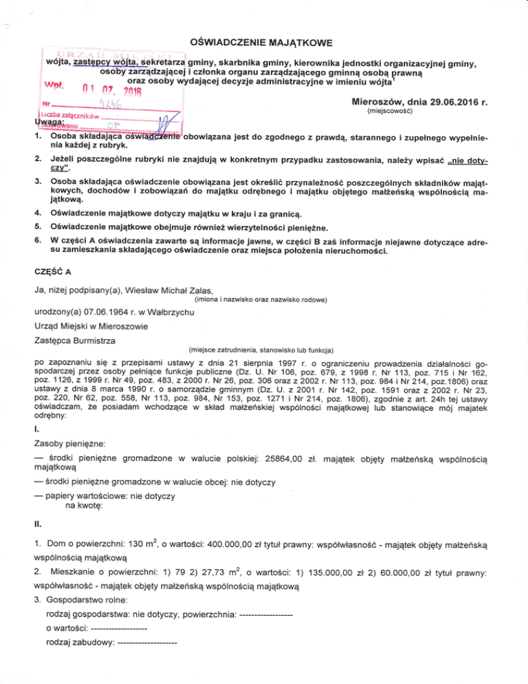 OSWIADCZENIE MAJĄTKOWE i.,f WDł. fl t §ekrót_arza gminy, skarbnika gminy, kierownika jednostki organizacyjnej gminy, j rawn ą ącej i czło n ka o rg a n u zaządzĄąc" g o g TTl:ą,.os.o.bą_ę n? oraz osoby wydającej decyzje administracyjne w imieniu wójta 7nln Mieroszów, dnia 29.06.2016 (miejscowość) Lczba aĘczników r. 1. Osoba 2. JeŻeli poszczególne rubryki nie znajdują w konkretnym pzypadku zastosowania, należy wpisać ..nie dotvczy''. 3, obowiązana jest do zgodnego z prawdą, starannego i zupełnego wypełnie- nia każdej z rubryk. Osoba składająca oświadczenie obowiązana jest określićprzynależnośćposzczególnych składników majątkowych, dochodów i zobowlązań do majątku odrębnego i majątku objętego małżeńską wspólnością ńa- jątkową, 4. 5. 6, Oświadczenie majątkowe dotyczy majątku w kraju iza granicą. Oświadczenie majątkowe obejmuje również wierzytelności pieniężne. W częŚci A oŚwiadczenia zawańe są informacje jawne, w częściB zaśinformacje niejawne dotyczące adresu zamieszkania składającego oświadczenieoraz miejsca położenia nieruchomości. czĘŚĆ A Ja, nizej podpisany(a), Wiesław Michał Zalas, (imiona i nazwisko oraz nazwisko rodowe) urodzony(a) 07.06, 1 964 r. w Wałbrzychu Urząd Miejski w Mieroszowie Zastępca Burmistza Po za?oznaniu się z (miejsce zatrudnienia, stanowisko lub funkcja) przepisami ustawy z dnia 2'1 sierpnia 1997 r. o ograniczeniu prowadzenia działalnościgo- spodarczej przez osoby pełniące funkcje publiczne (Dz. U. Nr 106, poz,679, z 1998 r. Nr 113, poz.715 iNr 1Ó2, Poz,1126, z 1999 r. Nr49, poz.483,z2000 r. Nr26, poz,306 orazz2002r. Nr 113, poz.984 iNr214, poz.1806) oraz ustawy z dnia 8 marca 1990 r. o samorządzie gminnym (Dz. U. z 2001 r. Nr 142, poz. 1591 oraz z 2OO2 r. Nr 23, Poz, 220, Nr 62, poz, 558, Nr 113, poz. 984, Nr 153, poz. 1271 i Nr 214, poz. 1806), zgodnie z art.24h tej ustawy oŚwiadczam, że posiadam wchodzące w skład małżeńskiej wspólności majątkowej lub stanowiące mój majatek odrębny: !. Zasoby pienięzne: Środki pienięzne gromadzone -majątkową w walucie polskiej: 25864,00 zł, majątek objęty małzeńską wspólnością środkipienięzne gromadzone w walucie obcej: nie dotyczy - papiery wańościowe: nie dotyczy na kwotę: ll. 1 . Dom o powierzchni: 130 m2, o wartości: 400.000,00 zł tytuł prawny: współwłasność- majątek objęty małzeńską wspólnością majątkową 2. Mieszkanie o powierzchni: 1) 79 2) 27,73 m2, o wartości:1) ,135,0o0,oo zł 2) 60.000,00 zł tytuł prawny: współwłasnośó - majątek objęty małzeńską wspólnością majątkową 3. Gospodarstwo rolne: rodza1 gos poda rstwa : o Wańości: rodzĄ zabudowy: n i e dotyczy, powierzch n i a: tytuł prawny: ---------------- Ztego tytułu osiągnąłem(ęłam)w roku ubiegłym przychód 4. i dochod w wysokości: lnne nieruchomości: powierzchn a: działka g ru ntowa. i 1 . ---------- 3678 ha o wańości:80.0000,00 zł tytuł prawny: współwłasnośó- majątek objęty małzeńską wspolnością majątkową IlI. Posiadam udziały w spółkach handlowych nie dotyczy - należy podać liczbę i emitenta udziałów: udziały te stanowią pakiet większy niż 10% udziałów w społce: Z tego tytułu osiągnąłem(ęłam) w roku ubiegłym dochód w wysokości: lV. Posiadam akcje w spółkach handlowych nie dotyczy - nalezy podać liczbę i emitenta akcji: akcje te stanowią pakiet większy niż 10o/o akcji w spółce: Z tego tytułu osiągnąłem(ęłam) w roku ubiegłym dochód w wysokości: V. Nabyłem(am) (nabył mój małzonek, z wyłączeniem mienia przynależnego do jego majątku odrębnego) od Skarbu Państwa, innej państwowej osoby prawnej, jednostek samoządu terytorialnego, ich związkow lub od komunalnej osoby prawnej następujące mienie, które podlegało zbyciu w drodze przetargu _ nalezy podaó opis mienia i datę nabycia, od kogo: nie dotyczy Vl. '1. Prowadzę działalnośógospodarczą2 (naleZy podać formę prawną i przedmiot działalności):nie dotyczy - osobiście wspólnie z innymi osobami Ztego tytułu osiągnąłem(ęłam) w roku ubiegłym dochód w wysokości: 2. Zarządzam działalnościągospodarczą lub jestem przedstawicielem, pełnomocnikiem takiej działalności (nalezy podać formę prawną i przedmiot działalności): nie dotyczy - osobiście wspólnie z innymi osobami Ztego tytułu osiągnąłem(ęłam) w roku ubiegłym dochód w wysokości: VlI. 1. W spółkach handlowych (nazwa, siedziba spółki): nie dotyczy - jestem członkiem zarządu (od kiedy): jestem członkiem rady nadzorczej (od kiedy): jestem członkiem komisji rewizyjnej (od kiedy): Z tego tytułu osiągnąłem(ęłam) w roku ubiegłym dochód w wysokości: 2. W spółdzielniach: nie dotyczy - jestem członkiem zarządu (od kiedy): - jestem członkiem rady nadzorcze.|3 (od kiedy): jestem członkiem komisji rewizyjnej (od kiedy): Z tego tytułu osiągnąłem(ęłam) w roku ubiegłym dochod w wysokości: 3. W fundacjach prowadzących działalnośćgospodarczą: nie dotyczy - jestem członkiem zarządu (od kiedy): jestem członkiem rady nadzorczej (od kiedy): jestem członkiem komisji rewizyjnej (od kiedy): Z tego tytułu osiągnąłem(ęłam) w roku ubiegłym dochód w wysokości: Vlll. lnne.dochody osiągane z tytułu zatrudnienia lub innej działalnościzarobkowej lub zajęć, z podaniem kwot uzYskiwanYch z kazdego tytułu: 1) dochód ztytułu zatrudnienia w Urzędzie Miejs(im w Mióioszowie 51508,12 zł. 2) dochÓd małzonki z tytułu zatrudnienia 17286,87 zł - majątek objęty małżeńskąwspólnością majątkową lx" Składniki mienia ruchomego o wartościpowyzej 1O Ooo złotych (w przypadku pojazdów mechanicznych nalezy PodaÓ markę, model i rok produkcji): samochód osobowy - Volkswagen Óora, rok piodukcji2oo2 - malątek objęty małzeńską wspólnością majątkową x. Zob.owiązania pienięzne o wańości powyzej 1O OOO złotych, w tym zaciągnięte kredyty i pożyczki 