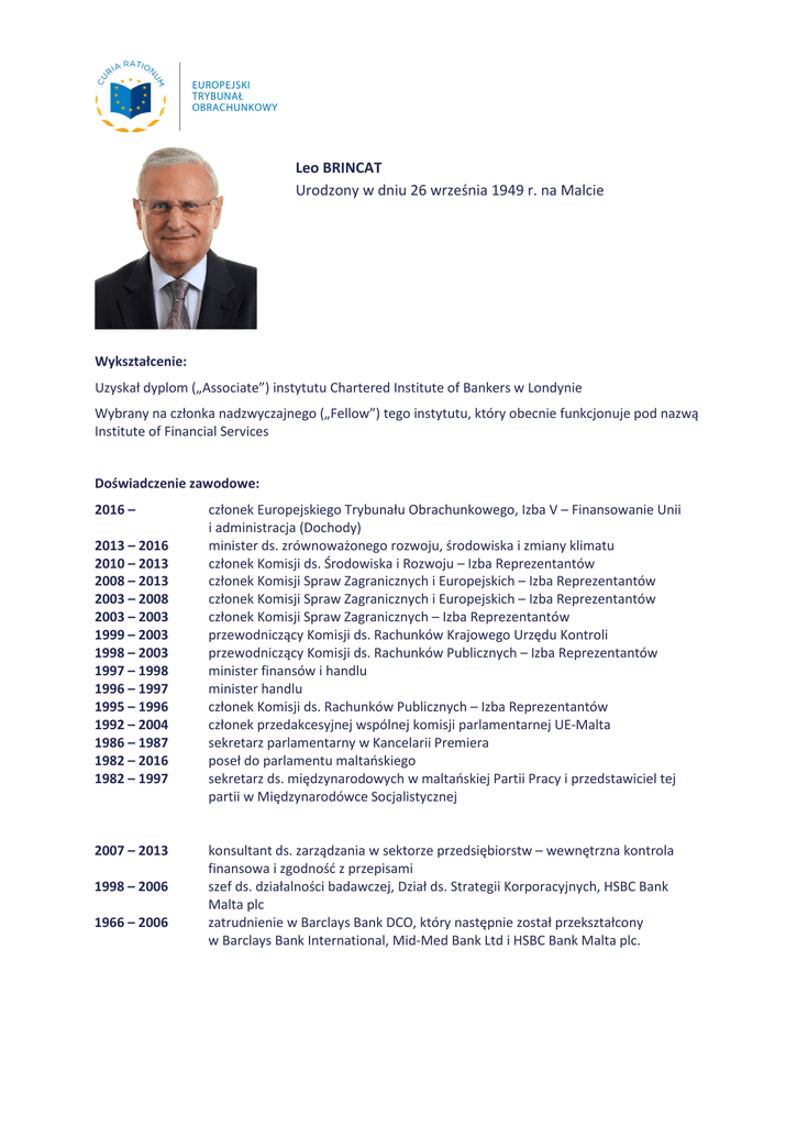 Leo BRINCAT Urodzony w dniu 26 września 1949 r. na Malcie Wykształcenie: Uzyskał dyplom („Associate”) instytutu Chartered Institute of Bankers w Londynie Wybrany na członka nadzwyczajnego („Fellow”) tego instytutu, który obecnie funkcjonuje pod nazwą Institute of Financial Services Doświadczenie zawodowe: 2016 – 2013 – 2016 2010 – 2013 2008 – 2013 2003 – 2008 2003 – 2003 1999 – 2003 1998 – 2003 1997 – 1998 1996 – 1997 1995 – 1996 1992 – 2004 1986 – 1987 1982 – 2016 1982 – 1997 2007 – 2013 1998 – 2006 1966 – 2006 członek Europejskiego Trybunału Obrachunkowego, Izba V – Finansowanie Unii i administracja (Dochody) minister ds. zrównoważonego rozwoju, środowiska i zmiany klimatu członek Komisji ds. Środowiska i Rozwoju – Izba Reprezentantów członek Komisji Spraw Zagranicznych i Europejskich – Izba Reprezentantów członek Komisji Spraw Zagranicznych i Europejskich – Izba Reprezentantów członek Komisji Spraw Zagranicznych – Izba Reprezentantów przewodniczący Komisji ds. Rachunków Krajowego Urzędu Kontroli przewodniczący Komisji ds. Rachunków Publicznych – Izba Reprezentantów minister finansów i handlu minister handlu członek Komisji ds. Rachunków Publicznych – Izba Reprezentantów członek przedakcesyjnej wspólnej komisji parlamentarnej UE-Malta sekretarz parlamentarny w Kancelarii Premiera poseł do parlamentu maltańskiego sekretarz ds. międzynarodowych w maltańskiej Partii Pracy i przedstawiciel tej partii w Międzynarodówce Socjalistycznej konsultant ds. zarządzania w sektorze przedsiębiorstw – wewnętrzna kontrola finansowa i zgodność z przepisami szef ds. działalności badawczej, Dział ds. Strategii Korporacyjnych, HSBC Bank Malta plc zatrudnienie w Barclays Bank DCO, który następnie został przekształcony w Barclays Bank International, Mid-Med Bank Ltd i HSBC Bank Malta plc.