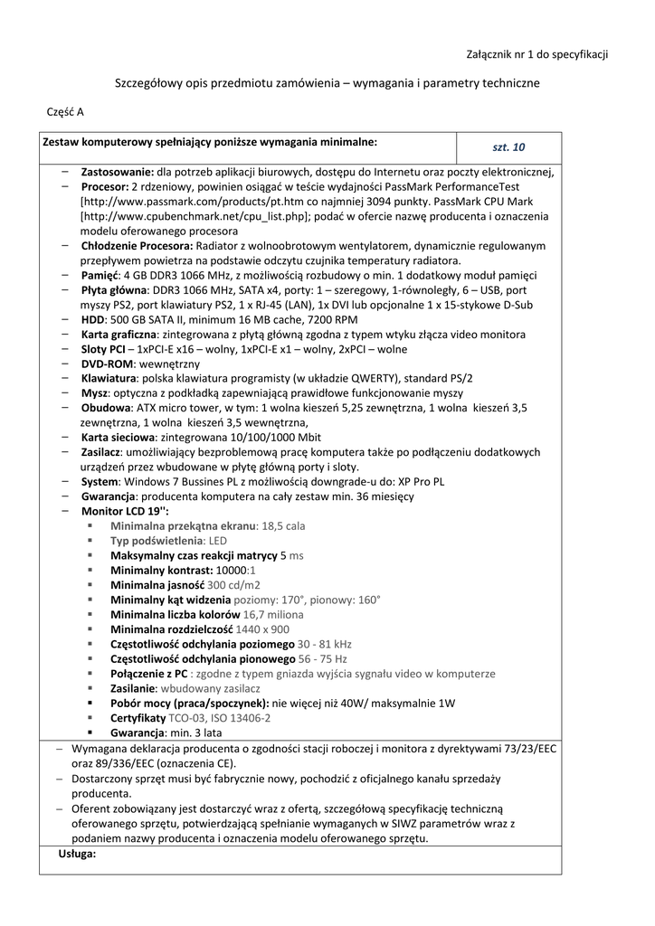 Załącznik nr 1 do specyfikacji Szczegółowy opis przedmiotu zamówienia – wymagania i parametry techniczne Część A Zestaw komputerowy spełniający poniższe wymagania minimalne: szt. 10 Zastosowanie: dla potrzeb aplikacji biurowych, dostępu do Internetu oraz poczty elektronicznej, Procesor: 2 rdzeniowy, powinien osiągać w teście wydajności PassMark PerformanceTest [http://www.passmark.com/products/pt.htm co najmniej 3094 punkty. PassMark CPU Mark [http://www.cpubenchmark.net/cpu_list.php]; podać w ofercie nazwę producenta i oznaczenia modelu oferowanego procesora − Chłodzenie Procesora: Radiator z wolnoobrotowym wentylatorem, dynamicznie regulowanym przepływem powietrza na podstawie odczytu czujnika temperatury radiatora. − Pamięć: 4 GB DDR3 1066 MHz, z możliwością rozbudowy o min. 1 dodatkowy moduł pamięci − Płyta główna: DDR3 1066 MHz, SATA x4, porty: 1 – szeregowy, 1-równoległy, 6 – USB, port myszy PS2, port klawiatury PS2, 1 x RJ-45 (LAN), 1x DVI lub opcjonalne 1 x 15-stykowe D-Sub − HDD: 500 GB SATA II, minimum 16 MB cache, 7200 RPM − Karta graficzna: zintegrowana z płytą główną zgodna z typem wtyku złącza video monitora − Sloty PCI – 1xPCI-E x16 – wolny, 1xPCI-E x1 – wolny, 2xPCI – wolne − DVD-ROM: wewnętrzny − Klawiatura: polska klawiatura programisty (w układzie QWERTY), standard PS/2 − Mysz: optyczna z podkładką zapewniającą prawidłowe funkcjonowanie myszy − Obudowa: ATX micro tower, w tym: 1 wolna kieszeń 5,25 zewnętrzna, 1 wolna kieszeń 3,5 zewnętrzna, 1 wolna kieszeń 3,5 wewnętrzna, − Karta sieciowa: zintegrowana 10/100/1000 Mbit − Zasilacz: umożliwiający bezproblemową pracę komputera także po podłączeniu dodatkowych urządzeń przez wbudowane w płytę główną porty i sloty. − System: Windows 7 Bussines PL z możliwością downgrade-u do: XP Pro PL − Gwarancja: producenta komputera na cały zestaw min. 36 miesięcy − Monitor LCD 19'': Minimalna przekątna ekranu: 18,5 cala Typ podświetlenia: LED Maksymalny czas reakcji matrycy 5 ms Minimalny kontrast: 10000:1 Minimalna jasność 300 cd/m2 Minimalny kąt widzenia poziomy: 170°, pionowy: 160° Minimalna liczba kolorów 16,7 miliona Minimalna rozdzielczość 1440 x 900 Częstotliwość odchylania poziomego 30 - 81 kHz Częstotliwość odchylania pionowego 56 - 75 Hz Połączenie z PC : zgodne z typem gniazda wyjścia sygnału video w komputerze Zasilanie: wbudowany zasilacz Pobór mocy (praca/spoczynek): nie więcej niż 40W/ maksymalnie 1W Certyfikaty TCO-03, ISO 13406-2 Gwarancja: min. 3 lata − Wymagana deklaracja producenta o zgodności stacji roboczej i monitora z dyrektywami 73/23/EEC oraz 89/336/EEC (oznaczenia CE). − Dostarczony sprzęt musi być fabrycznie nowy, pochodzić z oficjalnego kanału sprzedaży producenta. − Oferent zobowiązany jest dostarczyć wraz z ofertą, szczegółową specyfikację techniczną oferowanego sprzętu, potwierdzającą spełnianie wymaganych w SIWZ parametrów wraz z podaniem nazwy producenta i oznaczenia modelu oferowanego sprzętu. Usługa: − − 1. Sprzęt należy dostarczyć, skonfigurować i zainstalować w sieciach komputerowych w jednostkach organizacyjnych Ośrodka. 2. Dysk powinien być podzielony na trzy partycje. 3. Trzecia partycja nie powinna być sformatowana. 4. Dwie partycje należy sformatować jako NTFS. 5. Na komputerach należy zainstalować System Windows XP (konfigurację przekaże pracownik Działu Analiz i Informatyki). 6. Na komputerach należy zainstalować program MSOffice dostarczony w ramach przetargu. 7. Na komputerach należy zainstalować wszystkie najnowsze poprawki programów: Windows, Internet Explorer, Office. 8. Na komputerach należy zainstalować najnowsze wersje sterowników 9. System nie może być zainstalowany poprzez przekopiowanie obrazu dysku. Program należy zaktywować. 10. Komputery nie mogą być zabezpieczone plombami – musi istnieć możliwość rozbudowy sprzętu we własnym zakresie. 11. Należy dostarczyć dokumentację opisującą konfigurację zainstalowanego sprzętu i oprogramowania. Monochromatyczne drukarki laserowe spełniające minimalne wymagania techniczne: Szybkość druku (A4, w czerni) Druk dwustronny 48str./min Szybkość druku dwustronnego (A4, w czerni) Szybkość drukowania (Letter, czarny) Szybkość druku dwustronnego (Letter, mono) Maksymalny czas wydruku pierwszej strony (w czerni) Rozdzielczość druku (w czerni) 32str./min Procesor Pamięć, standardowo Pamięć, maksymalnie Opcje rozszerzenia pamięci Citrix MetaFrame Obsługiwane systemy operacyjne Linux Sztuk: 5 Automatyczny 50str./min 34str./min 7.5 sekundy 1200 IQ 1200 x 1200 dpi 2400 IQ 600 x 600 dpi 500 MHz 128 MB 640 MB Tak Citrix Presentation Server 3.0, 4.0 Microsoft Windows 2003 Server z usługami terminalowymi i programem Citrix Presentation Server 3.0, 4.0, 4.5 Microsoft Windows Server 2003 x64 z usługami terminalowymi i programem Citrix Presentation Server 4.0 x64, 4.5 x64 Red Hat Enterprise Linux WS 3.0, 4.0, 5.0 SUSE Linux Enterprise Server 8.0, 9.0, 10, 11 SUSE Linux Enterprise Desktop 10 openSUSE 10.2, 10.3, 11.0, 11.1 Red Flag Linux Desktop 5.0, 6.0 SUSE Linux Enterprise Desktop 11 Obsługiwane systemy operacyjne Microsoft Windows Obsługiwane systemy operacyjne Novell Obsługa papieru Minimalna Standardowa pojemność podajników Maksymalna możliwa pojemność podajników – co najmniej do Standardowa pojemność odbiorników Maksymalna możliwa pojemność odbiorników – co najmniej do Minimalna pojemność podajnika kopert Liczba podajników Maksymalna możliwa liczba podajników – co najmniej Obsługiwane rodzaje nośników Microsoft Windows XP Microsoft Windows Server 2003 Microsoft Windows XP x64 Microsoft Windows Server 2003 z usługami terminalowymi Microsoft Windows 2000 Server z usługami terminalowymi Microsoft Windows Server 2003 x64 Microsoft Windows Server 2003 x64 z usługami terminalowymi Microsoft Windows Vis