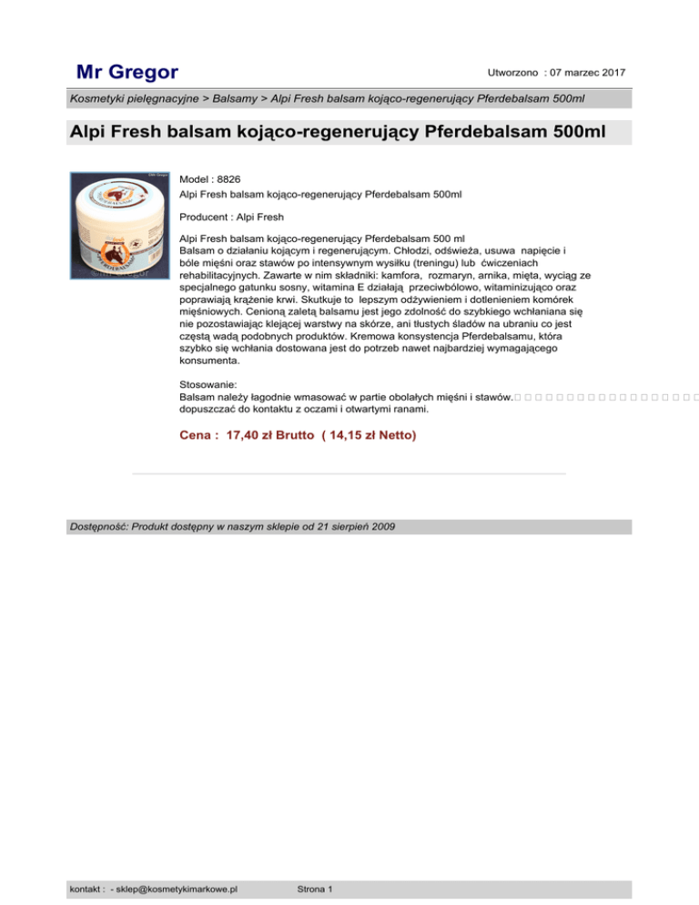 Mr Gregor Utworzono : 07 marzec 2017 Kosmetyki pielęgnacyjne > Balsamy > Alpi Fresh balsam kojąco-regenerujący Pferdebalsam 500ml Alpi Fresh balsam kojąco-regenerujący Pferdebalsam 500ml Model : 8826 Alpi Fresh balsam kojąco-regenerujący Pferdebalsam 500ml Producent : Alpi Fresh Alpi Fresh balsam kojąco-regenerujący Pferdebalsam 500 ml Balsam o działaniu kojącym i regenerującym. Chłodzi, odświeża, usuwa napięcie i bóle mięśni oraz stawów po intensywnym wysiłku (treningu) lub ćwiczeniach rehabilitacyjnych. Zawarte w nim składniki: kamfora, rozmaryn, arnika, mięta, wyciąg ze specjalnego gatunku sosny, witamina E działają przeciwbólowo, witaminizująco oraz poprawiają krążenie krwi. Skutkuje to lepszym odżywieniem i dotlenieniem komórek mięśniowych. Cenioną zaletą balsamu jest jego zdolność do szybkiego wchłaniana się nie pozostawiając klejącej warstwy na skórze, ani tłustych śladów na ubraniu co jest częstą wadą podobnych produktów. Kremowa konsystencja Pferdebalsamu, która szybko się wchłania dostowana jest do potrzeb nawet najbardziej wymagającego konsumenta. Stosowanie: Balsam należy łagodnie wmasować w partie obolałych mięśni i stawów. dopuszczać do kontaktu z oczami i otwartymi ranami. Cena : 17,40 zł Brutto ( 14,15 zł Netto) Dostępność: Produkt dostępny w naszym sklepie od 21 sierpień 2009 kontakt : - [email protected] Strona 1
