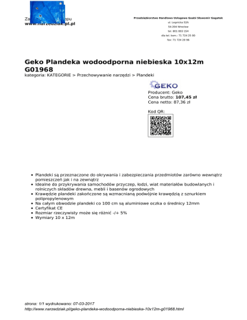 Zapraszamy do sklepu www.narzedziak.pl.pl Przedsiębiorstwo Handlowo Usługowe Gaabi Sławomir Gagatek ul. Legnicka 52A 54-204 Wrocław tel. 801 003 154 dla tel. kom.: 71 724 25 00 fax: 71 724 20 96 Geko Plandeka wodoodporna niebieska 10x12m G01968 kategoria: KATEGORIE > Przechowywanie narzędzi > Plandeki Producent: Geko Cena brutto: 107,45 zł Cena netto: 87,36 zł Kod QR: Plandeki są przeznaczone do okrywania i zabezpieczania przedmiotów zarówno wewnątrz pomieszczeń jak i na zewnątrz Idealne do przykrywania samochodów przyczep, łodzi, wiat materiałów budowlanych i rolniczych składów drewna, mebli i basenów ogrodowych Krawędzie plandeki zakończone są wzmacnianą podwójnie krawędzią z sznurkiem polipropylenowym Na całym obwodzie plandeki co 100 cm są aluminiowe oczka o średnicy 12mm Certyfikat CE Rozmiar rzeczywisty może się różnić -/+ 5% Wymiary 10 x 12m strona: 1/1 wydrukowano: 07-03-2017 http://www.narzedziak.pl/geko-plandeka-wodoodporna-niebieska-10x12m-g01968.html