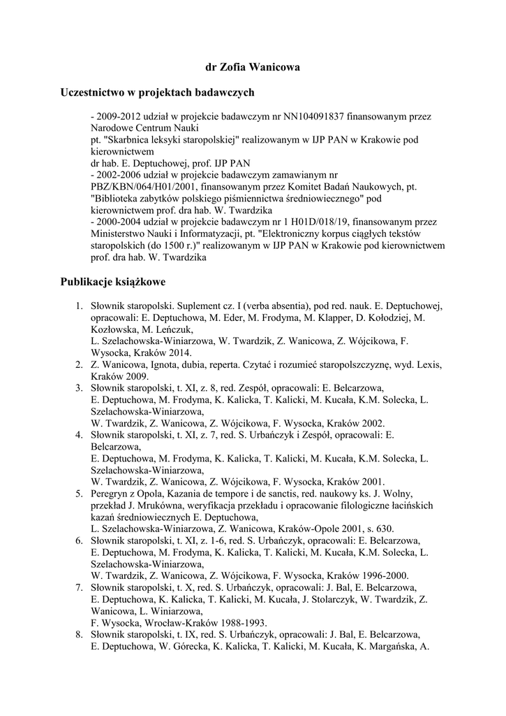 dr Zofia Wanicowa Uczestnictwo w projektach badawczych - 2009-2012 udział w projekcie badawczym nr NN104091837 finansowanym przez Narodowe Centrum Nauki pt. "Skarbnica leksyki staropolskiej" realizowanym w IJP PAN w Krakowie pod kierownictwem dr hab. E. Deptuchowej, prof. IJP PAN - 2002-2006 udział w projekcie badawczym zamawianym nr PBZ/KBN/064/H01/2001, finansowanym przez Komitet Badań Naukowych, pt. "Biblioteka zabytków polskiego piśmiennictwa średniowiecznego" pod kierownictwem prof. dra hab. W. Twardzika - 2000-2004 udział w projekcie badawczym nr 1 H01D/018/19, finansowanym przez Ministerstwo Nauki i Informatyzacji, pt. "Elektroniczny korpus ciągłych tekstów staropolskich (do 1500 r.)" realizowanym w IJP PAN w Krakowie pod kierownictwem prof. dra hab. W. Twardzika Publikacje książkowe 1. Słownik staropolski. Suplement cz. I (verba absentia), pod red. nauk. E. Deptuchowej, opracowali: E. Deptuchowa, M. Eder, M. Frodyma, M. Klapper, D. Kołodziej, M. Kozłowska, M. Leńczuk, L. Szelachowska-Winiarzowa, W. Twardzik, Z. Wanicowa, Z. Wójcikowa, F. Wysocka, Kraków 2014. 2. Z. Wanicowa, Ignota, dubia, reperta. Czytać i rozumieć staropolszczyznę, wyd. Lexis, Kraków 2009. 3. Słownik staropolski, t. XI, z. 8, red. Zespół, opracowali: E. Belcarzowa, E. Deptuchowa, M. Frodyma, K. Kalicka, T. Kalicki, M. Kucała, K.M. Solecka, L. Szelachowska-Winiarzowa, W. Twardzik, Z. Wanicowa, Z. Wójcikowa, F. Wysocka, Kraków 2002. 4. Słownik staropolski, t. XI, z. 7, red. S. Urbańczyk i Zespół, opracowali: E. Belcarzowa, E. Deptuchowa, M. Frodyma, K. Kalicka, T. Kalicki, M. Kucała, K.M. Solecka, L. Szelachowska-Winiarzowa, W. Twardzik, Z. Wanicowa, Z. Wójcikowa, F. Wysocka, Kraków 2001. 5. Peregryn z Opola, Kazania de tempore i de sanctis, red. naukowy ks. J. Wolny, przekład J. Mrukówna, weryfikacja przekładu i opracowanie filologiczne łacińskich kazań średniowiecznych E. Deptuchowa, L. Szelachowska-Winiarzowa, Z. Wanicowa, Kraków-Opole 2001, s. 630. 6. Słownik staropolski, t. XI, z. 1-6, red. S. Urbańczyk, opracowali: E. Belcarzowa, E. Deptuchowa, M. Frodyma, K. Kalicka, T. Kalicki, M. Kucała, K.M. Solecka, L. Szelachowska-Winiarzowa, W. Twardzik, Z. Wanicowa, Z. Wójcikowa, F. Wysocka, Kraków 1996-2000. 7. Słownik staropolski, t. X, red. S. Urbańczyk, opracowali: J. Bal, E. Belcarzowa, E. Deptuchowa, K. Kalicka, T. Kalicki, M. Kucała, J. Stolarczyk, W. Twardzik, Z. Wanicowa, L. Winiarzowa, F. Wysocka, Wrocław-Kraków 1988-1993. 8. Słownik staropolski, t. IX, red. S. Urbańczyk, opracowali: J. Bal, E. Belcarzowa, E. Deptuchowa, W. Górecka, K. Kalicka, T. Kalicki, M. Kucała, K. Margańska, A. Sikora, L. Sowa, W. Twardzik, Z. Wanicowa, L. Winiarzowa, F. Wysocka, J. ZamościńskaKucałowa, Wrocław 1982-1987. 9. Słownik staropolski, t. VIII, red. S. Urbańczyk, opracowali: J. Bal, E. Belcarzowa, E. Deptuchowa, W. Górecka, D. Janeczkowa, K. Kalicka, T. Kalicki, M. Kucała, K. Margańska, W. Twardzik, Z. Wanicowa, L. Winiarzowa, F. Wysocka, J. Zamościńska-Kucałowa, Wrocław 1977-1981. 10. Słownik staropolski, t. VII, red. S. Urbańczyk, opracowali: J. Bal, E. Belcarzowa, E. Deptuchowa, W. Górecka, K. Kalicka, T. Kalicki, M. Kucała, K. Margańska, J. Reczek, H. Safarewiczowa, K. Solecka, T. Stanek, W. Twardzik, Z. Wanicowa, L. Winiarzowa, F. Wysocka, J. Zamościńska-Kucałowa, Wrocław 1973-1977. 11. Słownik staropolski, t. VI, red. S. Urbańczyk, opracowali: J. Bal, E. Belcarzowa, W. Boryś, S. Dobeszowa, E. Deptuchowa, W. Górecka, K. Kalicka, T. Kalicki, M. Kucała, W. Namysłowska, J. Reczek, H. Safarewiczowa, T. Stanek, L. Szelachowska-Winiarzowa, W. Twardzik, Z. Wanicowa, F. Wysocka, Wrocław 1970-1973. Artykuły 1. Warsztat leksykografa - historyka. Uwagi metodologiczne (artykuł przyjęty do druku). 2. Rektyfikacja czy nowa lekcja zapisu przytrzconymy w Rozmyślaniu przemyskim? (artykuł przyjęty do druku). 3. Czy rajski przebyt z Bogurodzicy można łączyć z doktryną Jana Szkota Eriugeny?, Roczniki Humanistyczne LXII, z. 6, Językoznawstwo, Lublin 2014, s. 173-181. 4. Skarbnica leksyki staropolskiej, Język Polski XCIV (2014), s.250-264, (wraz z E. Deprtuchową, M. Frodymą, L. Szelachowską-Winiarzową, F. Wysocką). 5. Staropolskie zamyślenia. Czy właściwie rozpoznajemy formy gramatyczne w tekstach źródłowych?, Język Polski XCII (2012), s.92-101. 6. Mechanizm błędów translacyjnych w Biblii Królowej Zofii a spór o podstawę jej przekładu, [w:] Tekst staropolski w badaniach, dydaktyce i edycji. Językoznawstwo nr 4, Łódź 2010, s.13-35. 7. Tajemnice staropolskich glos, LingVaria V (2010), nr 2 (10), s. 105-111 (wraz z E. Deptuchową). 8. Spór o bożyca, [w:] Język polski - wczoraj, dziś, jutro, pod red. B. Czopek-Kopciuch i P. Żmigrodzkiego, wyd. Lexis, Kraków 2010, s. 270-273. 9. Na marginesie prac nad suplementem do Słownika staropolskiego, Język Polski XL (2010), s. 16-22. 10. O zasadach manipulacji językowej słów kilka, Życie i Płodność. Kwartalnik interdyscyplinarny, Kraków 2009, nr 3, s. 75-79. 11. Z warsztatu badawczego leksykografa-historyka, Język Polski LXXXiX (2009), s. 255-262 12. Dlaczego Andrzej z Jaszowic, tłumacząc Biblię dla królowej Sonki, popełniał kardynalne błędy?, [w:] Aemonitates vel lepores philologiae, pod red. R. Laskowskiego i R. Mazurkiewicza, Kraków 2007, s. 340-345. 13. O zależności języka Biblii królowej Zofii od wzoru czeskiego, [w:] Studia historyczne ofiarowane Romanowi Marii Zawadzkiemu w 70. rocznicę urodzin, pod red. ks. J. Urbana, Kraków 2006, s. 727-759. 14. Czy św. Jan z Kęt mógł nosić nazwisko Wacięga?, [w:] Paradygmat pamięci w kulturze. Prace dedykowane Antoniemu Czyżowi, pod red. A. Borkowskiego, M. Pliszki, A. Ziontka, Siedlce 2005, s. 291-300, (wraz z R. M. Zawadzkim). 15. Wokół rozumienia 1. zwrotki Bogurodzicy, Język Polski LXXXV (2005), z. 2, s. 90102. 16. Dlaczego Bogurodzicę śpiewano w liturgicznym okresie Bożego Narodzenia?, Pami
