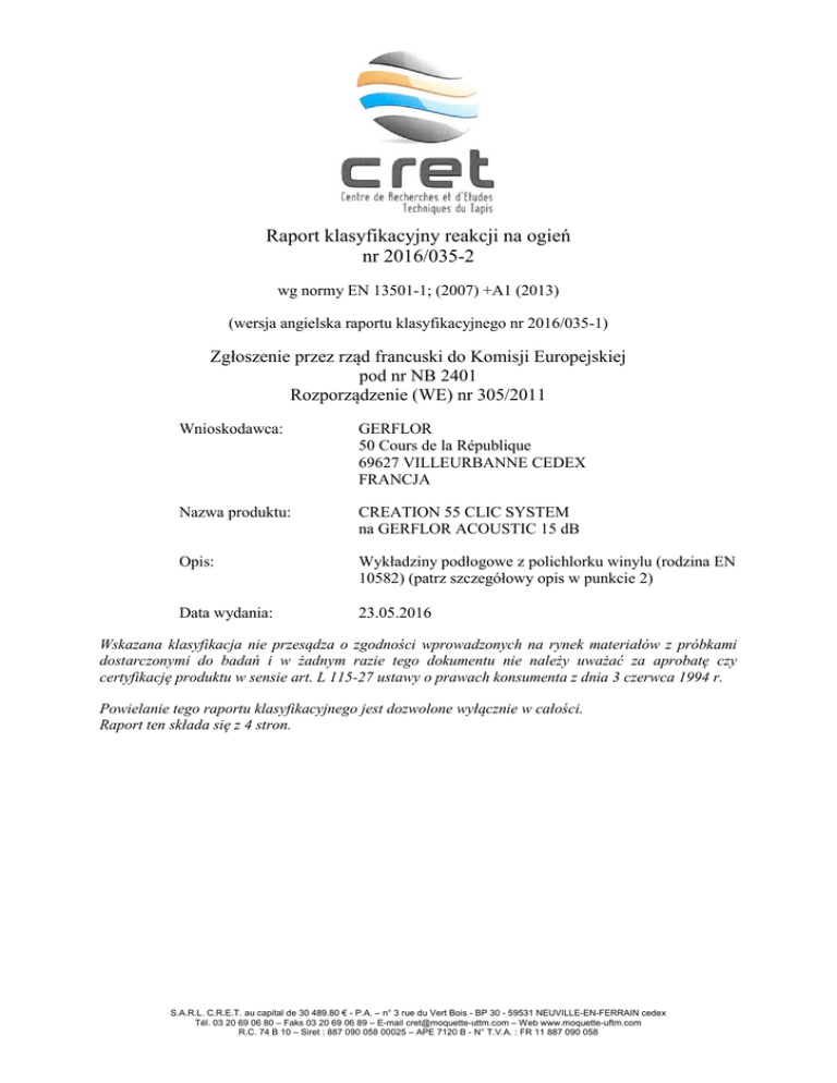 Raport klasyfikacyjny reakcji na ogień nr 2016/035-2 wg normy EN 13501-1; (2007) +A1 (2013) (wersja angielska raportu klasyfikacyjnego nr 2016/035-1) Zgłoszenie przez rząd francuski do Komisji Europejskiej pod nr NB 2401 Rozporządzenie (WE) nr 305/2011 Wnioskodawca: GERFLOR 50 Cours de la République 69627 VILLEURBANNE CEDEX FRANCJA Nazwa produktu: CREATION 55 CLIC SYSTEM na GERFLOR ACOUSTIC 15 dB Opis: Wykładziny podłogowe z polichlorku winylu (rodzina EN 10582) (patrz szczegółowy opis w punkcie 2) Data wydania: 23.05.2016 Wskazana klasyfikacja nie przesądza o zgodności wprowadzonych na rynek materiałów z próbkami dostarczonymi do badań i w żadnym razie tego dokumentu nie należy uważać za aprobatę czy certyfikację produktu w sensie art. L 115-27 ustawy o prawach konsumenta z dnia 3 czerwca 1994 r. Powielanie tego raportu klasyfikacyjnego jest dozwolone wyłącznie w całości. Raport ten składa się z 4 stron. S.A.R.L. C.R.E.T. au capital de 30 489.80 € - P.A. – n° 3 rue du Vert Bois - BP 30 - 59531 NEUVILLE-EN-FERRAIN cedex Tél. 03 20 69 06 80 – Faks 03 20 69 06 89 – E-mail [email protected] – Web www.moquette-uftm.com R.C. 74 B 10 – Siret : 887 090 058 00025 – APE 7120 B - N° T.V.A. : FR 11 887 090 058 SARL C.R.E.T. 1. Strona 2/4 Raport klasyfikacyjny nr 2016/035-2 Wprowadzenie Niniejszy raport klasyfikacyjny określa klasyfikację nadaną wyżej wymienionemu wyrobowi(om) zgodnie z procedurami podanymi w normie NF EN 13501-1: Wrzesień 2007 & A1 (2013). 2. Informacje szczegółowe dotyczące klasyfikowanego wyrobu 2.1. Norma wyrobu NF EN 14041 (2005): „Elastyczne, tekstylne i laminowane wykładziny podłogowe – właściwości podstawowe”. 2.2. Opis wyrobu Wykładziny podłogowe z polichlorku winylu (rodzina EN 10582) w rozmiarze LVT 1243,5 mm x 208,5 mm. Powierzchnia użytkowa: 100% tworzywo PVC (PCW). Masa nominalna na jednostkę powierzchni: 9770 g/m2 Nominalna grubość całkowita: 5,00 mm Nominalna grubość całkowita warstwy wierzchniej: 0,55 mm Podłoże „GERFLOR ACOUSTIC 15 dB” Masa nominalna na jednostkę powierzchni: 200 g/m2 Nominalna grubość całkowita: 0,93 mm Klasyfikacja ogniowa wg ENF EN 13501-1: Efl (Raport klasyfikacyjny CRET nr 2016/034-1) Montaż: Elastyczną wykładzinę podłogową „CREATION 55 CLIC SYSTEM” zbadano w postaci luźno położonej na podłożu „GERFLOR ACOUSTIC 15 dB”: badano razem luźno położone na płycie wiórowej bez zabezpieczenia ognioodpornego, sklasyfikowanej jako C fl-sl, o gęstości (680 ± 50) kg/m3 i grubości (20 ± 2) mm. 3. Raporty z badań i wyniki badań na poparcie niniejszej klasyfikacji 3.1. Raporty z badań Nazwa laboratorium C.R.E.T. Nazwa Wnioskodawcy GERFLOR 50 Cours de la République 69627 VILLEURBANNE CEDEX Raport z badania nr RL 2016/227-1 Metoda badania NF EN ISO 9239-1 RL 2016/227-2 NF EN ISO 11925-2 3.2. Wyniki badań Wyniki Metoda badania Wyrób NF EN ISO 11925-2 CREATION 55 CLIC SYSTEM na GERFLOR ACOUSTIC 15 dB Narażenie powierzchni – 15 sekund Liczba prób Parametry Fs ≤ 150 mm 6 Zapłon bibuły filtracyjnej Parametry zgodności Zgodny Zgodny SARL C.R.E.T. Strona 3/4 Raport klasyfikacyjny nr 2016/035-2 3.3. Wyniki badań Metoda badania Wyrób Liczba prób Parametry NF EN ISO 9239-1 CREATION 55 CLIC SYSTEM na GERFLOR ACOUSTIC 15 dB 3 Cieplny strumień krytyczny (kW/m2). Dym (% X min) 4. Wyniki Parametry ciągłe: wartość średnia 8,9 441,1 Klasyfikacja i zakres zastosowania 4.1. Odniesienie klasyfikacji Niniejszą klasyfikację wykonano zgodnie z normą EN 13501-1 :2007 & A1 (2013). 4.2. Klasyfikacja Palność Bfl - Wytwarzanie dymu sl Klasyfikacja: Bfl-sl 4.3. Zakres zastosowania Niniejsza klasyfikacja obowiązuje dla następujących zastosowań końcowych: Luźno kładziona i klejona na płycie wiórowej bez ognioodporności, sklasyfikowanej jako C fl-s1, o gęstości ≥ 510 kg/m3 i na włókno-cemencie klasy A2fl lub A1fl o gęstości ≥ 1350 kg/m3. Niniejsza klasyfikacja obowiązuje dla następujących parametrów produktu: „CREATION 55 CLICK SYTEM” • • • Masa nominalna na jednostkę powierzchni: 9770 g/m2 Grubość nominalna: 5,00 mm Nominalna grubość całkowita warstwy wierzchniej: 0,55 mm „GERFLOR ACOUSTIC 15 dB” • • 5. Masa nominalna na jednostkę powierzchni: 200 g/m2 Grubość nominalna: 0,93 mm Ograniczenia Niniejszy dokument klasyfikacyjny nie stanowi aprobaty ani certyfikacji produktu. „Klasyfikacja określana dla wyrobu w niniejszym raporcie jest odpowiednia dla deklaracji zgodności producenta w zakresie systemu 3 oceny zgodności i oznakowania CE zgodnie z dyrektywą w sprawie wyrobów budowlanych. SARL C.R.E.T. Strona 4/4 Raport klasyfikacyjny nr 2016/035-2 Producent wydał deklarację, która jest przechowywana w aktach. Potwierdza ona, że konstrukcja wyrobu nie wymaga specjalnych procesów, procedur czy etapów (bez dodatku środków zmniejszających palność, ograniczenia zawartości substancji organicznych czy dodatku wypełniaczy), które mają na celu poprawę ognioodporności w celu uzyskania osiągniętej klasyfikacji. W konsekwencji producent oświadcza, że system oceny zgodności 3 jest właściwy. W związku z tym laboratorium badawcze nie uczestniczy w poborze próbek wyrobu do badań, chociaż posiada ona odpowiednie informacje referencyjne, dostarczone przez producenta, w celu zapewnienia możliwości identyfikacji badanych próbek.” Kierownik badań David VANDIERDONCK W imieniu SARL C.R.E.T. Dyrektor Techniczny Marc WELCOMME [podpis] [podpis] Koniec raportu klasyfikacyjnego