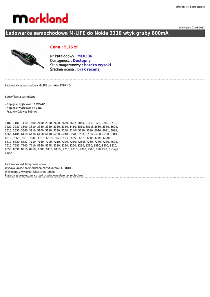 Informacje o produkcie Utworzono 07-03-2017 Ładowarka samochodowa M-LIFE do Nokia 3310 wtyk gruby 800mA Cena : 5,16 zł Nr katalogowy : ML0306 Dostępność : Dostępny Stan magazynowy : bardzo wysoki Średnia ocena : brak recenzji Ładowarka samochodowa M-LIFE do nokia 3310 HQ Specyfikacja techniczna: - Napięcie wejściowe : 12V/24V - Napięcie wyjściowe : 5V DC - Prąd wyjściowy: 800mA 1100, 1101, 1110, 1600, 2100, 2300, 2600, 2650, 2652, 3060, 3100, 3120, 3200, 3210, 3220, 3230, 3300, 3310, 3320, 3330, 3350, 3360, 3410, 3510, 3510i, 3530, 3550, 3600, 3610, 3650, 3660, 3810, 5100, 5110, 5130, 5140, 5140i, 5210, 5510, 6020, 6021, 6030, 6060, 6100, 6110, 6130, 6150, 6170, 6200, 6210, 6220, 6230, 6230i, 6250, 6260, 6310, 6310i, 6320, 6510, 6600, 6610, 6610i, 6620, 6630, 6650, 6670, 6680, 6681, 6800, 6810, 6820, 6822, 7110, 7160, 7200, 7210, 7220, 7250, 7250i, 7260, 7270, 7280, 7600, 7610, 7650, 7700, 7710, 8140, 8148, 8210, 8250, 8260, 8290, 8310, 8390, 8800, 8810, 8850, 8890, 8910, 8910i, 9000, 9110, 9110i, 9210, 9210i, 9300, 9500, E60, E70, N-Gage i inne ... Ładowarka jest fabrycznie nowa. Wysoka jakość potwierdzona certyfikatem CE i ROHS. Wykonana z wysokiej jakości materiału. Posiada zabezpieczenia przed przeładowaniem i przepięciami.