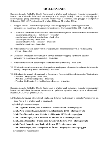 OGŁOSZENIE Dyrekcja Zespołu Zakładów Opieki Zdrowotnej w Wadowicach informuje, że został rozstrzygnięty konkurs na udzielanie świadczeń zdrowotnych oraz objęcie funkcji Lekarza koordynującego i nadzorującego pracę szpitalnego oddziału ratunkowego z centralną izbą przyjęć w zastępstwie Ordynatora SOR z CIP w okresie od 1 grudnia 2012r. do 31 grudnia 2014r. I. Objęcie funkcji Lekarza koordynującego i nadzorującego pracę szpitalnego oddziału ratunkowego z centralną izbą przyjęć w zastępstwie Ordynatora SOR z CIP – brak ofert. II. Udzielanie świadczeń zdrowotnych w Szpitalu Powiatowym im. Jana Pawła II w Wadowicach: - oddział ginekologiczno – położniczy – brak ofert - oddział noworodków i wcześniaków – brak ofert - oddział geriatryczny – brak ofert - oddział obserwacyjno – zakaźny – brak ofert - oddział wewnętrzny – brak ofert. III. Udzielanie świadczeń zdrowotnych w szpitalnym oddziale ratunkowym z centralną izbą przyjęć - brak ofert. IV. Udzielanie świadczeń zdrowotnych w karetce transportowej przy szpitalnym oddziale ratunkowym z centralną izbą przyjęć – brak ofert. V. Udzielanie świadczeń zdrowotnych w Dziale Pomocy Doraźnej – brak ofert. VI. Udzielanie świadczeń zdrowotnych w podstawowej opiece zdrowotnej w zakresie świadczenia nocnej i świątecznej opieki zdrowotnej – brak ofert. VII.Udzielanie świadczeń zdrowotnych w Powiatowej Przychodni Specjalistycznej w Wadowicach: - Poradnia Ortopedyczna – brak ofert, - Poradnia Gastroenterologiczna – brak ofert, - Poradnia dla Dzieci z Ryzyka Okołoporodowego – brak ofert. Dyrekcja Zespołu Zakładów Opieki Zdrowotnej w Wadowicach informuje, że został rozstrzygnięty konkurs na udzielanie świadczeń zdrowotnych i pełnienie dyżurów medycznych w okresie od 1 stycznia 2013r. do 31 grudnia 2015r. I. Udzielania świadczeń zdrowotnych i pełnienie dyżurów medycznych w Szpitalu Powiatowym im. Jana Pawła II w Wadowicach w oddziałach: - ginekologiczno-położniczym: 1. lek. Zygmunt Kizner, zam. Kraków oś. Mozarta 11/15 – oferta przyjęta 2. lek. Piotr Olszewski, zam. Kraków ul. Kluczborska 29/11 – oferta przyjęta 3. lek. Ewa Warzecha, zam. Kraków Al. Kijowska 11/22 – oferta przyjęta 4. lek. Janusz Gajda, zam. Chrzanów ul. Bukowa 24 B – oferta przyjęta 5. lek. Anna Marszałek – Fuchs, zam. Kraków ul. Sądowa 9/15 – oferta przyjęta 6. lek. Paweł Czerwik, zam. Tychy ul. Rybna 37 F – oferta przyjęta 7. lek. Beata Rajda, zam. Andrychów ul. Żwirki i Wigury 62 – oferta przyjęta. - noworodków i wcześniaków: 1. lek. Krystyna Rodkiewicz – Mielnicka, zam. Wadowice oś. Pod Skarpą 20/15 – oferta przyjęta - anestezjologii i intensywnej terapii: 1. lek. Anna Bobrowska, zam. Nidek 81 a – oferta przyjęta - obserwacyjno – zakaźnym: 1. lek. Joanna Zorska, zam. Kraków ul. Owcy – Orwicza 8/1 – oferta przyjęta - w pododdziale chirurgii urazowej: 1. lek. Daniel Łoboda, zam. Skawinki 83 – oferta przyjęta NZOZ Medical – Center Sp. z o.o. Kraków ul. Kołłątaja 6/3 – oferta przyjęta II. Udzielania świadczeń zdrowotnych w szpitalnym oddziale ratunkowym z centralną izbą przyjęć: 1. lek. Joanna Zorska, zam. Kraków ul. Owcy – Orwicza 8/1 – oferta przyjęta 2. lek. Marek Solarz, zam. Targowisko 494 – oferta przyjęta III. Udzielania świadczeń zdrowotnych w karetce transportowej przy szpitalnym oddziale ratunkowym z centralną izbą przyjęć: 1. lek. Janusz Pustuła, zam. Wieprz 209 – oferta przyjęta IV. Udzielania świadczeń zdrowotnych w Dziale Pomocy Doraźnej w Wadowicach – brak ofert V. Udzielania świadczeń zdrowotnych w Powiatowej Przychodni Specjalistycznej w Wadowicach: - Poradnia Ortopedyczna – brak ofert - Poradnia Gastroenterologiczna – brak ofert - Poradnia dla Dzieci z Ryzyka Okołoporodowego – brak ofert - Poradnia Laryngologiczna: 1. lek. Jacek Masłowski, zam. Tomice ul. Podlesie 56 – oferta przyjęta - Poradnia Leczenia Uzależnień: 1. mgr Rafał Muranowicz, zam. Wadowice oś. XX lecia 18/16 – oferta przyjęta - Poradnia Medycyny Pracy: 1. lek. Urszula Krywult – Kocot, zam. Bielsko – Biała ul. Zorzy 5 – oferta przyjęta 2. lek. Grzegorz Skałkowski, zam. Kraków ul. Bobrzeckiej 3/12 – oferta przyjęta - Poradnia Psychologiczna: 1. mgr Katarzyna Sadlik, zam. Bielsko – Biała ul. Wołyńska 15 – oferta przyjęta 2. mgr Rafał Muranowicz, zam. Wadowice oś. XX lecia 18/16 – oferta przyjęta - Poradnia Rehabilitacyjna – brak ofert - Poradnia Zdrowia Psychicznego: 1. mgr Katarzyna Sadlik, zam. Bielsko – Biała ul. Wołyńska 15 – oferta przyjęta 2. mgr Rafał Muranowicz, zam. Wadowice oś. XX lecia 18/16 – oferta odrzucona. Wadowice, dnia 18.12.2012r.