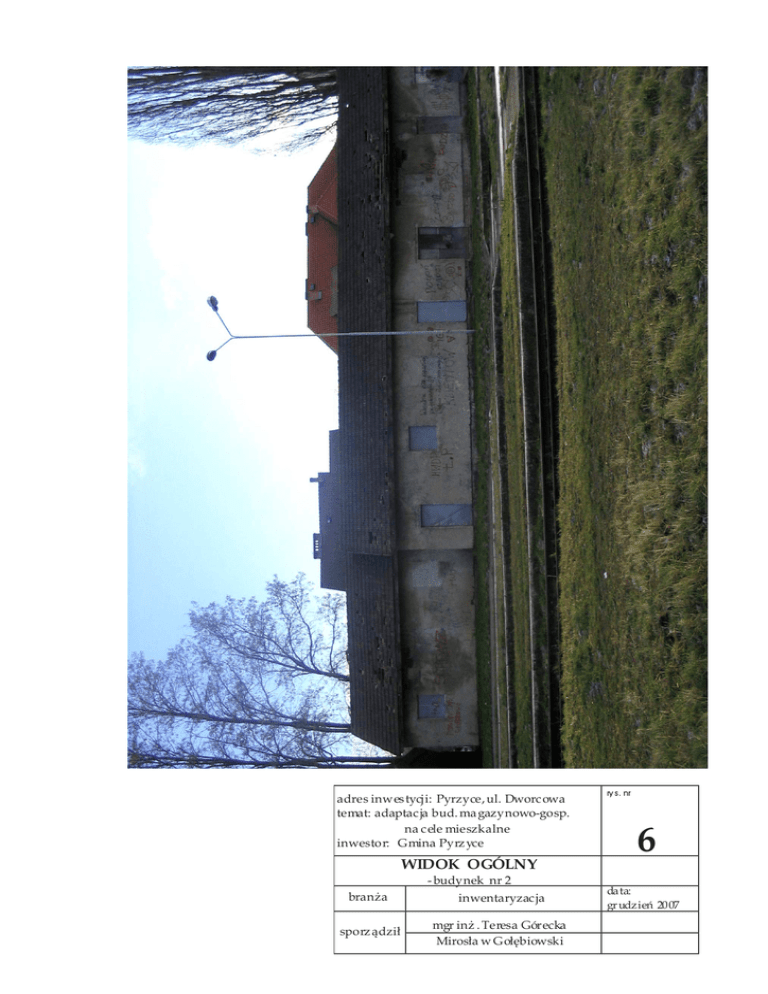 adres inwes tycji: Pyrzyce, ul. Dworcowa temat: adaptacja bud. ma gazynowo-gosp. na cele mieszkalne inwestor: Gmina Pyrz yce ry s. nr 6 WIDOK OGÓLNY - budynek nr 2 branŜa inwentaryzacja sporz ądził mgr inŜ . Teresa Górecka Mirosła w Gołębiowski data: gr udzień 2007