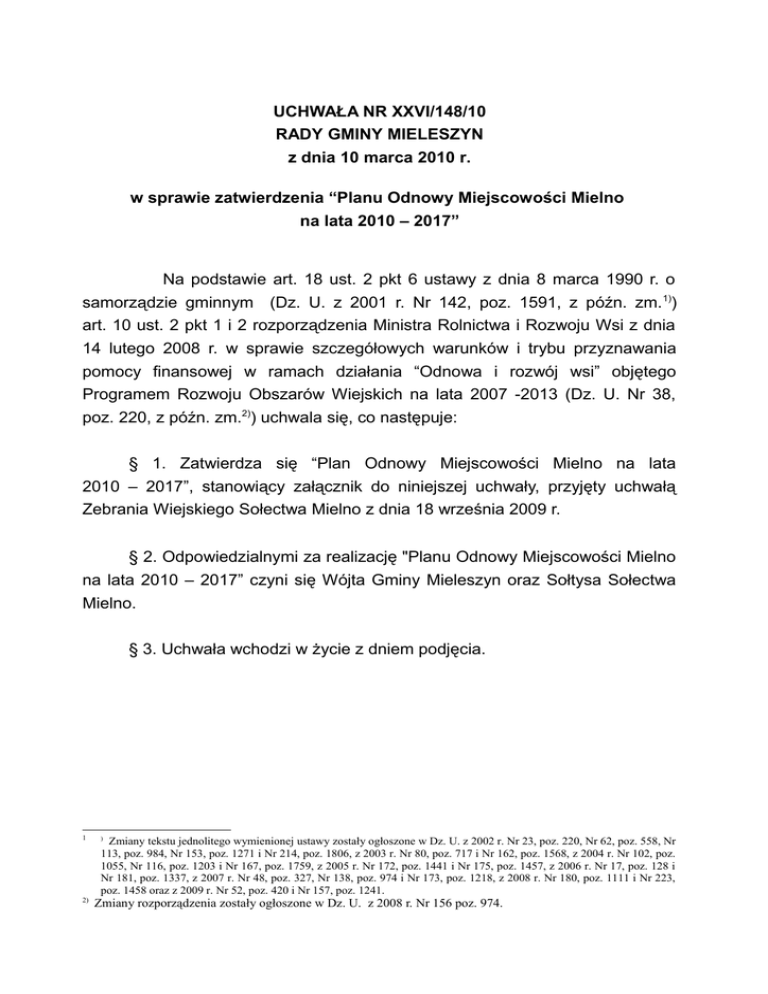 UCHWAŁA NR XXVI/148/10 RADY GMINY MIELESZYN z dnia 10 marca 2010 r. w sprawie zatwierdzenia “Planu Odnowy Miejscowości Mielno na lata 2010 – 2017” Na podstawie art. 18 ust. 2 pkt 6 ustawy z dnia 8 marca 1990 r. o samorządzie gminnym (Dz. U. z 2001 r. Nr 142, poz. 1591, z późn. zm. 1)) art. 10 ust. 2 pkt 1 i 2 rozporządzenia Ministra Rolnictwa i Rozwoju Wsi z dnia 14 lutego 2008 r. w sprawie szczegółowych warunków i trybu przyznawania pomocy finansowej w ramach działania “Odnowa i rozwój wsi” objętego Programem Rozwoju Obszarów Wiejskich na lata 2007 -2013 (Dz. U. Nr 38, poz. 220, z późn. zm.2)) uchwala się, co następuje: § 1. Zatwierdza się “Plan Odnowy Miejscowości Mielno na lata 2010 – 2017”, stanowiący załącznik do niniejszej uchwały, przyjęty uchwałą Zebrania Wiejskiego Sołectwa Mielno z dnia 18 września 2009 r. § 2. Odpowiedzialnymi za realizację "Planu Odnowy Miejscowości Mielno na lata 2010 – 2017” czyni się Wójta Gminy Mieleszyn oraz Sołtysa Sołectwa Mielno. § 3. Uchwała wchodzi w życie z dniem podjęcia. 1 2) ) Zmiany tekstu jednolitego wymienionej ustawy zostały ogłoszone w Dz. U. z 2002 r. Nr 23, poz. 220, Nr 62, poz. 558, Nr 113, poz. 984, Nr 153, poz. 1271 i Nr 214, poz. 1806, z 2003 r. Nr 80, poz. 717 i Nr 162, poz. 1568, z 2004 r. Nr 102, poz. 1055, Nr 116, poz. 1203 i Nr 167, poz. 1759, z 2005 r. Nr 172, poz. 1441 i Nr 175, poz. 1457, z 2006 r. Nr 17, poz. 128 i Nr 181, poz. 1337, z 2007 r. Nr 48, poz. 327, Nr 138, poz. 974 i Nr 173, poz. 1218, z 2008 r. Nr 180, poz. 1111 i Nr 223, poz. 1458 oraz z 2009 r. Nr 52, poz. 420 i Nr 157, poz. 1241. Zmiany rozporządzenia zostały ogłoszone w Dz. U. z 2008 r. Nr 156 poz. 974. ZAŁĄCZNIK DO UCHWAŁY NR XXVI/148/10 RADY GMINY MIELESZYN Z DNIA 10 MARCA 2010 R. PLAN ODNOWY MIEJSCOWOŚCI MIELNO NA LATA 2010 - 2017 GMINA MIELESZYN Mieleszyn, wrzesień 2009 WSTĘP Rozwój i odnowa obszarów wiejskich to jedno z kluczowych wyzwań, jakie stoją przed Polską w okresie integracji z Unią Europejską. Zasadniczym celem jest wzmocnienie działań służących zmniejszeniu istniejących dysproporcji i różnic w poziomie rozwoju obszarów wiejskich w stosunku do terenów miejskich. Plan Odnowy Miejscowości jest dokumentem mogącym stanowić załącznik do wniosku o przyznanie pomocy finansowej w celu wsparcia rozwoju obszarów wiejskich z udziałem środków Europejskiego Funduszu Rolnego na rzecz Rozwoju Obszarów Wiejskich w ramach działania “Odnowa i rozwój wsi” objętego Programem Rozwoju Obszarów Wiejskich na lata 2007 -2013. Plan Odnowy Miejscowości Mielno przedstawia sytuację społeczno - ekonomiczną i gospodarczą miejscowości, formułuje cele i zawiera opis strategii zmierzającej do osiągnięcia rozwoju społecznego i gospodarczego. Szacuje spodziewane efekty planowanych inwestycji o wpływ na przebieg procesów rozwojowych, wskazuje kierunki zaangażowania środków funduszy strukturalnych i środków własnych Gminy Mieleszyn. Niniejszy Plan spełnia wymogi rozporządzenia Ministra Rolnictwa i Rozwoju Wsi z dnia 14 lutego 2008 r. w sprawie szczegółowych warunków i trybu przyznawania pomocy finansowej w ramach działania “Odnowa i rozwój wsi” objętego Programem Rozwoju Obszarów Wiejskich na lata 2007 – 2013. W ramach Planu opisane są zasoby miejscowości, wypracowane na forum zebrań wiejskich – wizja rozwoju wsi oraz zestaw celów strategicznych wraz z priorytetami rozwoju. W ramach projektów strategicznych są także te, dla realizacji, których Gmina będzie starać się o przyznanie pomocy finansowej w ramach działania “odnowa i rozwój wsi” objętego PROW na lata 2007 – 2013. Działania są opisane oraz zawierają szacunkowy kosztorys i harmonogram wykonania. Niniejszy Plan wskazuje także zgodność proponowanych działań ze Strategią Rozwoju Gminy. Dokument ten został przygotowany na podstawie następujących dokumentów: - Planu Rozwoju Lokalnego gminy Mieleszyn na lata 2007- 2013, - Strategii Rozwoju Społeczno - Gospodarczego Gminy Mieleszyn na lata 2001- 2010, - Zintegrowanej Strategii Rozwoju Obszarów Wiejskich na lata 2006- 2013, - Rozporządzenie Ministra Rolnictwa i Rozwoju Wsi z dnia 14 lutego 2008 r. w sprawie szczegółowych warunków i trybu przyznawania pomocy finansowej w ramach działania “Odnowa i rozwój wsi” objętego Programem Rozwoju Obszarów Wiejskich na lata 2007 – 2013 (Dz. U. Nr 38 poz. 220 z póź. zm.) - Studium Uwarunkowań i Kierunków Zagospodarowania Przestrzennego Gminy Mieleszyn. We wnioskach końcowych, służących opracowaniu Planu Odnowy Miejscowości Mielno wzięto również pod uwagę wyniki debat strategicznych organizowanych metodą aktywnego planowania strategicznego, w których brali udział przedstawiciele mieszkańców wsi. Plan został opracowany we współpracy z mieszkańcami i posiada akceptacje społeczności lokalnej. OBSZAR I CZAS REALIZACJI PLANU ODNOWY MIEJSCOWOŚCI MIELNO Plan został przygotowany w związku z ubieganiem się Gminy o środki w celu wsparcia rozwoju obszarów wiejskich z udziałem środków Europejskiego Funduszu Rolnego na rzecz Rozwoju Obszarów Wiejskich w ramach działania “Odnowa i rozwój wsi” objętego Programem Rozwoju Obszarów Wiejskich na lata 2007 – 2013. Plan obejmuje terytorialnie i administracyjnie całą miejscowość Mielno, które wchodzi w skład Gminy Mieleszyn, a ta w skład powiatu gnieźnieńskiego, który z kolei leży w województwie wielkopolskim. Plan Odnowy Miejscowości Mielno został zakreślony na lata 2010 – 2017. Tak zdefiniowany czas realizacji obejmuje ramy czasowe PROW 2007 -2013. Zadania proponowane w Planie są spowodowane potrzebami zgłoszonymi przez społeczność lokalną. Plan Odnowy Miejscowości Mielno 2010 – 2017 będzie służył jako punkt odniesienia dla działań o charakterze rozwojowym, podejmowanych z zasobów środków własnych, jak również pozwoli określić wysokość interwencj