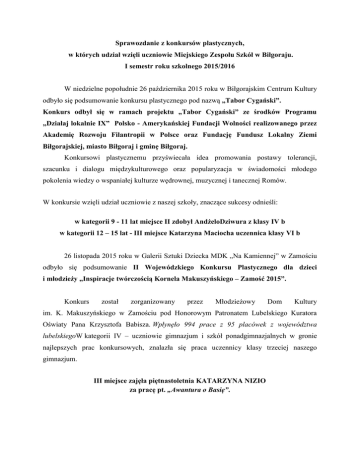 Sprawozdanie z konkursów plastycznych, w których udział wzięli uczniowie Miejskiego Zespołu Szkół w Biłgoraju. I semestr roku szkolnego 2015/2016 W niedzielne popołudnie 26 października 2015 roku w Biłgorajskim Centrum Kultury odbyło się podsumowanie konkursu plastycznego pod nazwą „Tabor Cygański”. Konkurs odbył się w ramach projektu „Tabor Cygański” ze środków Programu „Działaj lokalnie IX” Polsko - Amerykańskiej Fundacji Wolności realizowanego przez Akademię Rozwoju Filantropii w Polsce oraz Fundację Fundusz Lokalny Ziemi Biłgorajskiej, miasto Biłgoraj i gminę Biłgoraj. Konkursowi plastycznemu przyświecała idea promowania postawy tolerancji, szacunku i dialogu międzykulturowego oraz popularyzacja w świadomości młodego pokolenia wiedzy o wspaniałej kulturze wędrownej, muzycznej i tanecznej Romów. W konkursie wzięli udział uczniowie z naszej szkoły, znaczące sukcesy odnieśli: w kategorii 9 - 11 lat miejsce II zdobył AndżeloDziwura z klasy IV b w kategorii 12 – 15 lat - III miejsce Katarzyna Maciocha uczennica klasy VI b 26 listopada 2015 roku w Galerii Sztuki Dziecka MDK „Na Kamiennej” w Zamościu odbyło się podsumowanie II Wojewódzkiego Konkursu Plastycznego dla dzieci i młodzieży „Inspiracje twórczością Kornela Makuszyńskiego – Zamość 2015”. Konkurs został zorganizowany przez Młodzieżowy Dom Kultury im. K. Makuszyńskiego w Zamościu pod Honorowym Patronatem Lubelskiego Kuratora Oświaty Pana Krzysztofa Babisza. Wpłynęło 994 prace z 95 placówek z województwa lubelskiegoW kategorii IV – uczniowie gimnazjum i szkół ponadgimnazjalnych w gronie najlepszych prac konkursowych, znalazła się praca uczennicy klasy trzeciej naszego gimnazjum. III miejsce zajęła piętnastoletnia KATARZYNA NIZIO za pracę pt. „Awantura o Basię”. Szkolny Konkurs Plastyczny „List do Świętego Mikołaja” dla klas I-III Szkoły Podstawowej zorganizowała Anna Kusiak Decyzją komisji: I miejsce – Dominika Olszewska II d II miejsce – Jan Krasiński II d III miejsce – Aleksandra Seńko II d Wyróżnienie: Martyna Senderek II d, Amelia Adamek II b Wojewódzki Ośrodek Ruchu Drogowego w Zamościu był organizatorem VIII edycji konkursu plastycznego pt. „Bezpieczni na drodze” Udział w konkursie miał na celu popularyzację wiedzy uczniów BRD oraz stanowił doskonałą formę edukacji komunikacyjnej dzieci. Odbywał się w dwóch etapach: szkolnym i rejonowym w którym po odebranie nagrody zostali zaproszeni uczniowie naszej szkoły: Lena Szabat klasa IV b Katarzyna Łokaj V a Dawid Mularczyk VI b 11 grudnia 2015 roku uczniowie pod opieką pana dyrektora Miejskiego Zespołu Szkół Jana Majewskiego uczestniczyli w podsumowaniu konkursu i odebraniu nagród, którym towarzyszył szereg atrakcji. Szkolny Konkurs Plastyczny na „Witraż Bożonarodzeniowy”dla uczniów Gimnazjum zorganizowała Anna Kusiak Zadaniem uczestników konkursu było własnoręczne wykonanie witrażaBożonarodzeniowego. Decyzją komisji: I miejsce – Pawęska Katarzyna z klasy IB II miejsce – Szymanik Elżbieta z klasy I B III miejsce – Karol Kubik z klasy II A IV Wojewódzki Konkurs Plastyczny „Mój Anioł” Młodzieżowy Dom Kultury im. Marii Konopnickiej w Krasnymstawie pod patronatem Lubelskiego Kuratora Oświaty Kwalifikację do wystawy otrzymała: Klaudia Krajewska uczennica naszego gimnazjum z klasy III C Przygotowała uczniów i wysłała prace oraz opracowała sprawozdanie nauczyciel plastyki Anna Kusiak