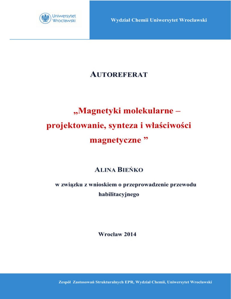 Autoreferat, dr Alina Bieńko Zespół Zastosowań Strukturalnych EPR, Wydział Chemii,Chemii Uniwersytet Wrocławski Wydział Uniwersytet Wrocławski AUTOREFERAT „Magnetyki molekularne – projektowanie, synteza i właściwości magnetyczne ” ALINA BIEŃKO w związku z wnioskiem o przeprowadzenie przewodu habilitacyjnego Wrocław 2014 1 Zespół Zastosowań Strukturalnych EPR, Wydział Chemii, Uniwersytet Wrocławski Autoreferat, dr Alina Bieńko Zespół Zastosowań Strukturalnych EPR, Wydział Chemii, Uniwersytet Wrocławski Spis treści I. Dane osobowe………………………………………………………………….. ….…...3 II. Opis badań naukowych w ramach wniosku habilitacyjnego… …………………..…...5 II.1. Lista publikacji stanowiących podstawę do wnioski wraz z określeniem osobistego wkładu autora…………………….………..……...5 II.2. Wstęp…………………………………………………………………..…......9 II.3. Najważniejsze osiągnięcia w ramach prac stanowiących podstawę do wniosku..….13 II.3.1. Polimeryczne kompleksy oparte na anizotropowym rdzeniu [ReCl4(ox)]2- i makrocyklach Cu(II)……………… ………………..…13 II.3.2. Polimeryczne kompleksy oparte na prekursorach politiocyjanianowych i policyjanianowych……….…..…………...24 II.3.3. Homometaliczne kompleksy wielordzeniowe……………..……...31 III. Aktywność naukowa……………………...................................................................42 III.1. Lista artykułów naukowych i wystąpień konferencyjnych przed uzyskaniem stopnia doktora.........................................................................42 III.2. Lista artykułów naukowych i wystąpień konferencyjnych po uzyskaniu stopnia doktora............................................................................................. 44 III.3. Podsumowanie aktywności naukowej…………..………………………....59 IV. Inne prace naukowe i badawcze…..………………………………………….. ….…60 V. Techniki badawcze i metody obliczeniowe stosowane w pracy naukowej ..………..60 VI. Okładki w czasopismach……..……………………………………………………...61 VII. Udział w projektach badawczych .............................................................................61 VII.1. Prace prowadzone w ramach programów międzynarodowych……..……61 VII.2. Prace prowadzone w ramach krajowych programów badawczych……....62 VIII. Osiągnięcia dydaktyczne, popularyzujące naukę i organizacyjne……..……….....62 VIII. 1. Aktywność dydaktyczna…………..…………………………………....62 VIII.2.Opieka naukowa nad studentami………………..……………...………..63 VIII.3. Działalność popularno – naukowa ……………………………..….........65 VIII.4. Działalność organizacyjna………………………..……………………...65 2 Autoreferat, dr Alina Bieńko Zespół Zastosowań Strukturalnych EPR, Wydział Chemii, Uniwersytet Wrocławski I. Dane osobowe, dane kontaktowe DANE OSOBOWE DANE KONTAKTOWE Imię i nazwisko: Alina Bieńko Zespół Zastosowań Strukturalnych EPR Nazwisko panieńskie: Tomkiewicz Wydział Chemii Data urodzenia: 15.06.1971 Uniwersytet Wrocławski Miejsce urodzenia: Wrocław ul. Joliot Curie 14, Wrocław Stan cywilny: mężatka, jedno dziecko email:[email protected] Tel.: 71 3757258, fax 713757307 WYKSZTAŁCENIE 2000 doktor nauk chemicznych, obrona pracy doktorskiej pt: „ Mono- i heterometaliczne magnetyki molekularne Re(IV)”, Wydział Chemii Uniwersytetu Wrocławskiego (promotor naukowy Prof. dr hab. Jerzy Mroziński) 1995 magister chemii, obrona pracy magisterskiej pt: „ Nowe ferromagnetyki miedzi(II)”, Wydział Chemii Uniwersytetu Wrocławskiego (promotor naukowy Prof. dr hab. Jerzy Mroziński) 1990 matura VII LO im. Krzysztofa Kamila Baczyńskiego we Wrocławiu, klasa o profilu biologiczno – chemicznym PRZEBIEG KARIERY ZAWODOWEJ 2004 – obecnie adiunkt, Wydział Chemii Uniwersytetu Wrocławskiego, Zespół Magnetyzmu Molekularnego i Nowych Materiałów ( kier. Prof. dr hab. Jerzy Mroziński) do 2009 roku, Zespół Zastosowań Stukturalnych EPR ( kier. Prof. dr hab. Adam Jezierski) 2001 – 2004 asystent, Wydział Chemii Uniwersytetu Wrocławskiego, Zespół 3 Autoreferat, dr Alina Bieńko Zespół Zastosowań Strukturalnych EPR, Wydział Chemii, Uniwersytet Wrocławski Magnetyzmu Molekularnego i Nowych Materiałów ( kier. Prof. dr hab. Jerzy Mroziński) doktorat, 1995 – 2000 Zespół Magnetyzmu Molekularnego i Nowych Materiałów ( kier. Prof. dr hab. Jerzy Mroziński) ZNAJOMOŚĆ JĘZYKÓW OBCYCH Angielski: dobra Rosyjski: podstawowa Niemiecki: podstawowa STAŻE ZAGRANICZNE: 1996 2 tygodnie, ( Umowa o współpracę polsko – czechosłowacką), Institute of Inorganic Chemistry, Technology and Materials, Slovak University of Technology, Bratislava, Slovakia, Prof. Milan Melnik 1998 1 miesiąc, ( Program COST), Laboratoire de Chimie des Métaux de Transition at Universite Pierre et Marie Curie, prof. Michel Verdaguer, dr Valerie Marvaud Parys, Francja; 4 Autoreferat, dr Alina Bieńko Zespół Zastosowań Strukturalnych EPR, Wydział Chemii, Uniwersytet Wrocławski II. Opis badań naukowych w ramach wniosku habilitacyjnego II.1. LISTA PUBLIKACJI STANOWIĄCYCH PODSTAWĘ DO WNIOSKU WRAZ Z OKREŚLENIEM OSOBISTEGO WKŁADU AUTORA Analiza scjentrometryczna Liczba artykułów naukowych: 12 Sumaryczny Impact Factor: 22.78 (wg. bazy danych JCR, 2014) Liczba cytowań z wyłączeniem cytowań własnych: 93 „Impact factor” (IF) dotyczy roku wydania pracy. LC oznacza liczbę cytowań niezależnych (27.04.2014). W nawiasie podano całkowitą liczbę cytowań. ARTYKUŁY 1. MAGNETIC PROPERTIES, CRYSTAL AND MOLECULAR STUCTURE OF (NBu4)2[ReCl4(ox)]. A.Tomkiewicz, J. Bartczak, R. Kruszyński, J.Mroziński. J. Mol. Str