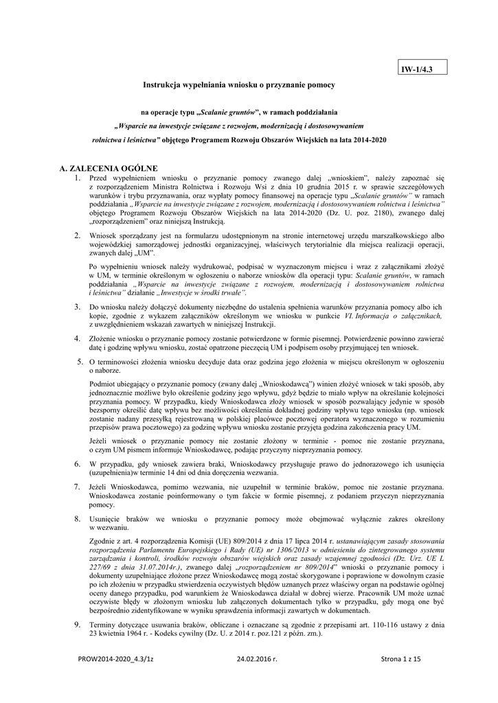 IW-1/4.3 Instrukcja wypełniania wniosku o przyznanie pomocy na operacje typu „Scalanie gruntów”, w ramach poddziałania „Wsparcie na inwestycje związane z rozwojem, modernizacją i dostosowywaniem rolnictwa i leśnictwa” objętego Programem Rozwoju Obszarów Wiejskich na lata 2014-2020 A. ZALECENIA OGÓLNE 1. Przed wypełnieniem wniosku o przyznanie pomocy zwanego dalej „wnioskiem”, należy zapoznać się z rozporządzeniem Ministra Rolnictwa i Rozwoju Wsi z dnia 10 grudnia 2015 r. w sprawie szczegółowych warunków i trybu przyznawania, oraz wypłaty pomocy finansowej na operacje typu „Scalanie gruntów” w ramach poddziałania „Wsparcie na inwestycje związane z rozwojem, modernizacją i dostosowywaniem rolnictwa i leśnictwa” objętego Programem Rozwoju Obszarów Wiejskich na lata 2014-2020 (Dz. U. poz. 2180), zwanego dalej „rozporządzeniem” oraz niniejszą Instrukcją. 2. Wniosek sporządzany jest na formularzu udostępnionym na stronie internetowej urzędu marszałkowskiego albo wojewódzkiej samorządowej jednostki organizacyjnej, właściwych terytorialnie dla miejsca realizacji operacji, zwanych dalej „UM”. Po wypełnieniu wniosek należy wydrukować, podpisać w wyznaczonym miejscu i wraz z załącznikami złożyć w UM, w terminie określonym w ogłoszeniu o naborze wniosków dla operacji typu: Scalanie gruntów, w ramach poddziałania „Wsparcie na inwestycje związane z rozwojem, modernizacją i dostosowywaniem rolnictwa i leśnictwa” działanie „Inwestycje w środki trwałe”. 3. Do wniosku należy dołączyć dokumenty niezbędne do ustalenia spełnienia warunków przyznania pomocy albo ich kopie, zgodnie z wykazem załączników określonym we wniosku w punkcie VI. Informacja o załącznikach, z uwzględnieniem wskazań zawartych w niniejszej Instrukcji. 4. Złożenie wniosku o przyznanie pomocy zostanie potwierdzone w formie pisemnej. Potwierdzenie powinno zawierać datę i godzinę wpływu wniosku, zostać opatrzone pieczęcią UM i podpisem osoby przyjmującej ten wniosek. 5. O terminowości złożenia wniosku decyduje data oraz godzina jego złożenia w miejscu określonym w ogłoszeniu o naborze. Podmiot ubiegający o przyznanie pomocy (zwany dalej „Wnioskodawcą”) winien złożyć wniosek w taki sposób, aby jednoznacznie możliwe było określenie godziny jego wpływu, gdyż będzie to miało wpływ na określanie kolejności przyznania pomocy. W przypadku, kiedy Wnioskodawca złoży wniosek w sposób pozwalający jedynie w sposób bezsporny określić datę wpływu bez możliwości określenia dokładnej godziny wpływu tego wniosku (np. wniosek zostanie nadany przesyłką rejestrowaną w polskiej placówce pocztowej operatora wyznaczonego w rozumieniu przepisów prawa pocztowego) za godzinę wpływu wniosku zostanie przyjęta godzina zakończenia pracy UM. Jeżeli wniosek o przyznanie pomocy nie zostanie złożony w terminie - pomoc nie zostanie przyznana, o czym UM pismem informuje Wnioskodawcę, podając przyczyny nieprzyznania pomocy. 6. W przypadku, gdy wniosek zawiera braki, Wnioskodawcy przysługuje prawo do jednorazowego ich usunięcia (uzupełnienia)w terminie 14 dni od dnia doręczenia wezwania. 7. Jeżeli Wnioskodawca, pomimo wezwania, nie uzupełnił w terminie braków, pomoc nie zostanie przyznana. Wnioskodawca zostanie poinformowany o tym fakcie w formie pisemnej, z podaniem przyczyn nieprzyznania pomocy. 8. Usunięcie braków we wniosku o przyznanie pomocy może obejmować wyłącznie zakres określony w wezwaniu. Zgodnie z art. 4 rozporządzenia Komisji (UE) 809/2014 z dnia 17 lipca 2014 r. ustanawiającym zasady stosowania rozporządzenia Parlamentu Europejskiego i Rady (UE) nr 1306/2013 w odniesieniu do zintegrowanego systemu zarządzania i kontroli, środków rozwoju obszarów wiejskich oraz zasady wzajemnej zgodności (Dz. Urz. UE L 227/69 z dnia 31.07.2014r.), zwanego dalej „rozporządzeniem nr 809/2014” wnioski o przyznanie pomocy i dokumenty uzupełniające złożone przez Wnioskodawcę mogą zostać skorygowane i poprawione w dowolnym czasie po ich złożeniu w przypadku stwierdzenia oczywistych błędów uznanych przez właściwy organ na podstawie ogólnej oceny danego przypadku, pod warunkiem że Wnioskodawca działał w dobrej wierze. Pracownik UM może uznać oczywiste błędy w złożonym wniosku lub załączonych dokumentach tylko w przypadku, gdy mogą one być bezpośrednio zidentyfikowane w wyniku sprawdzenia informacji zawartych w dokumentach. 9. Terminy dotyczące usuwania braków, obliczane i oznaczane są zgodnie z przepisami art. 110-116 ustawy z dnia 23 kwietnia 1964 r. - Kodeks cywilny (Dz. U. z 2014 r. poz.121 z późn. zm.). PROW2014-2020_4.3/1z 24.02.2016 r. Strona 1 z 15 10. Zgodnie z art. 34 ust. 2 ustawy z dnia z dnia 20 lutego 2015 r. o wspieraniu rozwoju obszarów wiejskich z udziałem środków Europejskiego Funduszu Rolnego na rzecz Rozwoju Obszarów Wiejskich w ramach Programu Rozwoju Obszarów Wiejskich na lata 2014-2020 (Dz. U. poz. 349 i 1888), wynika że w ramach poddziałania „Wsparcie na inwestycje związane z rozwojem, modernizacją i dostosowywaniem rolnictwa i leśnictwa” do postępowań w sprawach o przyznanie pomocy nie stosuje się przepisów Kodeksu postępowania administracyjnego (Dz. U. z 2013r. poz. 267 z poźn. zm.), z wyjątkiem przepisów dotyczących właściwości miejscowej organów, wyłączenia pracowników organu, doręczeń i wezwań, udostępniania akt, skarg i wniosków, o ile przepisy ustawy nie stanowią inaczej. 11. Zgodnie z art. 3 „rozporządzenia nr 809/2014”,Wnioskodawca w dowolnym momencie po złożeniu wniosku o przyznanie pomocy lub innej deklaracji może zwrócić się z pisemną prośbą o wycofanie wniosku w całości lub w części. Jeżeli Wnioskodawca został poinformowany o niezgodnościach w dokumentach lub o zamiarze przeprowadzenia czynności kontrolnych lub jeśli ta kontrola ujawni jakiekolwiek przypadki niezgod