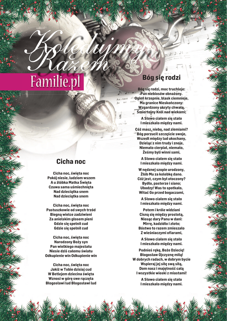 Kolędujmy Razem Bóg się rodzi Bóg się rodzi, moc truchleje: Pan niebiosów obnażony. Ogień krzepnie, blask ciemnieje, Ma granice Nieskończony: Wzgardzony okryty chwałą, Śmiertelny Król nad wiekami; A Słowo ciałem się stało I mieszkało między nami. Cóż masz, niebo, nad ziemiami? Bóg porzucił szczęście swoje, Wszedł między lud ukochany, Dzieląc z nim trudy i znoje, Niemało cierpiał, niemało, Żeśmy byli winni sami, Cicha noc Cicha noc, święta noc Pokój niesie, ludziom wszem A u żłóbka Matka Święta Czuwa sama uśmiechnięta Nad dzieciątka snem Nad dzieciątka snem Cicha noc, święta noc Pastuszkowie od swych trzód Biegną wielce zadziwieni Za anielskim głosem pieni Gdzie się spełnił cud Gdzie się spełnił cud Cicha noc, święta noc Narodzony Boży syn Pan wielkiego majestatu Niesie dziś całemu światu Odkupienie win Odkupienie win Cicha noc, święta noc Jakiż w Tobie dzisiaj cud W Betlejem dziecina święta Wznosi w górę swe rączęta Błogosławi lud Błogosławi lud A Słowo ciałem się stało I mieszkało między nami. W nędznej szopie urodzony, Żłób Mu za kolebkę dano. Cóż jest, czym był otoczony? Bydło, pasterze i siano; Ubodzy! Was to spotkało, Witać Go przed bogaczami, A Słowo ciałem się stało I mieszkało między nami. Potem i króle widziani Cisną się między prostotą, Niosąc dary Panu w dani: Mirrę, kadzidło i złoto; Bóstwo to razem zmieszało Z wieśniaczymi ofiarami, A Słowo ciałem się stało I mieszkało między nami. Podnieś rękę, Boże Dziecię! Błogosław Ojczyznę miłą! W dobrych radach, w dobrym bycie Wspieraj jej siłę swą siłą, Dom nasz i majętność całą I wszystkie wioski z miastami! A Słowo ciałem się stało I mieszkało między nami. Kolędujmy Razem Lulajże Jezuniu Przybierzeli do Betlejem Lulajże Jezuniu, moja Perełko, Lulaj ulubione me Pieścidełko. Lulajże Jezuniu, lulaj, że lulaj A ty go matulu w płaczu utulaj Przybieżeli do Betlejem pasterze, Grając skocznie Dzieciąteczku na lirze. Chwała na wysokości, chwała na wysokości, A pokój na ziemi. Zamknijże znużone płaczem powieczki, Utulże zemdlone łkaniem usteczki. Lulajże, Jezuniu... Oddawali swe ukłony w pokorze Tobie z serca ochotnego, o Boże! Chwała na wysokości... Lulajże, piękniuchny nasz Aniołeczku. Lulajże wdzięczniuchny świata Kwiateczku. Lulajże, Jezuniu... Anioł Pański sam ogłosił te dziwy, Których oni nie słyszeli, jak żywi. Chwała na wysokości... Lulajże, Różyczko najozdobniejsza, Lulajże, Lilijko najprzyjemniejsza. Lulajże, Jezuniu... Dziwili się napowietrznej muzyce i myśleli, co to będzie za Dziecię? Chwała na wysokości ... Dam ja Jezusowi słodkich jagódek pójdę z nim w Matuli serca ogródek. Lulajże, Jezuniu... Oto mu się wół i osioł kłaniają, Trzej królowie podarunki oddają. Chwała na wysokości... Dam ja Jezusowi z chlebem masełka, włożę ja kukiełkę w jego jasełka. Lulajże, Jezuniu... I anieli gromadą pilnują Panna czysta wraz z Józefem pilnują Chwała na wysokości... Dam ja Ci słodkiego, Jezu, cukierka rodzynków, migdałów z mego pudełka. Lulajże, Jezuniu... Poznali Go Mesjaszem być prawym Narodzonym dzisiaj Panem łaskawym Chwała na wysokości... Cyt, cyt, cyt niech zaśnie małe Dzieciątko oto już zasnęlo niby kurczątko. Lulajże, Jezuniu... My go także Bogiem, Zbawcą już znamy I z całego serca wszystko kochamy Chwała na wysokości... Cyt, cyt, cyt wszyscy się spać zabierajcie, mojego Dzieciątka nie przebudzajcie. Lulajże, Jezuniu...