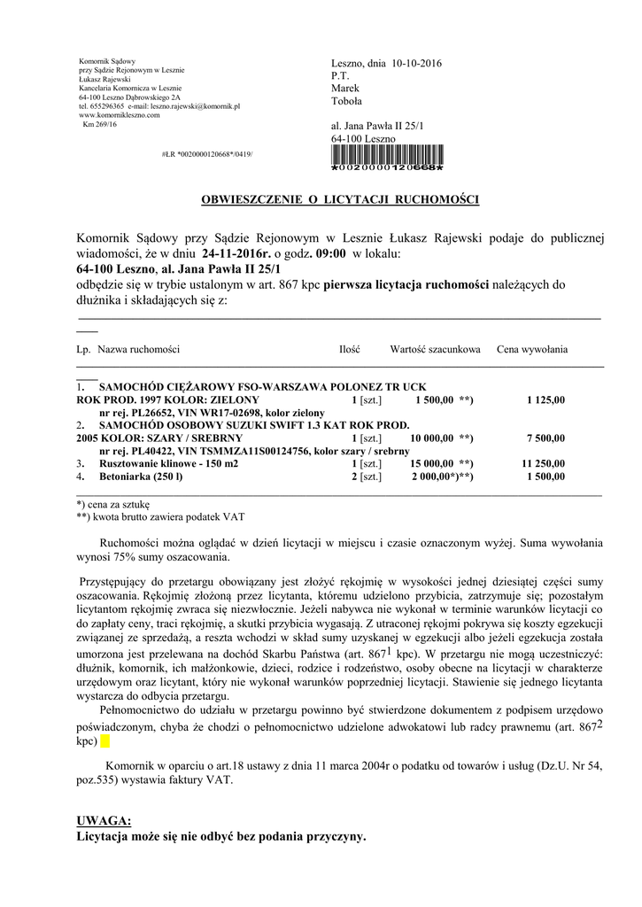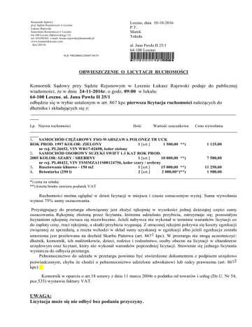 Komornik Sądowy przy Sądzie Rejonowym w Lesznie Łukasz Rajewski Kancelaria Komornicza w Lesznie 64-100 Leszno Dąbrowskiego 2A tel. 655296365 e-mail: [email protected] www.komornikleszno.com Km 269/16 #ŁR *0020000120668*/0419/ Leszno, dnia 10-10-2016 P.T. Marek Toboła al. Jana Pawła II 25/1 64-100 Leszno *0020000120668* OBWIESZCZENIE O LICYTACJI RUCHOMOŚCI Komornik Sądowy przy Sądzie Rejonowym w Lesznie Łukasz Rajewski podaje do publicznej wiadomości, że w dniu 24-11-2016r. o godz. 09:00 w lokalu: 64-100 Leszno, al. Jana Pawła II 25/1 odbędzie się w trybie ustalonym w art. 867 kpc pierwsza licytacja ruchomości należących do dłużnika i składających się z: ________________________________________________________________________________________________ ____ Lp. Nazwa ruchomości Ilość Wartość szacunkowa Cena wywołania _________________________________________________________________________________________________ ____ 1. SAMOCHÓD CIĘŻAROWY FSO-WARSZAWA POLONEZ TR UCK ROK PROD. 1997 KOLOR: ZIELONY 1 [szt.] 1 500,00 **) 1 125,00 nr rej. PL26652, VIN WR17-02698, kolor zielony 2. SAMOCHÓD OSOBOWY SUZUKI SWIFT 1.3 KAT ROK PROD. 2005 KOLOR: SZARY / SREBRNY 1 [szt.] 10 000,00 **) 7 500,00 nr rej. PL40422, VIN TSMMZA11S00124756, kolor szary / srebrny 3. Rusztowanie klinowe - 150 m2 1 [szt.] 15 000,00 **) 11 250,00 4. Betoniarka (250 l) 2 [szt.] 2 000,00*)**) 1 500,00 _______________________________________________________________________________________________________________________ *) cena za sztukę **) kwota brutto zawiera podatek VAT Ruchomości można oglądać w dzień licytacji w miejscu i czasie oznaczonym wyżej. Suma wywołania wynosi 75% sumy oszacowania. Przystępujący do przetargu obowiązany jest złożyć rękojmię w wysokości jednej dziesiątej części sumy oszacowania. Rękojmię złożoną przez licytanta, któremu udzielono przybicia, zatrzymuje się; pozostałym licytantom rękojmię zwraca się niezwłocznie. Jeżeli nabywca nie wykonał w terminie warunków licytacji co do zapłaty ceny, traci rękojmię, a skutki przybicia wygasają. Z utraconej rękojmi pokrywa się koszty egzekucji związanej ze sprzedażą, a reszta wchodzi w skład sumy uzyskanej w egzekucji albo jeżeli egzekucja została umorzona jest przelewana na dochód Skarbu Państwa (art. 8671 kpc). W przetargu nie mogą uczestniczyć: dłużnik, komornik, ich małżonkowie, dzieci, rodzice i rodzeństwo, osoby obecne na licytacji w charakterze urzędowym oraz licytant, który nie wykonał warunków poprzedniej licytacji. Stawienie się jednego licytanta wystarcza do odbycia przetargu. Pełnomocnictwo do udziału w przetargu powinno być stwierdzone dokumentem z podpisem urzędowo poświadczonym, chyba że chodzi o pełnomocnictwo udzielone adwokatowi lub radcy prawnemu (art. 8672 kpc) Komornik w oparciu o art.18 ustawy z dnia 11 marca 2004r o podatku od towarów i usług (Dz.U. Nr 54, poz.535) wystawia faktury VAT. UWAGA: Licytacja może się nie odbyć bez podania przyczyny. Jeżeli drzwi będą zamknięte, będą otwierane na koszt i odpowiedzialność dłużnika. Komornik zastrzega możliwość opóźnienia licytacji do 2 godzin. Komornik Sądowy Łukasz Rajewski Adresat oryginału: Marek Toboła Do wiadomości: 1. Kancelaria Radcy Prawnego Maciej Tabert, 64-100 Leszno 2. Sąd Rejonowy w Lesznie, 64-100 Leszno 3. a/a