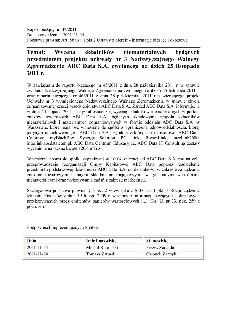 Raport bieżący nr: 47/2011 Data sporządzenia: 2011-11-04 Podstawa prawna: Art. 56 ust. 1 pkt 2 Ustawy o ofercie - informacje bieżące i okresowe Temat: Wycena składników niematerialnych będących przedmiotem projektu uchwały nr 3 Nadzwyczajnego Walnego Zgromadzenia ABC Data S.A. zwołanego na dzień 25 listopada 2011 r. W nawiązaniu do raportu bieżącego nr 45/2011 z dnia 28 października 2011 r. w sprawie zwołania Nadzwyczajnego Walnego Zgromadzenia zwołanego na dzień 25 listopada 2011 r. oraz raportu bieżącego nr 46/2011 z dnia 28 października 2011 r. zawierającego projekt Uchwały nr 3 wymienionego Nadzwyczajnego Walnego Zgromadzenia w sprawie zbycia zorganizowanej części przedsiębiorstwa ABC Data S.A., Zarząd ABC Data S.A. informuje, iż w dniu 4 listopada 2011 r. uzyskał ostateczną wycenę składników niematerialnych w postaci znaków towarowych ABC Data S.A. będących składowymi zespołu składników niematerialnych i materialnych zorganizowanych w formie oddziału ABC Data S.A. w Warszawie, które mają być wniesione do spółki z ograniczoną odpowiedzialnością, której jedynym udziałowcem jest ABC Data S.A., zgodnie z którą znaki towarowe: ABC Data, Colorovo, myBlackBox, Synergy Solution, PC Link, BiznesLink, InterLink2000, interlink.abcdata.com.pl, ABC Data Centrum Edukacyjne, ABC Data IT Consulting zostały wycenione na łączną kwotę 120,4 mln zł. Wniesienie aportu do spółki kapitałowej w 100% zależnej od ABC Data S.A. ma na celu przeprowadzenie reorganizacji Grupy Kapitałowej ABC Data poprzez rozdzielenie przedmiotu podstawowej działalności ABC Data S.A. od działalności w zakresie zarządzania znakami towarowymi i innymi składnikami majątkowymi, w tym innymi wartościami niematerialnymi oraz wykonywania zadań z zakresu marketingu. Szczegółowa podstawa prawna: § 3 ust. 2 w związku z § 38 ust. 1 pkt. 3 Rozporządzenia Ministra Finansów z dnia 19 lutego 2009 r. w sprawie informacji bieżących i okresowych przekazywanych przez emitentów papierów wartościowych [...] (Dz. U. nr 33, poz. 259 z późn. zm.). Podpisy osób reprezentujących Spółkę: Data 2011-11-04 2011-11-04 Imię i nazwisko Michał Rumiński Tomasz Zatorski Stanowisko Prezes Zarządu Członek Zarządu