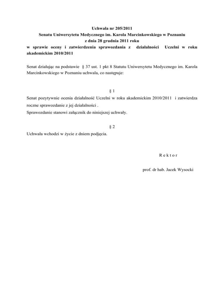 Uchwała nr 205/2011 Senatu Uniwersytetu Medycznego im. Karola Marcinkowskiego w Poznaniu z dnia 28 grudnia 2011 roku w sprawie oceny i zatwierdzenia sprawozdania z działalności Uczelni w roku akademickim 2010/2011 Senat działając na podstawie § 37 ust. 1 pkt 8 Statutu Uniwersytetu Medycznego im. Karola Marcinkowskiego w Poznaniu uchwala, co następuje: §1 Senat pozytywnie ocenia działalność Uczelni w roku akademickim 2010/2011 i zatwierdza roczne sprawozdanie z jej działalności . Sprawozdanie stanowi załącznik do niniejszej uchwały. §2 Uchwała wchodzi w życie z dniem podjęcia. Rektor prof. dr hab. Jacek Wysocki SPRAWOZDANIE Z DZIAŁALNOŚCI UNIWERSYTETU MEDYCZNEGO im. KAROLA MARCINKOWSKIEGO W POZNANIU W ROKU AKADEMICKIM 2010/2011 Miniony rok akademicki 2010/2011 to rok pod znakiem inwestycji w naszej Uczelni. W dniu 12 października 2010 roku odbyło się uroczyste otwarcie Biblioteki Głównej. Jest ona wyposażona m.in. w nowoczesną czytelnię multimedialną, czytelnię czasopism, sale pracy zbiorowej, kabiny pracy indywidualnej, samoobsługowy magazyn wypożyczalni. Była to długo oczekiwana w Uczelni inwestycja. W celu poprawy jakości kształcenia studentów, dzięki dofinansowaniu z Unii Europejskiej, w październiku 2010 roku otwarto Centrum Symulacji Medycznej wyposażone w nowoczesne symulatory pacjentów (fantomy), które można zaprogramować na tworzenie bardzo zróżnicowanych sytuacji klinicznych, w których uczą się działać studenci. Utworzono Centrum Innowacyjnych Technik Kształcenia, umożliwiające przeprowadzanie egzaminów na stanowiskach komputerowych. Stwarza to zdecydowanie bardziej obiektywne warunki oceny wiedzy studentów. Trwają prace przy budowie Centrum Biologii Medycznej. Planowany termin zakończenia inwestycji to rok 2012. Uczelnia podjęła działania w sprawie przejęcia od Ministerstwa Obrony Narodowej 111 Szpitala Wojskowego w Poznaniu SPZOZ. Będzie to kolejny szpital, w którym studenci naszej Uczelni będą zdobywali swoją wiedzę. W rankingu „ Rzeczpospolitej” i „ Polityki” Uczelnia zdobyła tytuł uczelni medycznej w kraju. najlepszej Sprawozdanie zawiera główne elementy działalności dydaktycznej, szkoleniowej, naukowej, finansowej, wydawniczej i inwestycyjnej Uniwersytetu Medycznego im. Karola Marcinkowskiego w Poznaniu w roku akademickim 2010/2011. KSZTAŁCENIE W roku akademickim 2010/2011 na czterech wydziałach i jedenastu kierunkach studiów stacjonarnych oraz dziewięciu kierunkach studiów niestacjonarnych kształciło się łącznie studentów: 8349 w tym: - Polaków na studiach stacjonarnych - 5683 - Polaków na studiach niestacjonarnych - 2666 - obcokrajowców -1044 ( w tym 1008 odbywających studia w języku angielskim) Liczbę studentów na poszczególnych kierunkach przedstawia tabela nr 1. Tabela nr 1 Liczba studiujących na poszczególnych kierunkach ( dane statystyczne na dzień 30.11.10 ) Kierunek studiów Lekarski CNJA Inni obcokrajowcy Studia stacjonarne Studia niestacjonarne 1228 255 691 - 24 - Lekarsko-Dentystyczny 363 109 CNJA 271 - 8 - 46 37 I stopnia 33 1 II stopnia 37 - Farmacja 759 91 Inni obcokrajowcy Techniki dentystyczne Studia I stopnia Biotechnologia CNJA 25 - Inni obcokrajowcy 3 - 158 2 Studia I stopnia 76 86 Studia II stopnia - 191 Studia I stopnia 226 309 Studia II stopnia 137 448 Studia I stopnia 212 92 Studia II stopnia 140 210 Studia I stopnia 213 97 Studia II stopnia 130 155 Studia I stopnia 279 169 Studia II stopnia 170 187 CNJA 21 - Inni obcokrajowcy 1 - Studia I stopnia 125 7 Studia II stopnia 78 - Analityka medyczna Kosmetologia Pielęgniarstwo Położnictwo Zdrowie Publiczne Fizjoterapia Dietetyka Ratownictwo medyczne I stopnia 110 95 Studia I stopnia 77 70 Studia II stopnia 42 55 5683 2666 Elektroradiologia RAZEM W roku akademickim 2010/2011 studia ukończyło: 372 lekarzy w tym: - 107 osoby studiujące w języku angielskim: w programie 4-letnim - 59 w programie 6-letnim - 48 5 obcokrajowców 147 lekarzy dentystów w tym: - 49 osoby studiujące w języku angielskim w programie 5 letnim 141 magistrów farmacji w tym: - 2 osób studiujących w języku angielskim w programie 5-letnim farmacja 21 magistrów analityki medycznej Studia stacjonarne I stopnia 10 osób z tytułem licencjata - biotechnologia 41 osób z tytułem licencjata - dietetyka 31 osób z tytułem licencjata - elektroradiologia 60 osób z tytułem licencjata - pielęgniarstwo 55 osób z tytułem licencjata - położnictwo 81 osoby z tytułem licencjata - fizjoterapia 36 osób z tytułem licencjata – zdrowie publiczne 18 osób z tytułem licencjata – ratownictwo medyczne 13 osób z tytułem licencjata – techniki dentystyczne 9 osób z tytułem licencjata – zdrowie publiczne, specj. higiena dentystyczna 21 osoby z tytułem licencjata - kosmetologia Studia niestacjonarne I stopnia 23 osób z tytułem licencjata – elektroradiologia 270 osób z tytułem licencjata – pielęgniarstwo 36 osoby z tytułem licencjata – fizjoterapia 92 osób z tytułem licencjata – położnictwo 21 osób z tytułem licencjata – zdrowie publiczne 7 osób z tytułem licencjata – ratownictwo medyczne 5 osób z tytułem licencjata – techniki dentystyczne 23 osób z tytułem licencjata - kosmetologia Studia stacjonarne II stopnia 23 magistrów biotechnologii 30 magistrów dietetyki 5 magistrów elektoradiologii 52 magistrów fizjoterapii 46 magistrów zdrowia publicznego 49 magistrów pielęgniarstwa 61 magistrów położnictwa Studia niestacjonarne II stopnia 35 magistrów kosmetologii 121 magistrów pielęgniarstwa 51 magistrów fizjoterapii 39 magistrów zdrowia publicznego 56 magistrów położnictwa 10 magistrów elektroradiologii Łącznie absolwentów – 2111 Pomoc stypendialna W roku akademickim 2010/2011 przyznano: - stypendia socjalne 575 stypendia naukowe 891 stypendia Ministra Zdrowia 9 stypendia dla osoby niepełnosprawnej 85 stypendia Rządu RP dla cudzoziemców 10 Organizacje studenckie W Uczelni 
