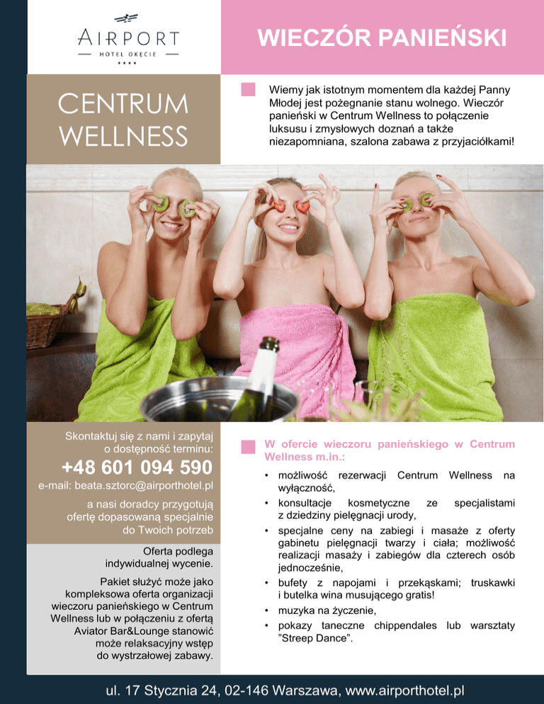 WIECZÓR PANIEŃSKI CENTRUM WELLNESS Skontaktuj się z nami i zapytaj o dostępność terminu: +48 601 094 590 e-mail: [email protected] a nasi doradcy przygotują ofertę dopasowaną specjalnie do Twoich potrzeb Oferta podlega indywidualnej wycenie. Pakiet służyć może jako kompleksowa oferta organizacji wieczoru panieńskiego w Centrum Wellness lub w połączeniu z ofertą Aviator Bar&Lounge stanowić może relaksacyjny wstęp do wystrzałowej zabawy. Wiemy jak istotnym momentem dla każdej Panny Młodej jest pożegnanie stanu wolnego. Wieczór panieński w Centrum Wellness to połączenie luksusu i zmysłowych doznań a także niezapomniana, szalona zabawa z przyjaciółkami! W ofercie wieczoru panieńskiego w Centrum Wellness m.in.: • możliwość rezerwacji Centrum Wellness na wyłączność, • konsultacje kosmetyczne ze specjalistami z dziedziny pielęgnacji urody, • specjalne ceny na zabiegi i masaże z oferty gabinetu pielęgnacji twarzy i ciała; możliwość realizacji masaży i zabiegów dla czterech osób jednocześnie, • bufety z napojami i przekąskami; truskawki i butelka wina musującego gratis! • muzyka na życzenie, • pokazy taneczne chippendales lub warsztaty ”Streep Dance”. ul. 17 Stycznia 24, 02-146 Warszawa, www.airporthotel.pl