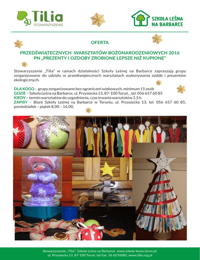 OFERTA PRZEDŚWIĄTECZNYCH WARSZTATÓW BOŻONARODZENIOWYCH 2016 PN „PREZENTY I OZDOBY ZROBIONE LEPSZE NIŻ KUPIONE” Stowarzyszenie „Tilia” w ramach działalności Szkoły Leśnej na Barbarce zapraszają grupy zorganizowane do udziału w przedświątecznych warsztatach wykonywania ozdób i prezentów ekologicznych. DLA KOGO – grupy zorganizowane bez ograniczeń wiekowych, minimum 15 osób GDZIE – Szkoła Leśna na Barbarce, ul. Przysiecka 13, 87-100 Toruń, , tel. 056 657 60 85 KIEDY – termin warsztatów do uzgodnienia, czas trwania warsztatów 1,5 h ZAPISY – Biuro Szkoły Leśnej na Barbarce w Toruniu, ul. Przysiecka 13, tel. 056 657 60 85, poniedziałek – piątek 8.00 – 16.00. Stowarzyszenie „Tilia”, Szkoła Leśna na Barbarce www.szkola-lesna.torun.pl, ul. Przysiecka 13, 87-100 Toruń, tel/fax. 56 6576085, www.tilia.org.pl CENNIK I OFERTA: Cena 6 zł od osoby - każda osoba wykonuje: ź zawieszkę na choinkę z plastra drewna, ź przestrzenną stojącą papierową choinkę udekorowaną koralikami, złotymi nitkami, piórkami itp. (prosimy, by uczestnicy zabrali na warsztaty ze sobą małe czasopismo lub książkę) ź wiszącą ozdobę z szyszki sosnowej i kasztanów lub żołędzi i materiałów dekoracyjnych tj. filc, papier, bawełna Cena 10 zł od osoby - każda osoba wykonuje: ź zawieszkę na choinkę z plastra drewna, ź malowanego drewnianego aniołka z zawieszką (sklejka drewniana) oraz do wyboru dwie z następujących rzeczy: ź mały stroik świąteczny- wianek ź dużego anioła z papieru, rafii i filcu ź bombkę z kuli styropianowej ozdobionej cekinami lub materiałem i wstążkami ź filcową zawieszkę na choinkę Cena 15 zł od osoby - każda osoba wykonuje: ź zawieszkę na choinkę z plastra drewna, ź malowanego drewnianego aniołka z zawieszką (sklejka drewniana) oraz do wyboru dwie rzeczy z następujących: ź 2 malowane płaskie drewniane bombki (sklejka drewniana) ź stroik świąteczny – wianek ź choinka ze styropianowej podstawy ozdobiona ekologicznymi materiałami tj. materiał, wstążki, filc, ź broszkę z filcu lub wstążki ź świąteczny obrazek na drewnianej sklejce. Stowarzyszenie „Tilia”, Szkoła Leśna na Barbarce www.szkola-lesna.torun.pl, ul. Przysiecka 13, 87-100 Toruń, tel/fax. 56 6576085, www.tilia.org.pl