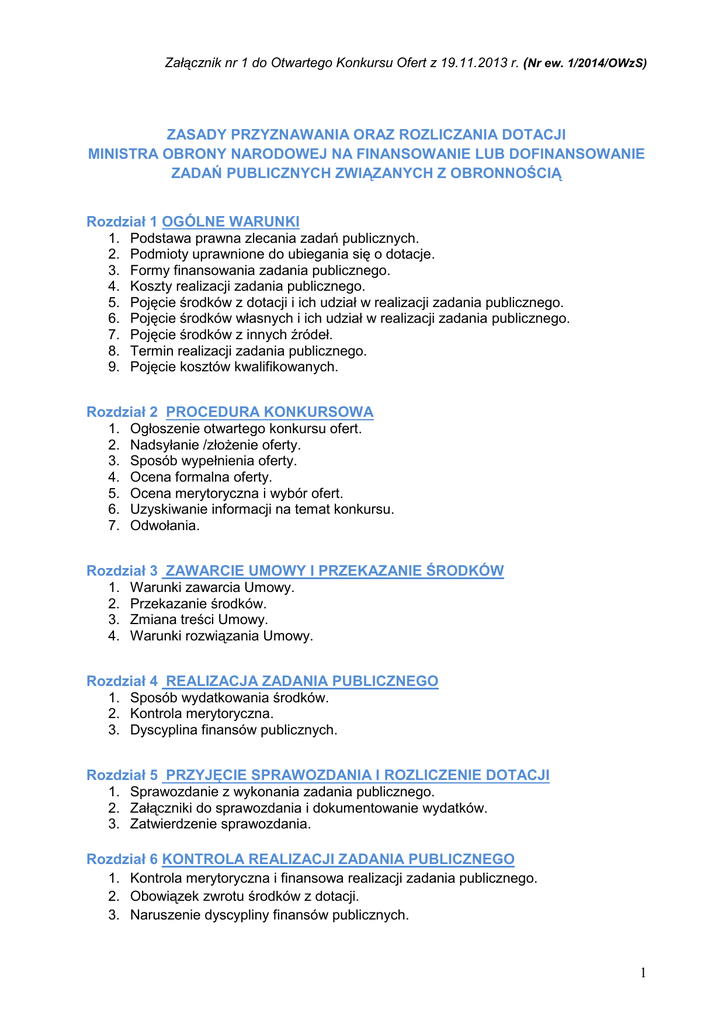 Załącznik nr 1 do Otwartego Konkursu Ofert z 19.11.2013 r. (Nr ew. 1/2014/OWzS) ZASADY PRZYZNAWANIA ORAZ ROZLICZANIA DOTACJI MINISTRA OBRONY NARODOWEJ NA FINANSOWANIE LUB DOFINANSOWANIE ZADAŃ PUBLICZNYCH ZWIĄZANYCH Z OBRONNOŚCIĄ Rozdział 1 OGÓLNE WARUNKI 1. Podstawa prawna zlecania zadań publicznych. 2. Podmioty uprawnione do ubiegania się o dotacje. 3. Formy finansowania zadania publicznego. 4. Koszty realizacji zadania publicznego. 5. Pojęcie środków z dotacji i ich udział w realizacji zadania publicznego. 6. Pojęcie środków własnych i ich udział w realizacji zadania publicznego. 7. Pojęcie środków z innych źródeł. 8. Termin realizacji zadania publicznego. 9. Pojęcie kosztów kwalifikowanych. Rozdział 2 PROCEDURA KONKURSOWA 1. Ogłoszenie otwartego konkursu ofert. 2. Nadsyłanie /złożenie oferty. 3. Sposób wypełnienia oferty. 4. Ocena formalna oferty. 5. Ocena merytoryczna i wybór ofert. 6. Uzyskiwanie informacji na temat konkursu. 7. Odwołania. Rozdział 3 ZAWARCIE UMOWY I PRZEKAZANIE ŚRODKÓW 1. Warunki zawarcia Umowy. 2. Przekazanie środków. 3. Zmiana treści Umowy. 4. Warunki rozwiązania Umowy. Rozdział 4 REALIZACJA ZADANIA PUBLICZNEGO 1. Sposób wydatkowania środków. 2. Kontrola merytoryczna. 3. Dyscyplina finansów publicznych. Rozdział 5 PRZYJĘCIE SPRAWOZDANIA I ROZLICZENIE DOTACJI 1. Sprawozdanie z wykonania zadania publicznego. 2. Załączniki do sprawozdania i dokumentowanie wydatków. 3. Zatwierdzenie sprawozdania. Rozdział 6 KONTROLA REALIZACJI ZADANIA PUBLICZNEGO 1. Kontrola merytoryczna i finansowa realizacji zadania publicznego. 2. Obowiązek zwrotu środków z dotacji. 3. Naruszenie dyscypliny finansów publicznych. 1 Rozdział 1 OGÓLNE WARUNKI 1. Podstawa prawna zlecania i rozliczania zadań publicznych. a) Ustawa z dnia 24 kwietnia 2003 roku o działalności pożytku publicznego i o wolontariacie (Dz. U. z 2010 r., Nr 234, poz. 1536 z późn. zm.), zwana dalej ustawą o działalności pożytku publicznego, b) Ustawa z dnia o finansach publicznych (Dz. U. z 2009 r., Nr 157, poz. 1240 z późn. zm.), zwana dalej ustawą o finansach publicznych, c) Ustawa z dnia 29 września 1994 r. o rachunkowości (Dz. U. z 2013 r., poz. 330), zwana dalej ustawą o rachunkowości, d) Ustawa z dnia 14 czerwca 1960 r. Kodeks postępowania administracyjnego (Dz. U. z 2013 r., poz. 267 j.t.) zwana dalej k.p.a., e) Ustawa z dnia 29 sierpnia 1997 r. Ordynacja podatkowa (Dz. U. z 2012 r. poz. 749 j.t. z późn. zm.), zwana dalej Ordynacją podatkową, f) Ustawa z dnia 17 grudnia 2004 r. o odpowiedzialności za naruszenie dyscypliny finansów publicznych (Dz. U. z 2013 r. poz. 168 j.t), zwana dalej ustawą o odpowiedzialności, g) Ustawa z dnia 11 marca 2004 r. o podatku od towarów i usług (Dz. U. z 2011 r., Nr 177, poz. 1054 j.t. z późn. zm.), zwana dalej ustawą o VAT. 2. Podmioty uprawnione do ubiegania się o dotacje. Podmiotami uprawnionymi do składania ofert realizacji zadania publicznego są organizacje pozarządowe oraz inne podmioty uprawnione, zgodnie z przepisami ustawy o działalności pożytku publicznego. Podmioty uprawnione mogą składać oferty wspólne. 3. Formy finansowania zadania publicznego. Zlecanie realizacji zadania publicznego odbywa się w formie: 1. powierzenia realizacji zadania wraz z udzieleniem dotacji na jego finansowanie, 2. wspierania realizacji zadania wraz z udzieleniem dotacji na jego dofinansowanie. 4. Koszty realizacji zadania publicznego. Kosztami realizacji zadania publicznego są koszty poniesione na jego realizację, pochodzące z: a) uzyskanej dotacji, b) środków finansowych własnych podmiotu realizującego zadanie, c) środków finansowych z innych źródeł, oraz stanowiące równowartość kosztów wkładu osobowego podmiotu realizującego zadanie publiczne (wkład niefinansowy). 2 5. Pojęcie środków z dotacji i ich udział w realizacji zadania publicznego. Środkami z dotacji są środki publiczne, udzielone przez uprawniony organ z przeznaczeniem na realizację zadania publicznego. Mogą one być wykorzystane wyłącznie zgodnie z przepisami Umowy realizacji zadania publicznego (zwaną dalej Umową). Podlegają one szczególnym zasadom rozliczania na podstawie ustawy o finansach publicznych. Ze środków z dotacji mogą być finansowane wyłącznie działania z zakresu działalności statutowej nieodpłatnej i odpłatnej podmiotu realizującego zadanie publiczne, wyłącznie na pokrycie kosztów bezpośrednio związanych z realizacją tego zadania określonego w Umowie. Środki z dotacji muszą zostać wykorzystane w roku budżetowym, w którym zostały udzielone, wyłącznie na realizację zadania publicznego określonego w Umowie. Środki z dotacji mogą być przeznaczone również na: koszty administracyjne związane z obsługą realizacji zadania publicznego w wysokości nieprzekraczającej 10% przyznanych środków z dotacji, w tym koszty osobowe (np. koordynator projektu, obsługa biurowa, księgowość) i koszty funkcjonowania podmiotu związane z realizacją zadania publicznego w stosownej części, przypadającej na dany projekt, koszty osobowe merytoryczne. Środki z dotacji nie mogą zostać przeznaczone na finansowanie ewentualnej działalności gospodarczej podmiotu i nie mogą zostać przyznane na zadanie publiczne już zrealizowane. 6. Pojęcie środków własnych i ich udział w realizacji zadania publicznego. Środkami własnymi są środki pochodzące bezpośrednio od podmiotu realizującego zadanie (własne). Środki własne mogą mieć charakter środków finansowych i niefinansowych. Środki finansowe to środki finansowe własne, środki finansowe z innych źródeł, tj. wpłaty i opłaty adresatów zadania publicznego, środki finansowe z innych źródeł publicznych oraz pozostałe środki finansowe. Środki te podlegają takim samym zasadom rozliczania, jak środki finansowe uzyskane z dotacji. W przypadku realizacji zadania w formie wspierania, obowiązkowy udział