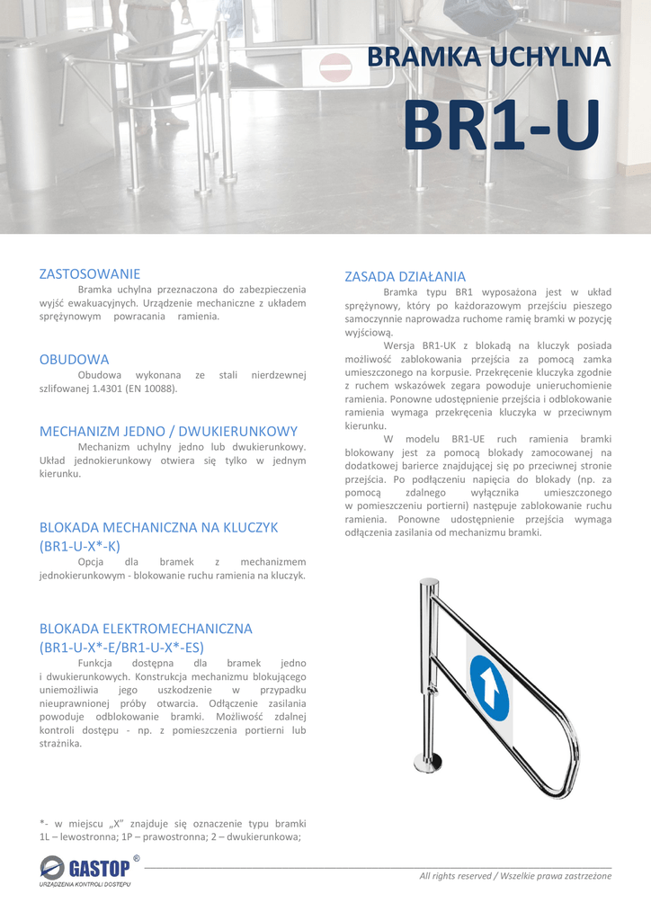 BRAMKA UCHYLNA BR1-U ZASTOSOWANIE Bramka uchylna przeznaczona do zabezpieczenia wyjść ewakuacyjnych. Urządzenie mechaniczne z układem sprężynowym powracania ramienia. OBUDOWA Obudowa wykonana szlifowanej 1.4301 (EN 10088). ze stali nierdzewnej MECHANIZM JEDNO / DWUKIERUNKOWY Mechanizm uchylny jedno lub dwukierunkowy. Układ jednokierunkowy otwiera się tylko w jednym kierunku. BLOKADA MECHANICZNA NA KLUCZYK (BR1-U-X*-K) ZASADA DZIAŁANIA Bramka typu BR1 wyposażona jest w układ sprężynowy, który po każdorazowym przejściu pieszego samoczynnie naprowadza ruchome ramię bramki w pozycję wyjściową. Wersja BR1-UK z blokadą na kluczyk posiada możliwość zablokowania przejścia za pomocą zamka umieszczonego na korpusie. Przekręcenie kluczyka zgodnie z ruchem wskazówek zegara powoduje unieruchomienie ramienia. Ponowne udostępnienie przejścia i odblokowanie ramienia wymaga przekręcenia kluczyka w przeciwnym kierunku. W modelu BR1-UE ruch ramienia bramki blokowany jest za pomocą blokady zamocowanej na dodatkowej barierce znajdującej się po przeciwnej stronie przejścia. Po podłączeniu napięcia do blokady (np. za pomocą zdalnego wyłącznika umieszczonego w pomieszczeniu portierni) następuje zablokowanie ruchu ramienia. Ponowne udostępnienie przejścia wymaga odłączenia zasilania od mechanizmu bramki. Opcja dla bramek z mechanizmem jednokierunkowym - blokowanie ruchu ramienia na kluczyk. BLOKADA ELEKTROMECHANICZNA (BR1-U-X*-E/BR1-U-X*-ES) Funkcja dostępna dla bramek jedno i dwukierunkowych. Konstrukcja mechanizmu blokującego uniemożliwia jego uszkodzenie w przypadku nieuprawnionej próby otwarcia. Odłączenie zasilania powoduje odblokowanie bramki. Możliwość zdalnej kontroli dostępu - np. z pomieszczenia portierni lub strażnika. *- w miejscu „X” znajduje się oznaczenie typu bramki 1L – lewostronna; 1P – prawostronna; 2 – dwukierunkowa; ______________________________________________________________________________ All rights reserved / Wszelkie prawa zastrzeżone WYMIARY BR1-U-1L; BR1-U-1P BR1-U-2 M – punkt mocowania bramki do podłoża. WERSJE URZĄDZENIA DANE TECHNICZNE BR1-U-X* – urządzenie bez blokady BR1-U-X*-K – urządzenie blokowane na kluczyk BR1-U-X*-E – urządzenie wyposażone w dodatkowy stojak z blokadą elektromagnetyczną BR1-U-X*-ES – urządzenie wyposażone w blokadę elektromagnetyczną montowaną do ściany. Materiał wykonania STAL NIERDZ. 1,4301 (EN1088) Kierunek otwierania JEDNO/DWUKIERUNKOWY Mocowanie do podłoża KOTWY WKLEJANE Elementy mocujące NAKRĘTKI Blokada elektromagnetyczna OPCJONALNIE Napięcie elektromag. (BR1-U-X-E/ES) 24VDC / 12 VDC Maksymalny pobór prądu 380 mA/500 mA * – w miejsce „X” należy wpisać oznaczenie kierunków działania urządzenia: 1L – lewostronne, 1P – prawostronne, 2 – dwukierunkowe. INFORMACJE DODATKOWE DŁUGOŚĆ RAMIENIA – standard 90cm, max 120cm. Firma/dystrybutor: ______________________________________________________________________________ All rights reserved / Wszelkie prawa zastrzeżone