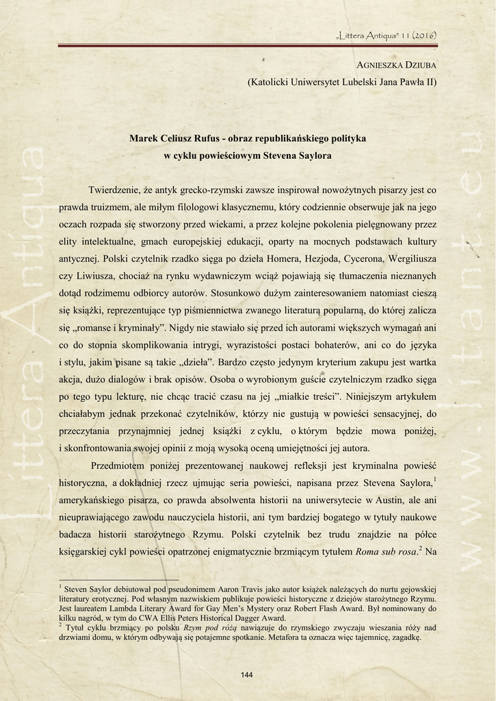 „Littera Antiqua” 11 (2016) AGNIESZKA DZIUBA Littera Antiqua Marek Celiusz Rufus - obraz republikańskiego polityka w cyklu powieściowym Stevena Saylora www.litant.eu (Katolicki Uniwersytet Lubelski Jana Pawła II) Twierdzenie, że antyk grecko-rzymski zawsze inspirował nowożytnych pisarzy jest co prawda truizmem, ale miłym filologowi klasycznemu, który codziennie obserwuje jak na jego oczach rozpada się stworzony przed wiekami, a przez kolejne pokolenia pielęgnowany przez elity intelektualne, gmach europejskiej edukacji, oparty na mocnych podstawach kultury antycznej. Polski czytelnik rzadko sięga po dzieła Homera, Hezjoda, Cycerona, Wergiliusza czy Liwiusza, chociaż na rynku wydawniczym wciąż pojawiają się tłumaczenia nieznanych dotąd rodzimemu odbiorcy autorów. Stosunkowo dużym zainteresowaniem natomiast cieszą się książki, reprezentujące typ piśmiennictwa zwanego literaturą popularną, do której zalicza się „romanse i kryminały”. Nigdy nie stawiało się przed ich autorami większych wymagań ani co do stopnia skomplikowania intrygi, wyrazistości postaci bohaterów, ani co do języka i stylu, jakim pisane są takie „dzieła”. Bardzo często jedynym kryterium zakupu jest wartka akcja, dużo dialogów i brak opisów. Osoba o wyrobionym guście czytelniczym rzadko sięga po tego typu lekturę, nie chcąc tracić czasu na jej „miałkie treści”. Niniejszym artykułem chciałabym jednak przekonać czytelników, którzy nie gustują w powieści sensacyjnej, do przeczytania przynajmniej jednej książki z cyklu, o którym będzie mowa poniżej, i skonfrontowania swojej opinii z moją wysoką oceną umiejętności jej autora. Przedmiotem poniżej prezentowanej naukowej refleksji jest kryminalna powieść historyczna, a dokładniej rzecz ujmując seria powieści, napisana przez Stevena Saylora, 1 amerykańskiego pisarza, co prawda absolwenta historii na uniwersytecie w Austin, ale ani nieuprawiającego zawodu nauczyciela historii, ani tym bardziej bogatego w tytuły naukowe badacza historii starożytnego Rzymu. Polski czytelnik bez trudu znajdzie na półce księgarskiej cykl powieści opatrzonej enigmatycznie brzmiącym tytułem Roma sub rosa.2 Na 1 Steven Saylor debiutował pod pseudonimem Aaron Travis jako autor książek należących do nurtu gejowskiej literatury erotycznej. Pod własnym nazwiskiem publikuje powieści historyczne z dziejów starożytnego Rzymu. Jest laureatem Lambda Literary Award for Gay Men’s Mystery oraz Robert Flash Award. Był nominowany do kilku nagród, w tym do CWA Ellis Peters Historical Dagger Award. 2 Tytuł cyklu brzmiący po polsku Rzym pod różą nawiązuje do rzymskiego zwyczaju wieszania róży nad drzwiami domu, w którym odbywają się potajemne spotkanie. Metafora ta oznacza więc tajemnicę, zagadkę. 144 „Littera Antiqua” 11 (2016) serię kryminałów składa się, jak na razie, piętnaście tomów, z odrębnymi tytułami, spojonych w logiczną i chronologiczną całość przez fikcyjną postać głównego bohatera - Gordianusa, zwanego Poszukiwaczem.3 Akcja powieści rozgrywa się w różnych miejscach Imperium www.litant.eu Romanum i Galli, ale przede wszystkim w Rzymie schyłku republiki w okresie od 81 do 46 Littera Antiqua roku przed Chr. Każdy tom opowiada o innej zagadce, którą skutecznie rozwiązuje Gordianus. O ile zarówno główny bohater, jak i jego rodzina są, jak wyżej wspomniałam, kreacją odautorską, o tyle zdecydowana większość bohaterów powieści Saylora, w tym postaci kluczowe dla przebiegu narracji czy zawiązania intrygi, to osoby znane z historii rzymskiej, jak choćby Marek Tulliusz Cyceron, częsty zleceniodawca Gordianusa, Gnejusz Pompejusz, Gajusz Juliusz Cezar, Marek Licyniusz Krassus, Lucjusz Korneliusz Sulla i inni politycy odgrywający kluczową rolę w Rzymie schyłku republiki. Obok nich w powieściach amerykańskiego pisarza pojawiają się postaci historyczne mniej znane z podręczników. Jedną z takich osób jest ciekawy i niejednoznacznie oceniany przez historyków Marek Celiusz Rufus, ekwita rzymski i uczeń Marka Tulliusza Cycerona. Czytelnik po raz pierwszy spotyka młodego Marka w tomie zatytułowanym Zagadka Katyliny.4 Śledztwo rzymskiego detektywa jest związane z bezgłowymi zwłokami pojawiającymi się w jego wiejskiej posiadłości, gdzie schronił się wraz z rodziną przed zgiełkiem miasta. Wielka polityka daje o sobie jednak znać właśnie za pośrednictwem Celiusza, który niespodziewanie pojawia się w domu Gordianusa z prośbą o udzielenie kilkudniowej gościny Lucjuszowi Sergiuszowi Katylinie, ubiegającemu się o urząd konsula na rok 62. Saylor wprowadza postać ekwity w narrację opisując jego wygląd: Był to wysoki, przystojny młodzieniec o ciemnych oczach. Włosy miał po bokach krótko przystrzyżone, ale dłuższe u góry, i falująca grzywka opadała mu nisko na czoło. Brodę nosił podgoloną tak, że wyglądała jak czarny pasek na policzkach i podbródku, podkreślając jego wydatne kości policzkowe i czerwień ust.5 Tak dokładny opis szczegółów fizjonomii młodego człowieka nasuwa przypuszczenia o fantazji autora. Jednakże najważniejsze informacje są autentyczne i pochodzą od samego 3 W latach 1991 – 2015 ukazały się następujące tomy: Roman Blood ( Rzymska krew), Arms of Nemesis (Ramiona Nemesis), Catilina’s Riddle (Zagadka Katyliny), The Venus Throw (Rzut Wenus), a Murder on Via Appian Way (Morderstwo na Via Appia), zbiór opowiadań The House of Vestals (Dom Westalek), Rubicon (Rubikon), Last Seen in Massilia (Ostatnio widziany w Massilii), Mist of Prophecies (Mgliste proroctwa), The Judgment of Caesar (Werdykt Cezara), zbiór opowiadań a Gladiator Dies only Once (Gladiator umiera tylko raz), The Triumph of Caesar (Triumf Cezara), zbiór opowiadań The Seven Wonders (Siedem cudów), Raiders of the Nile (Złoczyńcy znad Nilu), Wrath of the Furies (Gniew Furii). Wszystkie powieści zostały przet