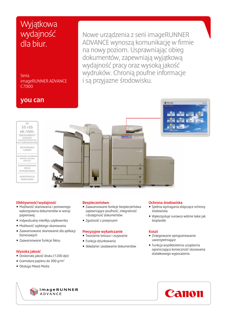 Wyjątkowa wydajność dla biur. Seria imageRUNNER ADVANCE C7000 Nowe urządzenia z serii imageRUNNER ADVANCE wynoszą komunikację w firmie na nowy poziom. Usprawniając obieg dokumentów, zapewniają wyjątkową wydajność pracy oraz wysoką jakość wydruków. Chronią poufne informacje i są przyjazne środowisku. you can Do 5 5 i 65 str./min. OBSŁUGA RÓŻNYCH NOŚNIKÓW O GRAMATURZE DO 300 g/m2 i FORMACIE DO SRA3 DRUKOWANIE 1200DPI POJEMNOŚĆ ZASOBNIKA PAPIERU DO 6900 ARKUSZY ZAAWANSOWANE OPCJE WYKAŃCZANIA KONSTRUKCJA MODUŁOWA Efektywność/wydajność • Możliwość skanowania i ponownego wykorzystania dokumentów w wersji papierowej Bezpieczeństwo • Zaawansowane funkcje bezpieczeństwa zapewniające poufność, integralność i dostępność dokumentów •Indywidualny interfejs użytkownika •Zgodność z przepisami Możliwość szybkiego skanowania • skanowanie dla aplikacji Precyzyjne wykańczanie •Zaawansowane biznesowych •Tworzenie broszur i zszywanie Zaawansowane funkcje faksu • •Funkcja dziurkowania •Składanie i podawanie dokumentów Wysoka jakość •Doskonała jakość druku (1200 dpi) •Gramatura papieru do 300 g/m •Obsługa Mixed Media 2 Ochrona środowiska wymagania dotyczące ochrony •Spełnia środowiska surowce wtórne takie jak •Wykorzystuje bioplastiki Koszt oprogramowanie •Zintegrowane uwierzytelniające współdzielenia urządzenia •Funkcja ograniczająca konieczność stosowania dodatkowego wyposażenia Specyfikacja: Seria imageRUNNER ADVANCE C7000 Typ Urządzenie wolnostojące (oddzielnie czytnik/drukarka) Maksymalny rozmiar oryginału A3 Rozmiar kopii Kaseta 1.2 A4 Kaseta 3.4 A5R - SRA3 (320 x 450 mm), 13” x 19” (330 x 483 mm) Dowolny rozmiar od 139,7 x 182 mm do 330,2 x 487,7 mm Podajnik ręczny A5R- SRA3 (320 x 450 mm), 13” x 19” (330 x 483 mm), Koperty DL, ISO-B5, ISO-C5 Dowolny rozmiar od 100 x 148 mm do 330,2 x 487,7 mm Rozdzielczość Odczyt 600 dpi x 600 dpi Kopiowanie 600 dpi x 600 dpi Drukowanie 1200 dpi x 1200 dpi (tylko tekst/linie) Gradacja 256 kolorów Szybkość kopiowania /drukowania A4 C7065i: 65 str./min. (czarno-biały/kolorowy) C7055i: 55 str./min. (czarno-biały/kolorowy) A3 C7065i: 33 str./min. (czarno-biały/kolorowy) C7055i: 28 str./min. (czarno-biały/kolorowy) Powiększenie Zoom 25-400% Stały 25%, 50%, 71%, 100%, 141%, 200%, 400% Czas uzyskania pierwszej kopii Tryb czarno-biały 4,9sek. Tryb pełnego koloru 6,6sek. Czas nagrzewania 5 minut Ilość kopii/wydruków 1 do 9999 arkuszy Drukowanie dwustronne Standardowe automatyczne bezstosowe Gramatura papieru Kaseta gramatura od 52 g/m2 do 220 g/m2 Podajnik ręczny gramatura od 52 g/m2 do 300 g/m2 Dwustronne gramatura od 52 g/m2 do 220 g/m2 Pojemność papieru Standardowo 1100 arkuszy x 2 kasety (80g/m2) 550 arkuszy x 2 kasety (80g/m2) Podajnik ręczny: 100 arkuszy (80 g/m2) Podajnik papieru 3 500 arkuszy (80 g/m2) Całkowita pojemność 6 900 arkuszy Procesor 1,2GHz Pamięć 2,5GB Dysk twardy 80GB Interfejs Ethernet (1000BaseT/100Base-TX/10Base-T) (Sieć bezprzewodowa LAN (IEEE802.11b/g, Opcja), USB2.0 Zasilanie 220-240V AC, 50/60Hz Pobór mocy 2,5kW max. (65 str./min.); 2,0kW max. (55 str./min.) Wymiary (szer./dł./wys.) 689 x 932 x 1221 (z 1PDS) Waga Około 282kg (z 1PDS) Specyfikacja drukowania (Standard) PDL UFRII, PCL5c/6, Adobe PostScript 3 Rozdzielczość 1200 dpi x 1200 dpi (tylko Tekst/wiersze), 600 dpi x 600 dpi Pamięć 2,5 GB (wykorzystuje RAM jednostki centralnej) Dysk twardy 80 GB (wykorzystuje dysk twardy jednostki centralnej) Procesor Procesor Canon, 1,2 GHz (wykorzystuje dysk twardy jednostki centralnej) Czcionki PS Roman136 Czcionki PCL Roman93, Bitmap10, OCR2 Obsługiwane systemy operacyjne PCL Windows 2000/XP/Server2003/Vista/Server2008/Win7 Adobe PostScript 3 Windows 2000/XP/Server2003/Vista/Server2008/Win7, Mac OSX (10.4.9 lub wersja późniejsza) UFR II Windows 2000/XP/Server2003/Vista/Server2008/Win7, Mac OSX (10.4.9 lub wersja późniejsza) Mac-PPD Mac OS 9.1 lub wersja późniejsza, Mac OSX (10.2.8 lub wersja późniejsza) Interfejs Interfejs Ethernet (1000Base-T/100Base-TX/10Base-T)(Sieć bezprzewodowa LAN (IEEE802.11b/g, Opcja), USB 2.0 Protokół sieciowy TCP/IP (LPD/Port9100/WSD/IPP/IPPS/SMB/FTP), IPv6, IPX/SPX(NDS,Bindery), AppleTalk Sterownik skanera Sieciowy sterownik TWAIN (75 do 600 dpi 24 bit – kolor/ 8 bit – skala szarości /2 bit – czarno-biały) Specyfikacja wysyłania (Standard) Szybkość skanowania (A4, 300dpi) Rozdzielczość skanowania Odbiorcy Książka adresowa Format plików 1120 obrazów na minutę (kolorowy/czarno-biały), 200 obrazów na minutę (czarno-biały)/140 obrazów na minutę (kolorowy) z 1PDS 100dpi,150dpi, 200 x 100dpi, 200dpi, 200 x 400dpi, 300dpi, 400dpi, 600dpi E-Mail/Internet FAX (SMTP), PC (SMB, FTP), iWDM, WebDAV LDAP, Lokalna (Maks. 1800) TIFF, JPEG, PDF, XPS, Wysoka kompresja PDF/XPS, PDF/A-1b, Optymalizacja PDF dla Sieci Zestaw funkcji bezpieczeństwa uniwersalnego wysyłania-D1 Format plików Czytnik obrazów kolorowych dwustronnych-A1 Rozmiar papieru Gramatura papieru Maks. liczba oryginałów Prędkość skanowania (maks.) Szyfrowany PDF, PDF/XPS z podpisem urządzenia Wymiary (szer./dł./wys.) Waga A3, A4, A4R, A5, A5R Oryginał jednostronny o gramaturze od 38 g/m2 do 220 g/m2 Oryginał dwustronny o gramaturze od 50 g/m2 do 220 g/m2 300 arkuszy (80 g/m2) Kopia (jednostronna) A4 120 obrazów/minutę 600 dpi (czarno-biała), 70 obrazów/minutę 600 dpi (kolorowa) Skan (jednostronny) A4 120 obrazów/minutę 300 dpi (kolorowy/ czarno-biały) Kopia (dwustronna) A4 120 obrazów/minutę 600 dpi (czarno-biała), 70 obrazów/minutę 600 dpi (kolorowa) Skan (dwustronny) A4 200 obrazów/minutę 300 dpi (czarno-biały), 140 obrazów/minutę 300 dpi (kolorowy) 635 x 590 x 262mm Około 38,9kg Magazyn papieru-A1 Rozmiar papieru Gramatura papieru Pojemność papieru Wymiary (szer./dł./wys.) Waga A4 52 g/m2 do 220 g/m2 3 500 arkuszy (80 g/m2) 323 x 583 x 570mm Około 37kg Taca PO