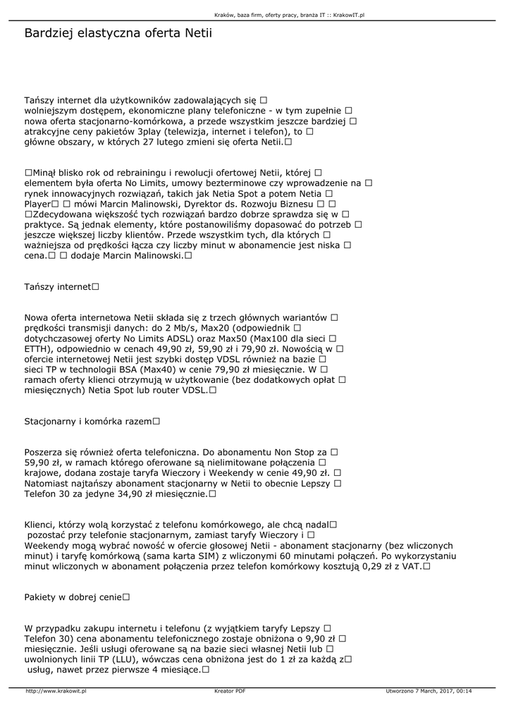 Kraków, baza firm, oferty pracy, branża IT :: KrakowIT.pl Bardziej elastyczna oferta Netii Tańszy internet dla użytkowników zadowalających się wolniejszym dostępem, ekonomiczne plany telefoniczne - w tym zupełnie nowa oferta stacjonarno-komórkowa, a przede wszystkim jeszcze bardziej atrakcyjne ceny pakietów 3play (telewizja, internet i telefon), to główne obszary, w których 27 lutego zmieni się oferta Netii. Minął blisko rok od rebrainingu i rewolucji ofertowej Netii, której elementem była oferta No Limits, umowy bezterminowe czy wprowadzenie na rynek innowacyjnych rozwiązań, takich jak Netia Spot a potem Netia Player mówi Marcin Malinowski, Dyrektor ds. Rozwoju Biznesu Zdecydowana większość tych rozwiązań bardzo dobrze sprawdza się w praktyce. Są jednak elementy, które postanowiliśmy dopasować do potrzeb jeszcze większej liczby klientów. Przede wszystkim tych, dla których ważniejsza od prędkości łącza czy liczby minut w abonamencie jest niska cena. dodaje Marcin Malinowski. Tańszy internet Nowa oferta internetowa Netii składa się z trzech głównych wariantów prędkości transmisji danych: do 2 Mb/s, Max20 (odpowiednik dotychczasowej oferty No Limits ADSL) oraz Max50 (Max100 dla sieci ETTH), odpowiednio w cenach 49,90 zł, 59,90 zł i 79,90 zł. Nowością w ofercie internetowej Netii jest szybki dostęp VDSL również na bazie sieci TP w technologii BSA (Max40) w cenie 79,90 zł miesięcznie. W ramach oferty klienci otrzymują w użytkowanie (bez dodatkowych opłat miesięcznych) Netia Spot lub router VDSL. Stacjonarny i komórka razem Poszerza się również oferta telefoniczna. Do abonamentu Non Stop za 59,90 zł, w ramach którego oferowane są nielimitowane połączenia krajowe, dodana zostaje taryfa Wieczory i Weekendy w cenie 49,90 zł. Natomiast najtańszy abonament stacjonarny w Netii to obecnie Lepszy Telefon 30 za jedyne 34,90 zł miesięcznie. Klienci, którzy wolą korzystać z telefonu komórkowego, ale chcą nadal pozostać przy telefonie stacjonarnym, zamiast taryfy Wieczory i Weekendy mogą wybrać nowość w ofercie głosowej Netii - abonament stacjonarny (bez wliczonych minut) i taryfę komórkową (sama karta SIM) z wliczonymi 60 minutami połączeń. Po wykorzystaniu minut wliczonych w abonament połączenia przez telefon komórkowy kosztują 0,29 zł z VAT. Pakiety w dobrej cenie W przypadku zakupu internetu i telefonu (z wyjątkiem taryfy Lepszy Telefon 30) cena abonamentu telefonicznego zostaje obniżona o 9,90 zł miesięcznie. Jeśli usługi oferowane są na bazie sieci własnej Netii lub uwolnionych linii TP (LLU), wówczas cena obniżona jest do 1 zł za każdą z usług, nawet przez pierwsze 4 miesiące. http://www.krakowit.pl Kreator PDF Utworzono 7 March, 2017, 00:14 Kraków, baza firm, oferty pracy, branża IT :: KrakowIT.pl Standardowa oferta pakietów telewizyjnych oraz oferta Telewizji Osobistej z HBO GO pozostaje bez większych zmian. Zmiany w ofercie internetowej i telefonicznej sprawiają jednak, że w wariancie podstawowym standardowa oferta 3play (telewizja cyfrowa, internet, telefon) dostępna jest już za 89,90 zł. W ramach oferty klienci otrzymują w bezpłatne użytkowanie Netia Player - zaawansowany dekoder cyfrowej telewizji, zapewniający dodatkowo dostęp do całej palety serwisów VoD, Facebooka, YouTube i innych popularnych serwisów internetowych. Umowy zawierane są na okres 24 miesięcy, a w przypadku wcześniejszego zerwania umowy naliczane są standardowe opłaty wyrównawcze. Opłaty aktywacyjne za poszczególne usługi wynoszą 1 zł. http://www.krakowit.pl Kreator PDF Utworzono 7 March, 2017, 00:14