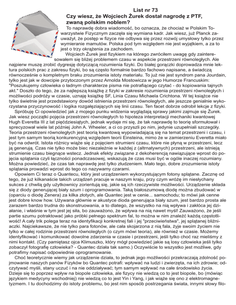 List nr 73 Czy wiesz, że Wojciech Żurek dostał nagrodę z PTF, zwaną polskim noblem? To naprawdę dobra wiadomość, bo oznacza, że chociaż w Polskim Towarzystwie Fizycznym zaczęła się wymiana kadr. Jak wiesz, już Planck zauważył, że postęp w fizyce nie odbywa się przez rozwój umysłowy tylko przez wymieranie mamutów. Polska pod tym względem nie jest wyjątkiem, a za to jest o trzy okrążenia za zachodem. Wojciech Żurek jest fizykiem na którego zwróciłem uwagę gdy zainteresowałem się bliżej problemem czasu w aspekcie przestrzeni równoległych. Ale najpierw muszę zrobić dygresję dotyczącą rozumienia fizyki. Do białej gorączki doprowadza mnie lektura polskich prac z zakresu fizyki, bo są często formalnie bardzo fachowo napisane, a świadczą równocześnie o kompletnym braku zrozumienia istoty materiału. To już nie jest syndrom pana Jourdain, tylko jest jak w dowcipie przytoczonym przez Arnolda Mostowicza w jego Humorze Francuskim: "Poszukujemy człowieka o ładnym charakterze pisma nie potrafiącego czytać - do kopiowania tajnych akt." Doszło do tego, że za najlepszą książkę z fizyki w zakresie rozumienia przestrzeni równoległych i możliwości podróży w czasie, uznaję książkę SF, Linia Czasu Michaela Crichtona. W tej książce nie tylko świetnie jest przedstawiony dowód istnienia przestrzeni równoległych, ale jeszcze genialnie wykorzystana przyczynowość i logika rozgałęziających się linii czasu. Ten facet dobrze odrobił lekcje z fizyki. Spróbuję Ci opowiedzieć jak z mojego punku widzenia wyglądają sprawy jakimi zajmuje się Żurek. Jak wiesz początki pojęcia przestrzeni równoległych to hipoteza interpretacji mechaniki kwantowej Hugh Everetta III z lat pięćdziesiątych, jednak wydaje mi się, że tak naprawdę to teorię sformułował i sprecyzował wiele lat później John A. Wheeler, a ci co przyszli po nim, jedynie uzupełniali szczegóły. Teoria przestrzeni równoległych jest teorią kwantową wypowiadającą się na temat przestrzeni i czasu, i jest tym samym teorią konkurencyjną względem teorii Einsteina, mimo że w zamierzeniu Everetta miało być na odwrót. Istota różnicy wiąże się z pojęciem strumieni czasu, które nie płyną w przestrzeni, lecz ją generują. Czas nie tylko może biec niezależnie w każdej z (altrnatywnych) przestrzeni, ale istnieją strumienie czasu biegnące wstecz. Jednak efekty związane z dekoherencją nawiązujące wprost do pojęcia splątania czyli łączności ponadczasowej, wskazują że czas musi być w ogóle inaczej rozumiany. Można powiedzieć, że czas tak naprawdę jest tylko złudzeniem. Mało tego, dobre zrozumienie istoty splątania prowadzi wprost do tego co nazywamy czarami. Opowiem Ci teraz o Quantecu, który jest urządzeniem wykorzystującym fotony splątane. Zacznę od tego, że już kilkanaście takich urządzeń pracuje w naszym kraju, przy czym wróżę im niesłychany sukces z chwilą gdy użytkownicy zorientują się, jakie są ich rzeczywiste możliwości. Urządzenie składa się z diody generującej biały szum i oprogramowania. Taką białoszumową diodę można zbudować w (oparciu o diodę Zenera) za kilka złotych, ale Quantec jest w cenie... samochodu; to mówi jak cenne jest dobre know how. Używana głównie w akustyce dioda generująca biały szum, jest bardzo prosta ale zarazem bardzo trudna do skonstruowania, a to dlatego, że wszystko na nią wpływa i zakłóca jej działanie, i właśnie w tym jest jej siła, bo zauważono, że wpływa na nią nawet myśl! Zauważono, że jeśli partie szumu potraktować jako próbki pełnego spektrum fal, to można w nim znaleźć każdą częstotliwość! A cały trik polega teraz na identyfikacji konkretnej fali i jej "przeciwieństwa", jej splątanej bliźniaczki. Najciekawsze, że nie tylko para fotonów, ale cała skojarzona z nią fala, żyje swoim życiem nie tylko w całej rodzinie przestrzeni równoległych (o czym mówi teoria), ale również w czasie. Możemy identyfikować i komunikować dowolne zdarzenia w czasie i przestrzeni, jeśli tylko choć raz mieliśmy z nimi kontakt. (Czy pamiętasz ojca Klimuszko, który mógł powiedzieć jakie są losy człowieka jeśli tylko zobaczył fotografię człowieka? - Quantec działa tak samo.) Oczywiście to wszystko jest możliwe, gdy potrafimy napisać odpowiednie oprogramowanie. Choć teoretycznie wiemy jak urządzenie działa, to jednak jego możliwości przekraczają zdolność pojmowanie naszych panów Fizyków bo Quantec potrafi: wpływać na ludzi i zwierzęta, na ich zdrowie; odczytywać myśli, stany uczuć i na nie oddziaływać; tym samym wpływać na całe środowisko życia. Dzieje się to poprzez wpływ na biopole człowieka, ale fizycy nie wiedzą co to jest biopole, bo (mówiąc językiem medycyny wschodniej) nie wiedzą co to jest Yin i Yang, i jak wiąże się ono z elektromagnetyzmem. I tu dochodzimy do istoty problemu, bo jest nim sposób postrzegania świata, innymi słowy filo- zofia kryjąca się za słowami którymi opisujemy świat. Wiedza z zakresu fizyki przestrzeni, ujmuje zmiany zachodzące w czasie. Mechanika kwantowa zrazu proponowała modele atomu typu układ planetarny, ale szybko zdano sobie sprawę, że to tak nie działa. Hamiltonian jako układ łączący w sobie energię kinetyczną i potencjalną musiał odwoływać się do pojęć energii i czasu pochodzących z mechaniki newtonowskiej, ale konsekwencje stosowania superpozycji i niezdolność do uzyskania dokładniejszych wyników pomiarów niż wymiar stałej Plancka, zmusiły fizyków do szukania innej interpretacji niż tradycyjna. Wyniki uzyskiwane z eksperymentów musiały zyskać nową interpretację lub traciły sens. Tym nowym pomysłem (mam na myśli wkład Wheelera, a nie 80 lat interpretacji kopenhaskiej) było, że zjawisk fizycznych nie należy wiązać z upływem czasu w przestrzeni, tylko liczyć względem czasu płynącego wstecz. I ta