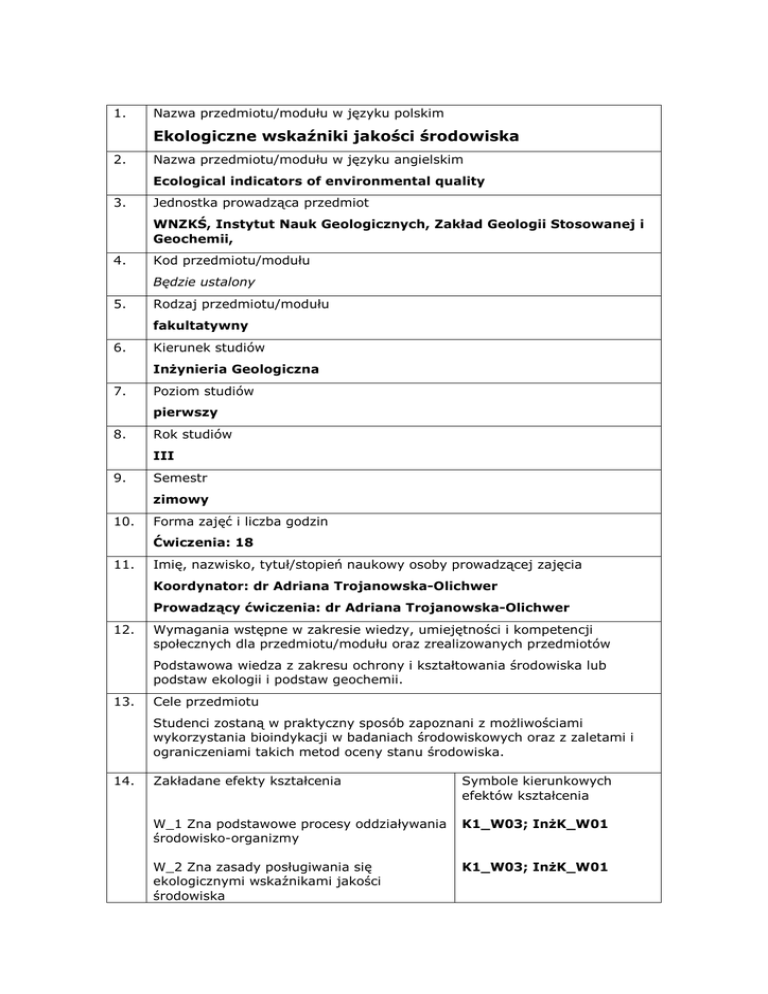 1. Nazwa przedmiotu/modułu w języku polskim Ekologiczne wskaźniki jakości środowiska 2. Nazwa przedmiotu/modułu w języku angielskim Ecological indicators of environmental quality 3. Jednostka prowadząca przedmiot WNZKŚ, Instytut Nauk Geologicznych, Zakład Geologii Stosowanej i Geochemii, 4. Kod przedmiotu/modułu Będzie ustalony 5. Rodzaj przedmiotu/modułu fakultatywny 6. Kierunek studiów Inżynieria Geologiczna 7. Poziom studiów pierwszy 8. Rok studiów III 9. Semestr zimowy 10. Forma zajęć i liczba godzin Ćwiczenia: 18 11. Imię, nazwisko, tytuł/stopień naukowy osoby prowadzącej zajęcia Koordynator: dr Adriana Trojanowska-Olichwer Prowadzący ćwiczenia: dr Adriana Trojanowska-Olichwer 12. Wymagania wstępne w zakresie wiedzy, umiejętności i kompetencji społecznych dla przedmiotu/modułu oraz zrealizowanych przedmiotów Podstawowa wiedza z zakresu ochrony i kształtowania środowiska lub podstaw ekologii i podstaw geochemii. 13. Cele przedmiotu Studenci zostaną w praktyczny sposób zapoznani z możliwościami wykorzystania bioindykacji w badaniach środowiskowych oraz z zaletami i ograniczeniami takich metod oceny stanu środowiska. 14. Zakładane efekty kształcenia Symbole kierunkowych efektów kształcenia W_1 Zna podstawowe procesy oddziaływania środowisko-organizmy K1_W03; InżK_W01 W_2 Zna zasady posługiwania się ekologicznymi wskaźnikami jakości środowiska K1_W03; InżK_W01 15. U_1 Potrafi wykonać podstawowe pomiary laboratoryjne i terenowe K1_U06 K_1 Potrafi pracować w zespole, w trakcie zajęć terenowych i laboratoryjnych Treści programowe K1_K01 Ćwiczenia: Samodzielne obserwacje po wprowadzeniu teoretycznym: Bioindykacja, cechy bioindykatorów, zasady doboru bioindykatorów. Ekotesty toksyczności - testy zanieczyszczenia gleby z wykorzystaniem nasion Porosty jako wskaźniki stanu zanieczyszczenia powietrza atmosferycznego; metoda gatunków wskaźnikowych – skala porostowa. Geobotaniczne indykatory jakości gleb i gruntów Grupy bioindykatorów stosowane w monitoringu wód: indeksy okrzemkowy, makrofitowy, bentosowy, wskaźnik TSI. Monitoring geoekosystemów w Polsce. 16. Zalecana literatura Literatura podstawowa: Szoszkiewicz K., Zgoła T., Jusik Sz., Hryc-Jusik B., Dawson F.H., Raven P., 2012, Hydromorfologiczna ocena wód płynących. Podręcznik do badań terenowych według metody River Habitat Survey w warunkach Polski, Bogucki Wydawnictwo Naukowe, Poznań. Błachuta J., Jarząbek A., Kokoszka R., Sarna S., 2006. Weryfikacja wskaźników dla przeprowadzenia oceny stanu ilościowego i morfologicznego jednolitych części wód powierzchniowych wraz ze zmianą ich wartości progowych dla uściślenia wstępnego wyznaczenia silnie zmienionych części wód. KZGW Warszawa K. Czyżewska., W. Fałtynowicz, Monitoring przyrody ożywionej-porosty. [W:] Czyżewska K. (red.) Różnorodność biologiczna porostów. Wydawnictwo Uniwersytetu Łódzkiego, Łódź,1998 Tylkowski J., 2013. Stan geoekosystemów Polski w roku 2012 na podstawie badań Zintegrowanego Monitoringu Środowiska Przyrodniczego. IOŚ Literatura uzupełniająca: 17. "Biologiczne metody oceny jakości wód rzecznych", wyd. Kosmos. Problemy Nauk Biologicznych, t.53, nr 2(263), s.183-191. Forma zaliczenia poszczególnych komponentów przedmiotu/modułu, sposób sprawdzenia osiągnięcia zamierzonych efektów kształcenia: Ćwiczenia: obecność na zajęciach i zaliczenie sprawozdań pisemnych – uzyskanie łącznie co najmniej 50% punktów W_1, W_2, U_1, K_1 18. Język wykładowy Polski 19. Obciążenie pracą studenta: Forma aktywności studenta Średnia liczba godzin na zrealizowanie aktywności Godziny zajęć (wg planu studiów) z nauczycielem: - ćwiczenia: 18 20 - konsultacje: 2 Praca własna studenta np.: - przygotowanie do zajęć: 6 - czytanie wskazanej literatury: 6 30 - napisanie raportu z zajęć: 10 - przygotowanie do zaliczenia: 8 Suma godzin Liczba punktów ECTS 50 2