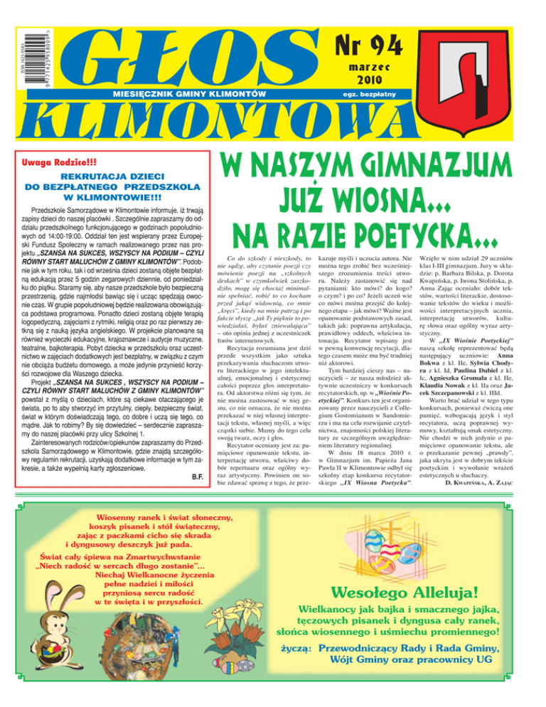 9 771425 958009 > ISSN 1425-9583 GŁOS Nr 94 marzec 2010 KLIMONTOWA MIESIĘCZNIK GMINY KLIMONTÓW Uwaga Rodzice!!! REKRUTACJA DZIECI DO BEZPŁATNEGO PRZEDSZKOLA W KLIMONTOWIE!!! Przedszkole Samorządowe w Klimontowie informuje, iż trwają zapisy dzieci do naszej placówki . Szczególnie zapraszamy do oddziału przedszkolnego funkcjonującego w godzinach popołudniowych od 14:00-19:00. Oddział ten jest wspierany przez Europejski Fundusz Społeczny w ramach realizowanego przez nas projektu „SZANSA NA SUKCES, WSZYSCY NA PODIUM – CZYLI RÓWNY START MALUCHÓW Z GMINY KLIMONTÓW”. Podobnie jak w tym roku, tak i od września dzieci zostaną objęte bezpłatną edukacją przez 5 godzin zegarowych dziennie, od poniedziałku do piątku. Staramy się, aby nasze przedszkole było bezpieczną przestrzenią, gdzie najmłodsi bawiąc się i ucząc spędzają owocnie czas. W grupie popołudniowej będzie realizowana obowiązująca podstawa programowa. Ponadto dzieci zostaną objęte terapią logopedyczną, zajęciami z rytmiki, religią oraz po raz pierwszy zetkną się z nauką języka angielskiego. W projekcie planowane są również wycieczki edukacyjne, krajoznawcze i audycje muzyczne, teatralne, bajkoterapia. Pobyt dziecka w przedszkolu oraz uczestnictwo w zajęciach dodatkowych jest bezpłatny, w związku z czym nie obciąża budżetu domowego, a może jedynie przynieść korzyści rozwojowe dla Waszego dziecka. Projekt „SZANSA NA SUKCES , WSZYSCY NA PODIUM – CZYLI RÓWNY START MALUCHÓW Z GMINY KLIMONTÓW” powstał z myślą o dzieciach, które są ciekawe otaczającego je świata, po to aby stworzyć im przytulny, ciepły, bezpieczny świat, świat w którym doświadczają tego, co dobre i uczą się tego, co mądre. Jak to robimy? By się dowiedzieć – serdecznie zapraszamy do naszej placówki przy ulicy Szkolnej 1. Zainteresowanych rodziców/opiekunów zapraszamy do Przedszkola Samorządowego w Klimontowie, gdzie znajdą szczegółowy regulamin rekrutacji, uzyskają dodatkowe informacje w tym zakresie, a także wypełnią karty zgłoszeniowe. B.F. egz. bezpłatny W NASZYM GIMNAZJUM JUŻ WIOSNA… NA RAZIE POETYCKA… Co do szkody i nieszkody, to nie sądzę, aby czytanie poezji czy mówienie poezji na „szkolnych deskach” w czymkolwiek zaszkodziło, mogę się chociaż minimalnie spełniać, robić to co kocham przed jakąś widownią, co mnie „kręci”, kiedy na mnie patrzą i po fakcie słyszę „jak Ty pięknie to powiedziałaś, byłaś zniewalająca” – oto opinia jednej z uczestniczek forów internetowych. Recytacja rozumiana jest dziś przede wszystkim jako sztuka przekazywania słuchaczom utworu literackiego w jego intelektualnej, emocjonalnej i estetycznej całości poprzez głos interpretatora. Od aktorstwa różni się tym, że nie można zastosować w niej gestu, co nie oznacza, że nie można przekazać w niej własnej interpretacji tekstu, własnej myśli, a więc cząstki siebie. Mamy do tego celu swoją twarz, oczy i głos. Recytator oceniany jest za: pamięciowe opanowanie tekstu, interpretację utworu, właściwy dobór repertuaru oraz ogólny wyraz artystyczny. Powinien on sobie zdawać sprawę z tego, że prze- kazuje myśli i uczucia autora. Nie można tego zrobić bez wcześniejszego zrozumienia treści utworu. Należy zastanowić się nad pytaniami: kto mówi? do kogo? o czym? i po co? Jeżeli uczeń wie co mówi można przejść do kolejnego etapu – jak mówi? Ważne jest opanowanie podstawowych zasad, takich jak: poprawna artykulacja, prawidłowy oddech, właściwa intonacja. Recytator wpisany jest w pewną konwencję recytacji, dlatego czasem może mu być trudniej niż aktorowi. Tym bardziej cieszy nas – nauczycieli – że nasza młodzież aktywnie uczestniczy w konkursach recytatorskich, np. w „Wiośnie Poetyckiej”. Konkurs ten jest organizowany przez nauczycieli z Collegium Gostomianum w Sandomierzu i ma na celu rozwijanie czytelnictwa, znajomości polskiej literatury ze szczególnym uwzględnieniem literatury regionalnej. W dniu 18 marca 2010 r. w Gimnazjum im. Papieża Jana Pawła II w Klimontowie odbył się szkolny etap konkursu recytatorskiego „IX Wiosna Poetycka”. Wzięło w nim udział 29 uczniów klas I-III gimnazjum. Jury w składzie: p. Barbara Bilska, p. Dorota Kwapińska, p. Iwona Stolińska, p. Anna Zając oceniało: dobór tekstów, wartości literackie, dostosowanie tekstów do wieku i możliwości interpretacyjnych ucznia, interpretację utworów, kulturę słowa oraz ogólny wyraz artystyczny. W „IX Wiośnie Poetyckiej” naszą szkołę reprezentować będą następujący uczniowie: Anna Bokwa z kl. IIe, Sylwia Chodyra z kl. Id, Paulina Dubiel z kl. Ic, Agnieszka Gromala z kl. IIe, Klaudia Nowak z kl. IIa oraz Jacek Szczepanowski z kl. IIId. Warto brać udział w tego typu konkursach, ponieważ ćwiczą one pamięć, wzbogacają język i styl recytatora, uczą poprawnej wymowy, kształtują smak estetyczny. Nie chodzi w nich jedynie o pamięciowe opanowanie tekstu, ale o przekazanie pewnej „prawdy”, jaka ukryta jest w dobrym tekście poetyckim i wywołanie wrażeń estetycznych u słuchaczy. D. KWAPIŃSKA, A. ZAJĄC Wiosenny ranek i świat słoneczny, koszyk pisanek i stół świąteczny, zając z paczkami cicho się skrada i dyngusowy deszczyk już pada. Świat cały śpiewa na Zmartwychwstanie „Niech radość w sercach długo zostanie”... Niechaj Wielkanocne życzenia pełne nadziei i miłości przyniosą sercu radość w te święta i w przyszłości. Wesołego Alleluja Alleluja! Wielkanocy jak bajka i smacznego jajka, tęczowych pisanek i dyngusa cały ranek, słońca wiosennego i uśmiechu promiennego! życzą: Przewodniczący Rady i Rada Gminy, Wójt Gminy oraz pracownicy UG GŁOS KLIMONTOWA OSP 2 KALENDARIUM KLIMONTÓW • w lutym i marcu strażacy interweniowali w ok. 14 akcjach związanych z podtopieniami, przyczyną tego były topniejące śniegi i podchodząca woda, strażacy na terenie c