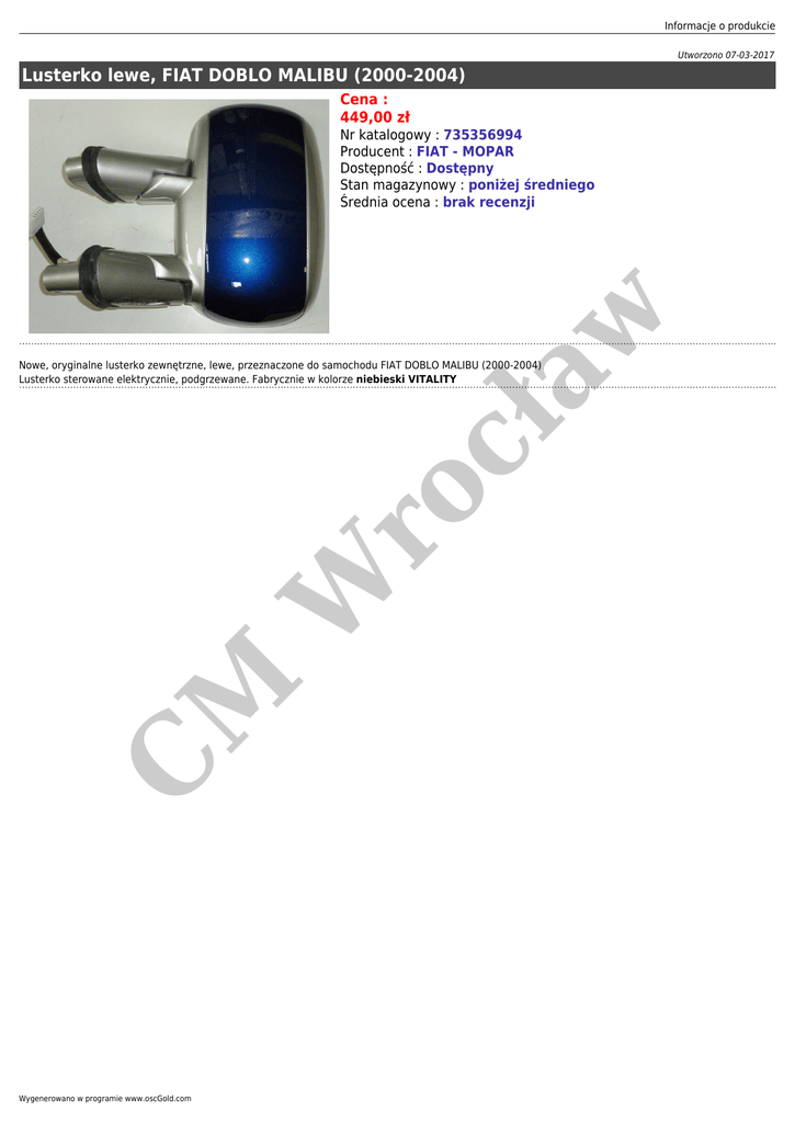 Informacje o produkcie Utworzono 07-03-2017 Lusterko lewe, FIAT DOBLO MALIBU (2000-2004) Cena : 449,00 zł cł aw Nr katalogowy : 735356994 Producent : FIAT - MOPAR Dostępność : Dostępny Stan magazynowy : poniżej średniego Średnia ocena : brak recenzji C M W ro Nowe, oryginalne lusterko zewnętrzne, lewe, przeznaczone do samochodu FIAT DOBLO MALIBU (2000-2004) Lusterko sterowane elektrycznie, podgrzewane. Fabrycznie w kolorze niebieski VITALITY Wygenerowano w programie www.oscGold.com