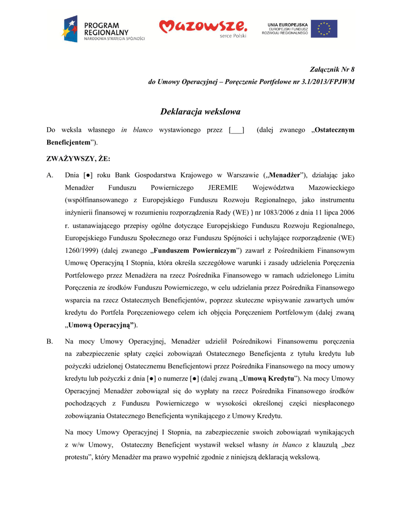 Załącznik Nr 8 do Umowy Operacyjnej – Poręczenie Portfelowe nr 3.1/2013/FPJWM Deklaracja wekslowa Do weksla własnego in blanco wystawionego przez [___] (dalej zwanego „Ostatecznym Beneficjentem”). ZWAŻYWSZY, ŻE: A. Dnia [●] roku Bank Gospodarstwa Krajowego w Warszawie („Menadżer”), działając jako Menadżer Funduszu Powierniczego JEREMIE Województwa Mazowieckiego (współfinansowanego z Europejskiego Funduszu Rozwoju Regionalnego, jako instrumentu inżynierii finansowej w rozumieniu rozporządzenia Rady (WE) ) nr 1083/2006 z dnia 11 lipca 2006 r. ustanawiającego przepisy ogólne dotyczące Europejskiego Funduszu Rozwoju Regionalnego, Europejskiego Funduszu Społecznego oraz Funduszu Spójności i uchylające rozporządzenie (WE) 1260/1999) (dalej zwanego „Funduszem Powierniczym”) zawarł z Pośrednikiem Finansowym Umowę Operacyjną I Stopnia, która określa szczegółowe warunki i zasady udzielenia Poręczenia Portfelowego przez Menadżera na rzecz Pośrednika Finansowego w ramach udzielonego Limitu Poręczenia ze środków Funduszu Powierniczego, w celu udzielania przez Pośrednika Finansowego wsparcia na rzecz Ostatecznych Beneficjentów, poprzez skuteczne wpisywanie zawartych umów kredytu do Portfela Poręczeniowego celem ich objęcia Poręczeniem Portfelowym (dalej zwaną „Umową Operacyjną”). B. Na mocy Umowy Operacyjnej, Menadżer udzielił Pośrednikowi Finansowemu poręczenia na zabezpieczenie spłaty części zobowiązań Ostatecznego Beneficjenta z tytułu kredytu lub pożyczki udzielonej Ostatecznemu Beneficjentowi przez Pośrednika Finansowego na mocy umowy kredytu lub pożyczki z dnia [●] o numerze [●] (dalej zwaną „Umową Kredytu”). Na mocy Umowy Operacyjnej Menadżer zobowiązał się do wypłaty na rzecz Pośrednika Finansowego środków pochodzących z Funduszu Powierniczego w wysokości określonej części niespłaconego zobowiązania Ostatecznego Beneficjenta wynikającego z Umowy Kredytu. Na mocy Umowy Operacyjnej I Stopnia, na zabezpieczenie swoich zobowiązań wynikających z w/w Umowy, Ostateczny Beneficjent wystawił weksel własny in blanco z klauzulą „bez protestu”, który Menadżer ma prawo wypełnić zgodnie z niniejszą deklaracją wekslową. 1. Niniejszym jako Ostateczny Beneficjent w załączeniu składam do dyspozycji Menadżera weksel własny in blanco z klauzulą „bez protestu”, wystawiony jako zabezpieczenie zobowiązań Ostatecznego Beneficjenta wynikających z Umowy Zabezpieczenia Kredytu nr ______ zawartej pomiędzy Ostatecznym Beneficjentem, a Pośrednikiem Finansowym w dniu ____ roku (dalej zwane „Zobowiązaniem”). 2. W przypadku, gdy jakiekolwiek kwoty należne Menadżerowi z tytułu Zobowiązania nie zostaną spłacone pomimo upływu terminu ich wymagalności określonego w Umowie Kredytu lub Umowie Zabezpieczenia Kredytu, niniejszym upoważniam Menadżera lub inny podmiot uprawniony z Umowy Operacyjnej I Stopnia do wypełnienia weksla in blanco na sumę wekslową odpowiadającą kwocie niespłaconej należności z tytułu Zobowiązania, powiększonej o należne odsetki od dnia wymagalności Zobowiązania do dnia zapłaty oraz o koszty i wydatki związane z dochodzeniem należności z tytułu Zobowiązania. 3. Ponadto oświadczam, że Menadżer lub inny podmiot uprawniony z Umowy Operacyjnej I Stopnia ma prawo opatrzyć weksel według swojego uznania, miejscem i datą wystawienia oraz płatności, przy jednoczesnym zawiadomieniu mnie o dacie i miejscu wykupu weksla listem poleconym wysłanym co najmniej na 14 dni kalendarzowych przed terminem płatności weksla na adres: [___]. 4. Suma wekslowa będzie płatna na Rachunek Bankowy Funduszu Powierniczego wskazany w zawiadomieniu, o którym mowa w pkt. 3 powyżej. 5. Pośrednik Finansowy jest zobowiązany do przechowywania weksla, o którym mowa w pkt. 1 do czasu wygaśnięcia zobowiązania Ostatecznego Beneficjenta. 6. W przypadku spłaty wszystkich kwot należnych Funduszowi Powierniczemu na podstawie Poręczenia w terminach określonych w Umowie Operacyjnej, Pośrednik Finansowy, zwróci mi weksel in blanco, o którym mowa w pkt. 1 powyżej. _________________ /Podpis/ 2 WEKSEL WŁASNY ______________________ miejsce wystawienia _______________________ data wystawienia (w formacie: dd-miesiąc słownie-rrrr) Na _____________________ suma pieniężna Dnia__________________________________ zapłacę bez protestu za ten własny weksel na zlecenie data płatności _________________________________________________________________________ sumę _______________________________________________________________ złotych suma pieniężna słownie Płatny w __________________________________________________________________ miejsce płatności weksla pieczęć Wystawcy Czytelny podpis __________________________ ____________________________ Imię i nazwisko: __________________________ ____________________________ Stanowisko: ____________________________ __________________________ 3 Oświadczenia małżonka Wystawcy* Oświadczam, że wyrażam zgodę na zaciągnięcie powyższego zobowiązania oraz wystawienie powyższego weksla przez mojego małżonka ….…………………...……...…….. jako prawne zabezpieczenie poręczenia udzielonego przez Menadżera Funduszu Powierniczego. Niniejszym poręczam solidarnie za wszystkie zobowiązania ..................................................... ....................................................................................................................................................... (imię, nazwisko/nazwa, adres Wystawcy) legitymującego się dokumentem tożsamości .........................................................................* *, (nazwa i numer dokumentu tożsamości) zarejestrowanego w ................................................... pod numerem .....................................* *, z tytułu poręczenia udzielonego przez Menadżera Funduszu Powierniczego jako zabezpieczen