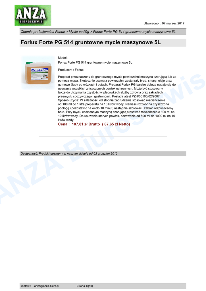 Utworzono : 07 marzec 2017 Chemia profesjonalna Forlux > Mycie podłóg > Forlux Forte PG 514 gruntowne mycie maszynowe 5L Forlux Forte PG 514 gruntowne mycie maszynowe 5L Model : Forlux Forte PG 514 gruntowne mycie maszynowe 5L s i w Producent : Forlux Preparat przeznaczony do gruntownego mycia powierzchni maszyna szorującą lub za pomocą mopa. Skutecznie usuwa z powierzchni zestarzały brud, smary, oleje oraz gumowe ślady po wózkach i butach. Preparat Forlux PG bardzo dobrze nadaje się do usuwania wszelkich zniszczonych powłok ochronnych. Może być stosowany także do utrzymania czystości w placówkach służby zdrowia oraz zakładach przemysłu spożywczego i gastronomii. Posiada atest PZH/00100/02/2007. Sposób użycia: W zależności od stopnia zabrudzenia stosować rozcieńczenie od 100 ml do 1 litra preparatu na 10 litrów wody. Nanieść roztwór na czyszczona podłogę i pozostawić na około 10 minut, następnie szorować i zebrać rozpuszczony brud. Przy myciu codziennym maszyną szorującą stosować rozcieńczenie 100 ml na 10 litrów wody. Do usuwania starych powłok, dozowanie od 500 ml do 1000 ml na 10 litrów wody. o r u r e s Cena : 107,81 zł Brutto ( 87,65 zł Netto) i B A Dostępność: Produkt dostępny w naszym sklepie od 03 grudzień 2012 Z N A kontakt : - [email protected] Strona 1/{nb}